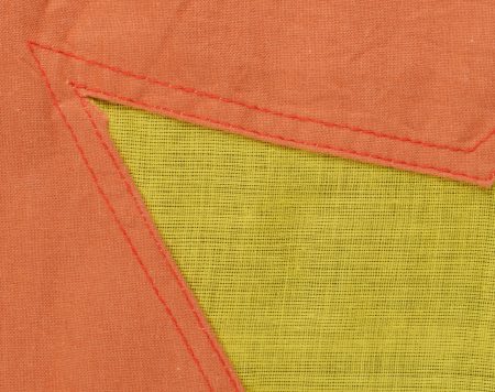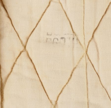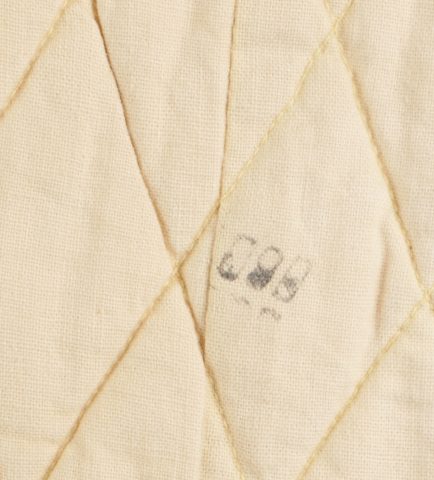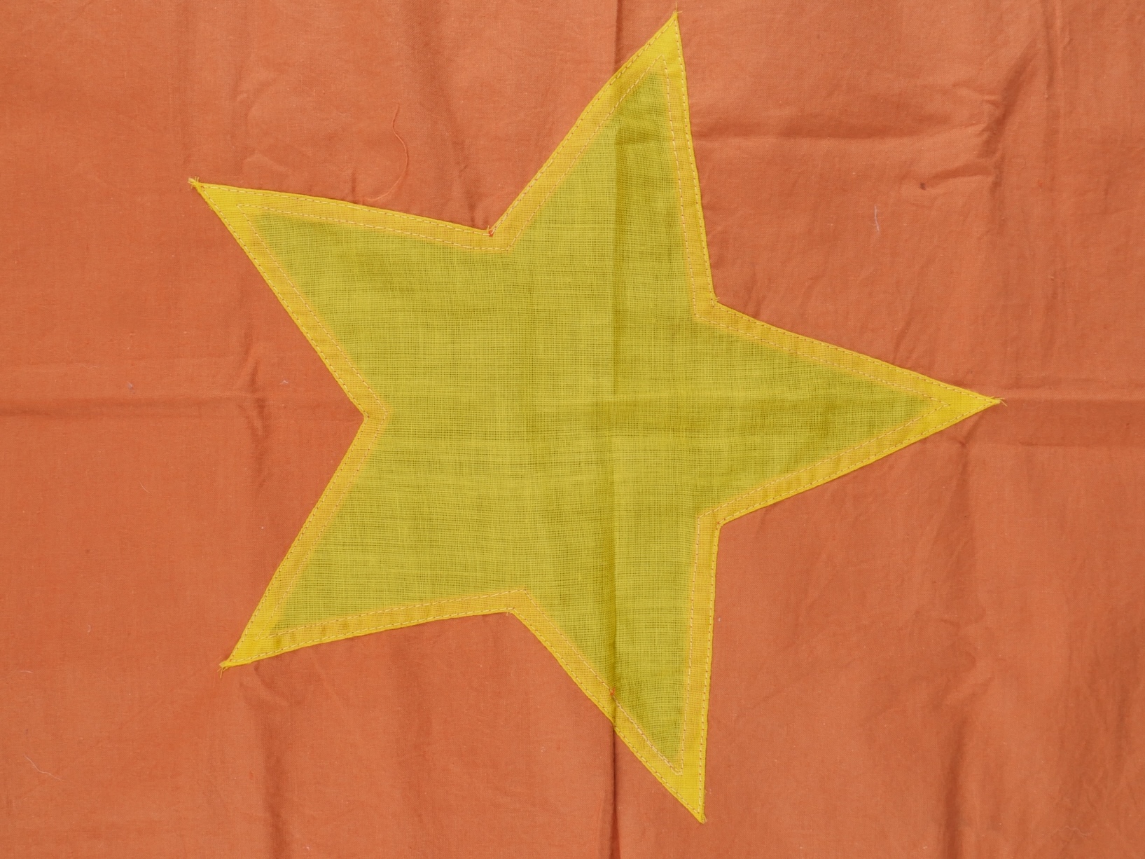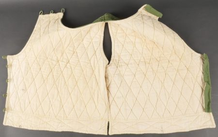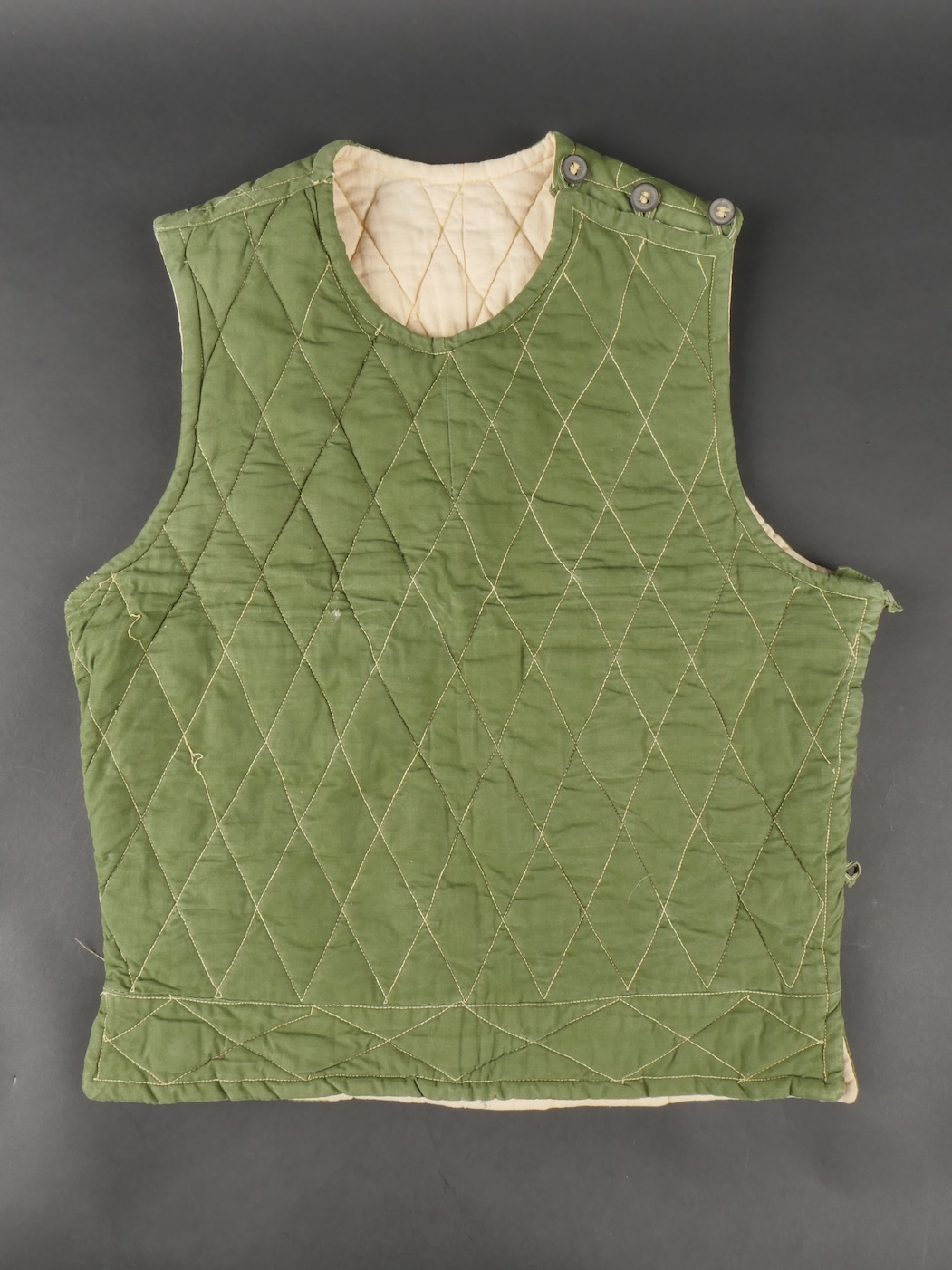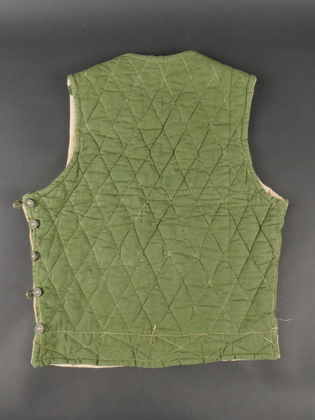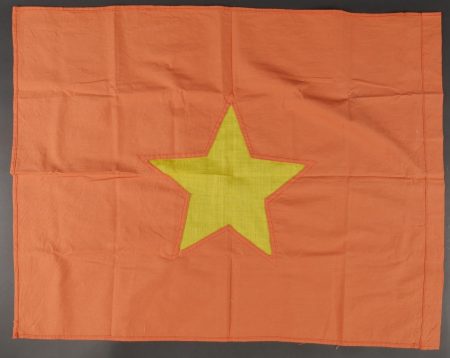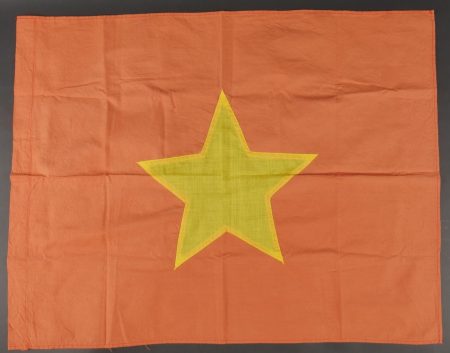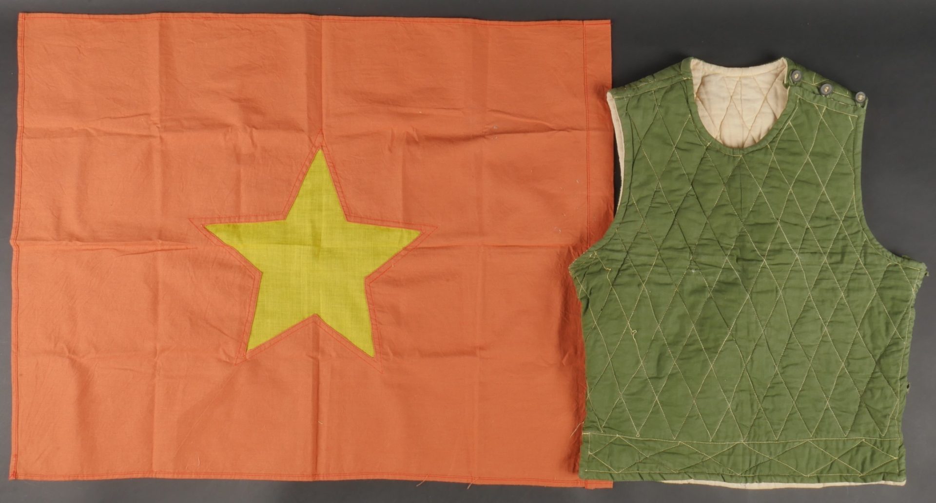 Ensemble d’équipements ViêtCong. Comprenant un gilet molletonné en toile verte confectionné en deux parties, cousu sur un côté et maintenu par trois et cinq boutons pour l’autre côté, coutures en losange, doublure en tissu écru. Fabrication postérieure à 1954. Un drapeau vietminh en coton rouge avec étoile rapportée en tissu jaune d’une seule pièce. Dimensions 70x56cm. Viet Cong equipment set. Includes a quilted jacket in green canvas made in two panels sewn on one side fastened by three and five buttons on the other side with diamond stitching and natural cloth lining. Post1954 manufacture. A Viet Minh flag in red cotton with singlepiece appliqued yellow star 70 x 56 cm.