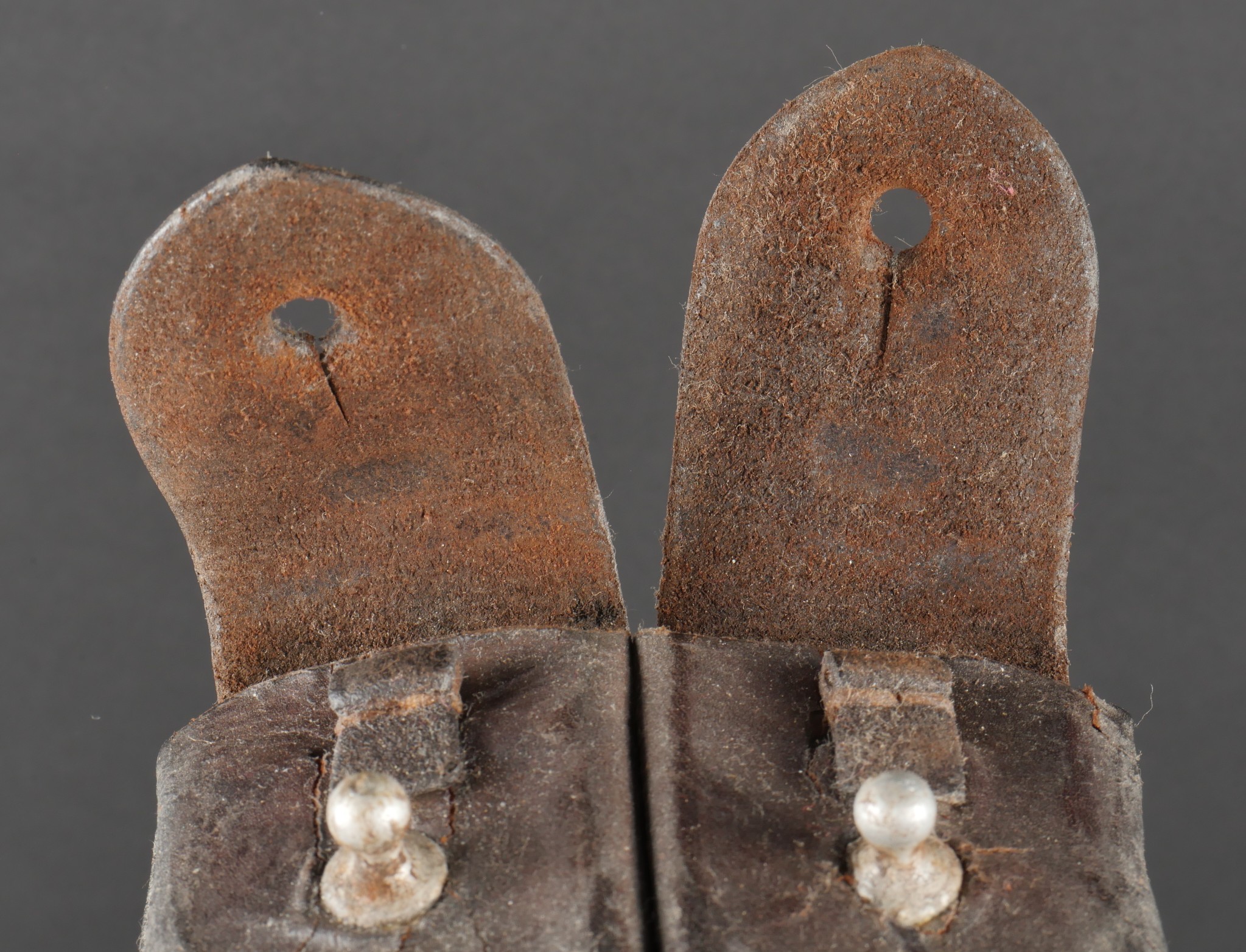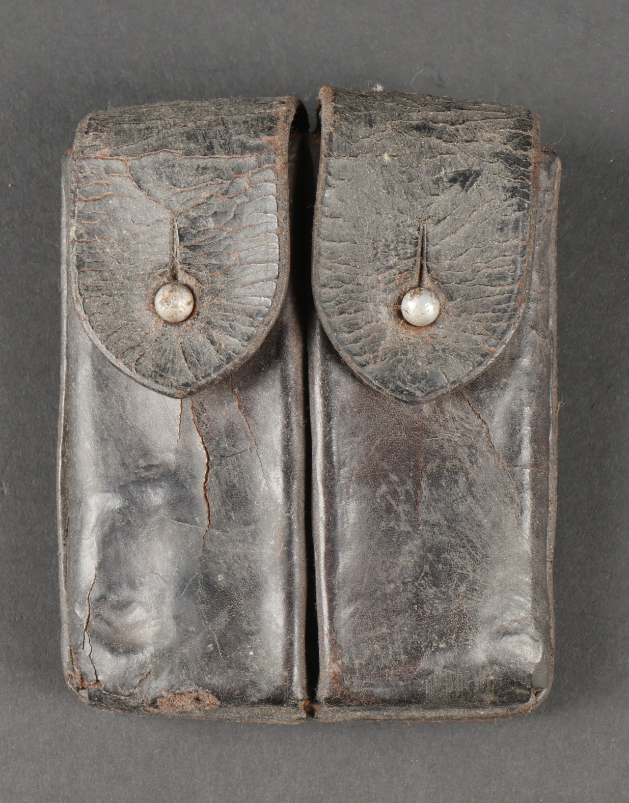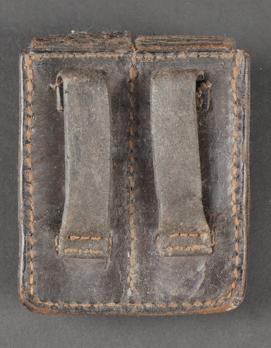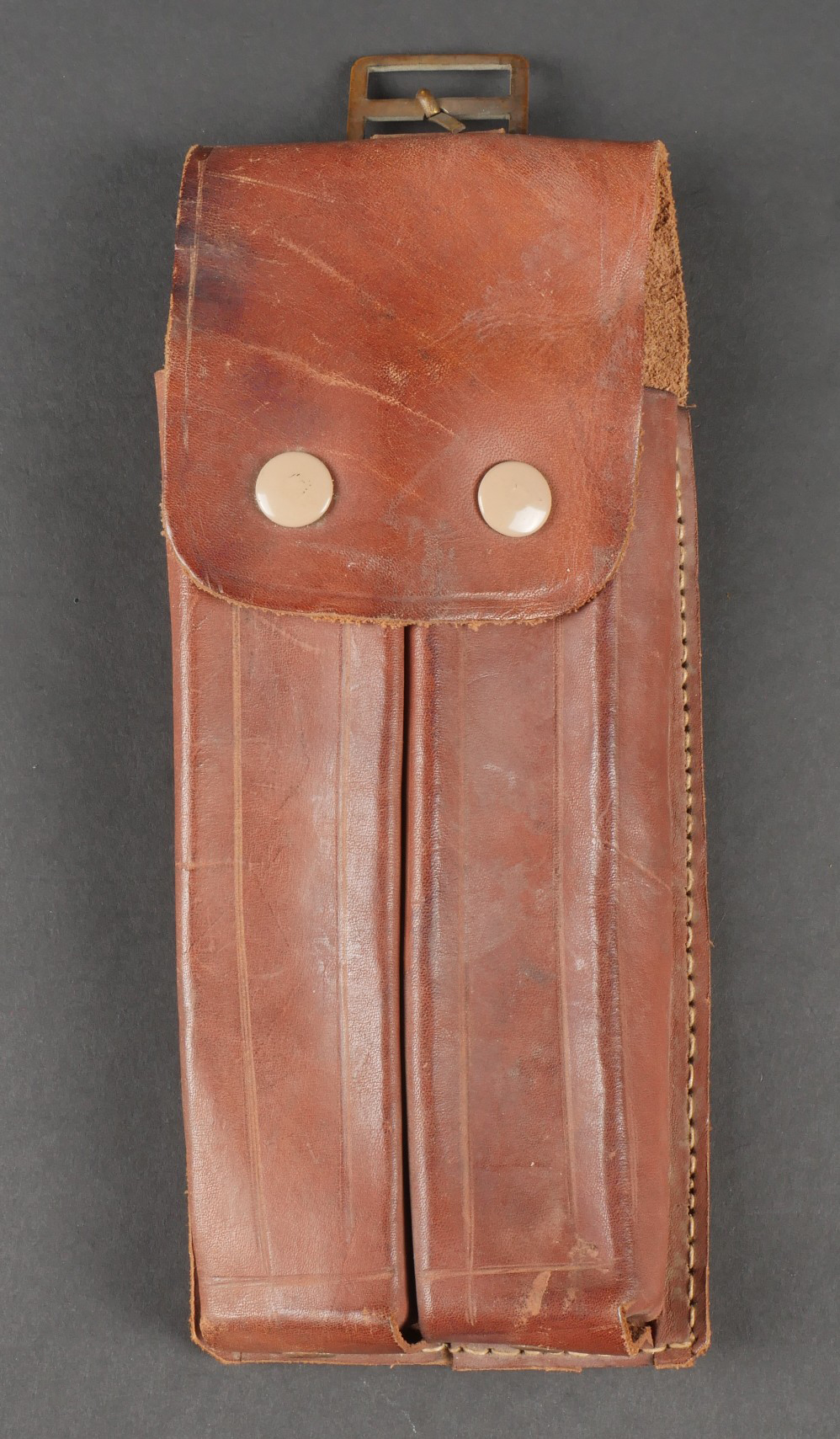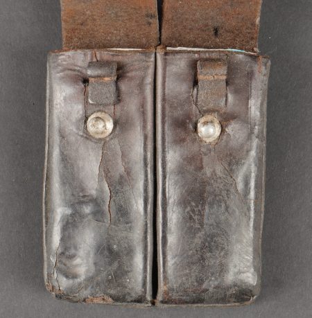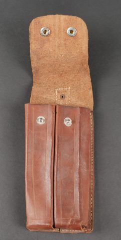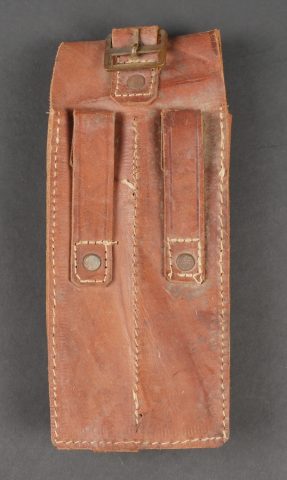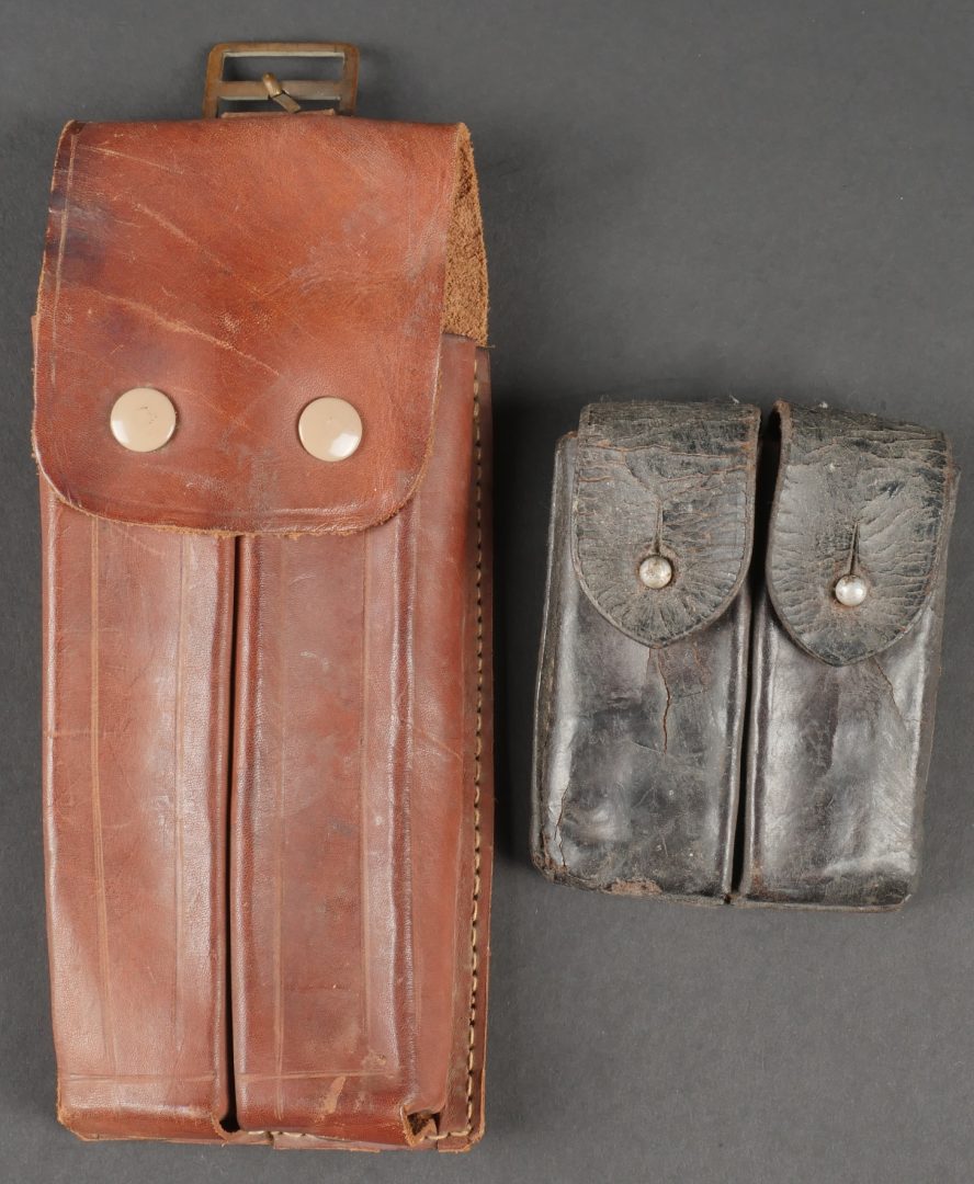 Ensemble comprenant un porte chargeurs de fabrication Allemande pour l’Armée Française, destiné à recevoir les chargeurs de MAS38. Entièrement confectionné en cuir, 2 passants de ceinturon rivetés, boucle de réglage en cuivre. Le rabat se ferme à l’aide de deux petits boutons pressions de marque SHB. On y joint un porte chargeurs en cuir pour Chicom type 54, copie du Tokarev de fabrication Chinoise qui équipa notamment l’Armée Nord Vietnamienne. Set including a Germanmade magazine pouch for French Army use designed for MAS38 magazines brown leather with two riveted belt loops copper adjusting buckle flap closed by two small SHB press studs with a Chinesemade leather magazine pouch for Chicom Type 54 Tokarev pistol used by the North Vietnamese Army.