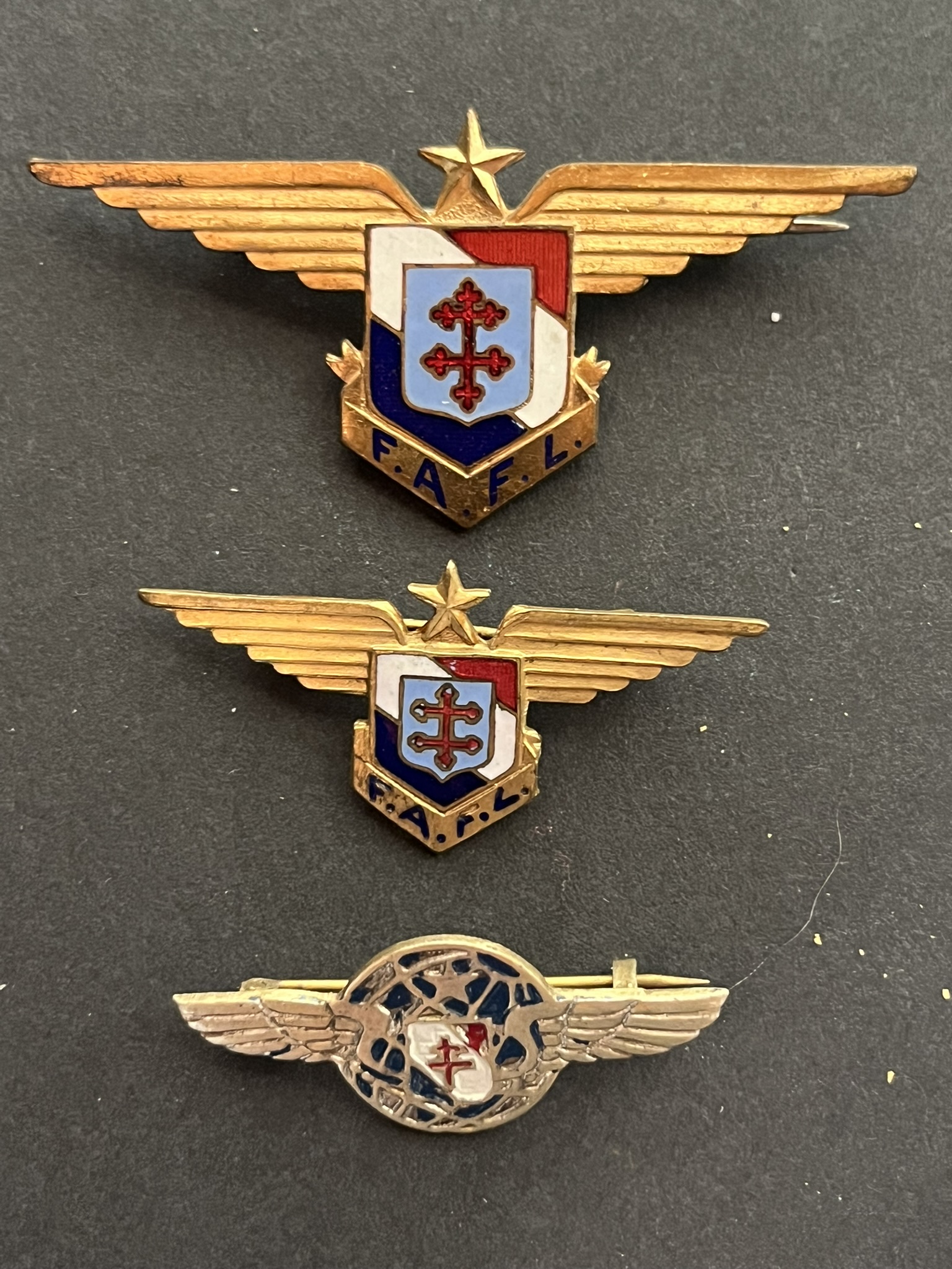 Lot 3 pièces , Insigne LAM fabrication locale peinte 39mm probalement en vermeil, insigne FAFL demie taille émaillé, insigne FAFL n°11459 fabrication de Londres. Lot of 3 pieces, Badge LAM... en savoir plus