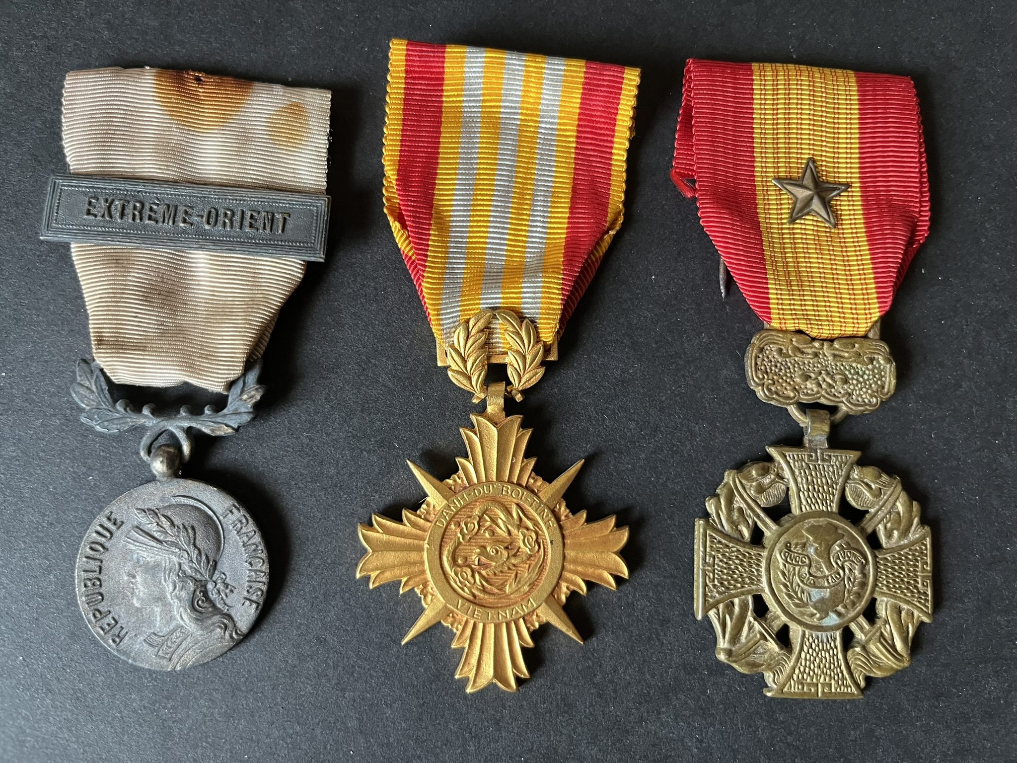 FRANCE Indochine , 3 pièces , médaille Coloniale 28mm avec agrafe Extrème,Orient, Croix de la Vaillance Vietnamienne , fabrication locale, médaille d’Honneur du Mérite du Vietnam classe... en savoir plus