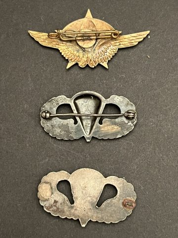 Lot de 3 pièces , 1 RCP métal jaune estampé à épingle peint (Mourgeon), brevet de parachutiste USA demi creux à épingle marqué Sterling, brevet de parachutiste USA plein poinçonné... en savoir plus