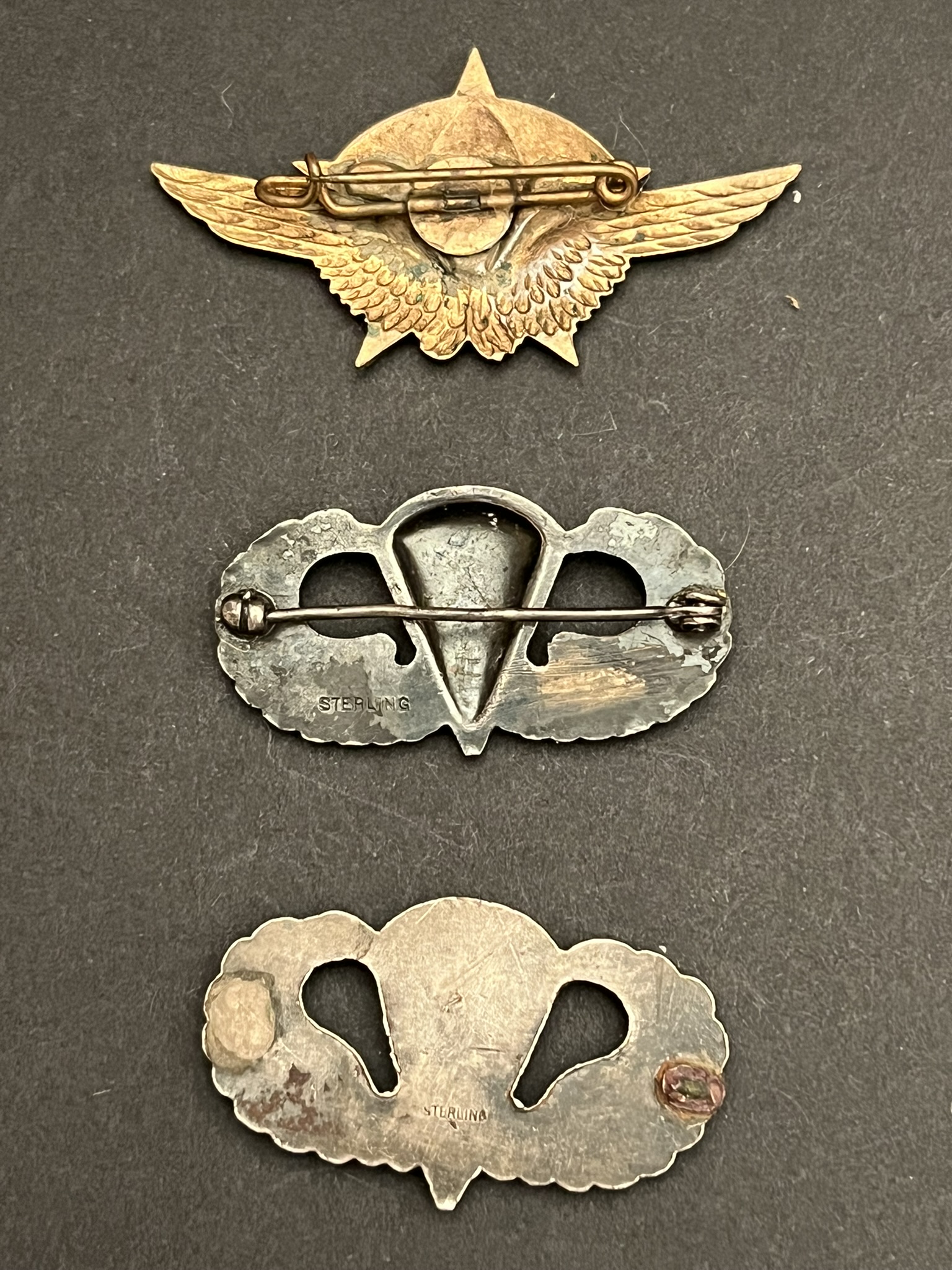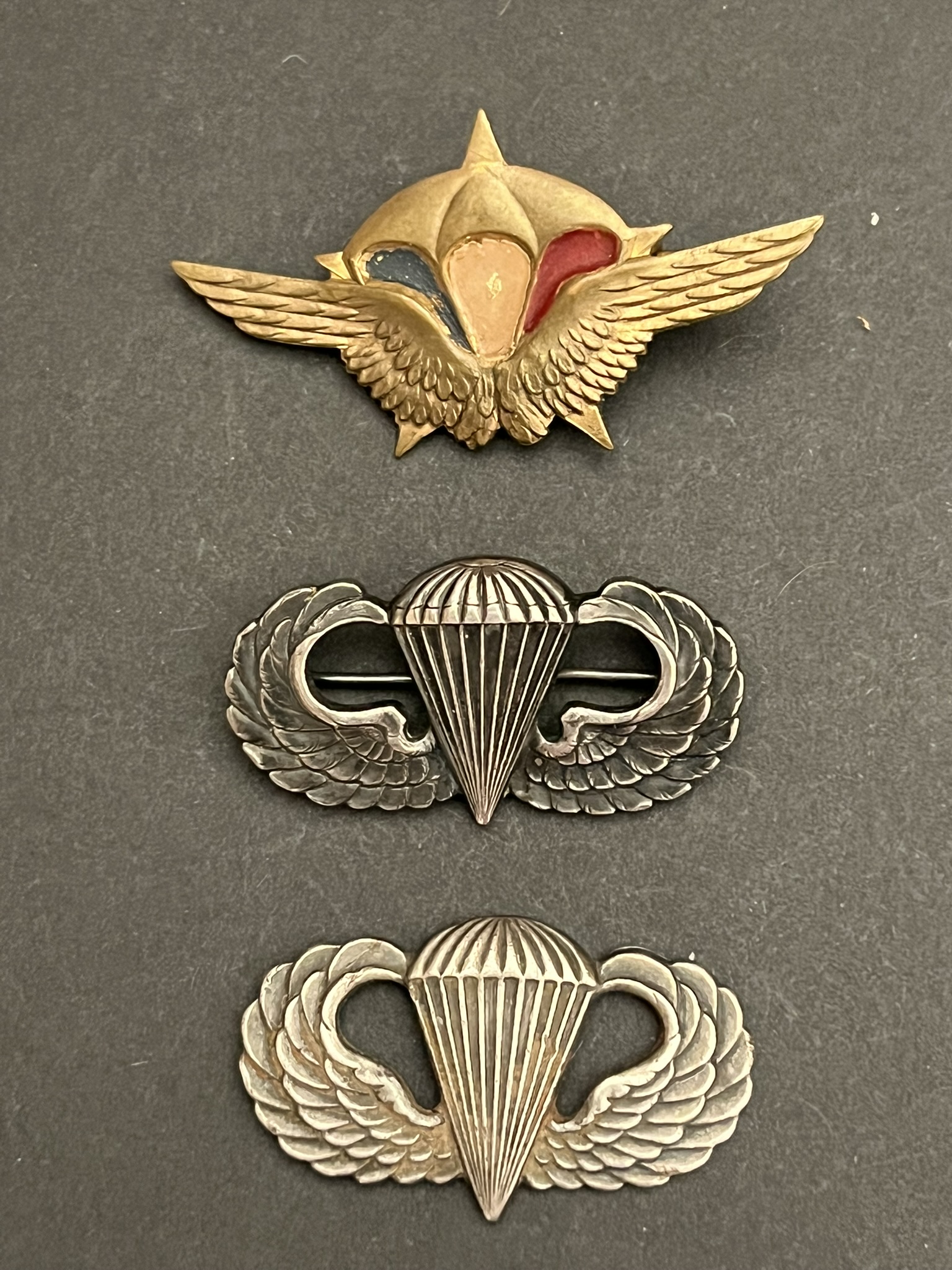 Lot de 3 pièces , 1 RCP métal jaune estampé à épingle peint (Mourgeon), brevet de parachutiste USA demi creux à épingle marqué Sterling, brevet de parachutiste USA plein poinçonné... en savoir plus