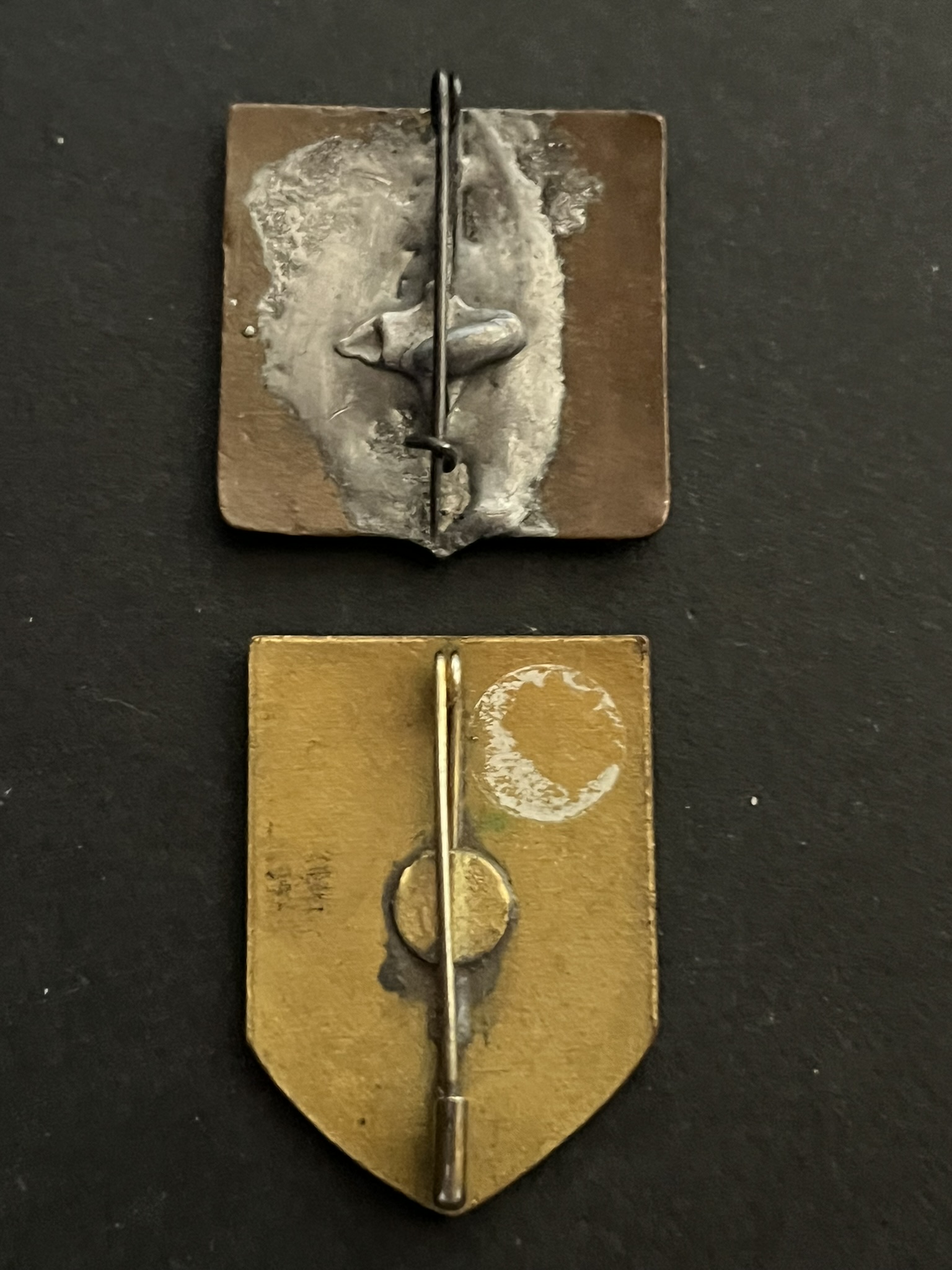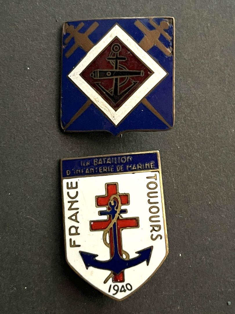 Lot de 2 pièces , Insigne du 1 RAC émaillé fabrication du Caire , épingle resoudée, insigne du 1 BIM émaillé fabrication T. Bichay du Caire. Lot of 2 pieces, badge of the 1st RAC enameled... en savoir plus