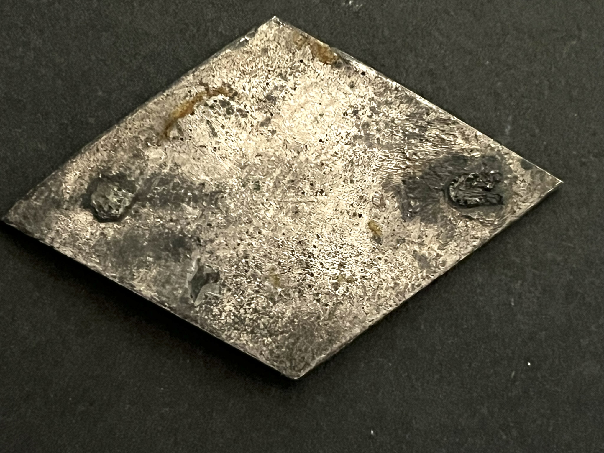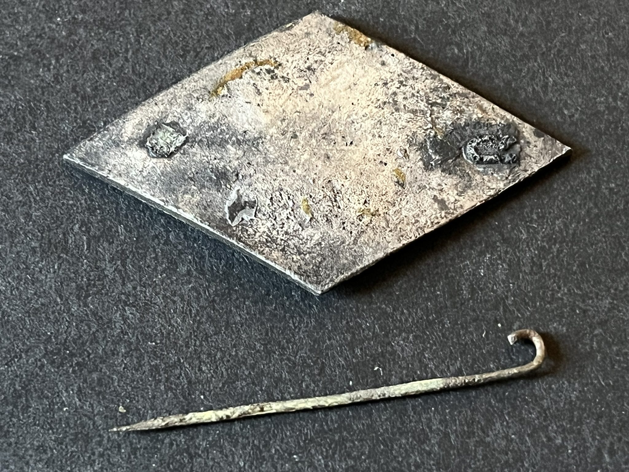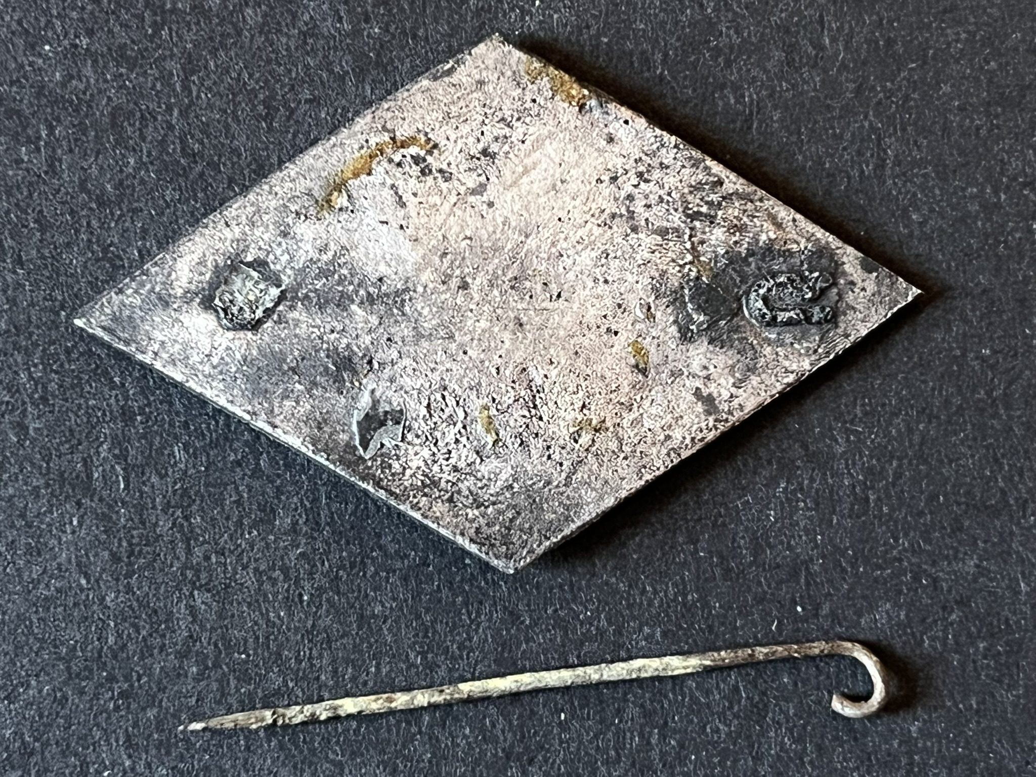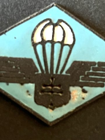 Insigne de la 1 Compagnie de Chasseurs Parachutistes dit Losange de Bergé métal blanc émaillé 53 x 39,5 mm porté, légèrement voilé, aiguille détachée mais présente , crochet absent,... en savoir plus