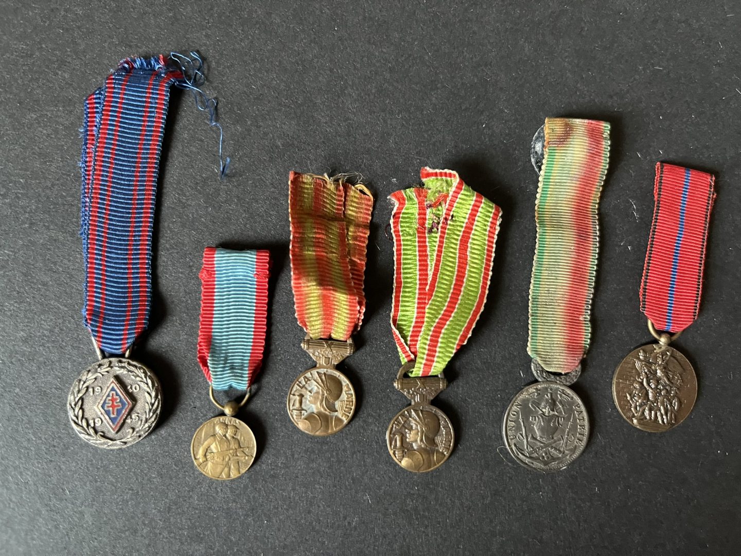 FRANCE , 6 pièces , lot de miniatures comprenant 2 médailles de la Marne, médaille d’Arras, médaille de la 1ère DFL, Association des Anciens Officiers, médaille uniface avec la Marseillaise. FRANCE, 6 pieces, set of miniatures including 2 Marne medals, Arras medal, 1st Free French Division medal, Association of Former Officers, uniface medal featuring La Marseillaise