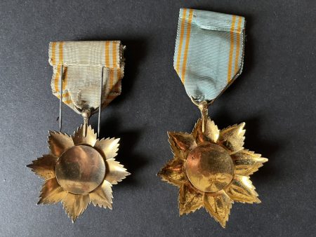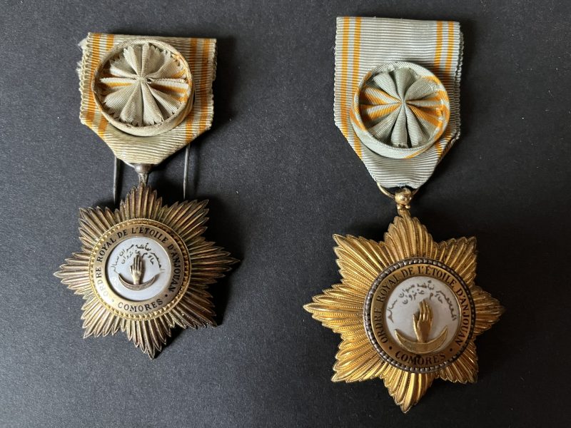 FRANCE Colonies , 2 pièces , 2 étoiles d’officier de l’ordre d’Etoile d’Anjouan , une en vermeil et une en métal doré. FRANCE Colonies, 2 pieces, 2 officer stars of the Order of the Star of Anjouan, one in vermeil and one in gilt metal