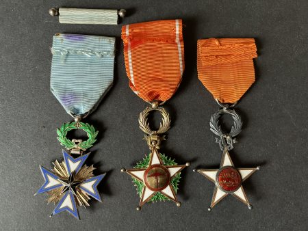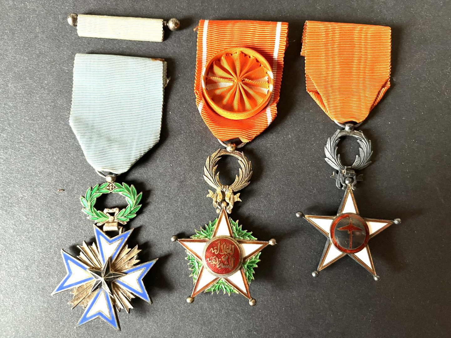 FRANCE Colonies , 3 pièces , chevalier de l’ordre de l’Etoile Noire du Bénin en argent avec son dixmude, chevalier de l’ordre du Ouissam Alaouite en argent avec ruban orange avant 1934, officler de l’ordre du Ouissam Alaouite en argent avec ruban de 1934. FRANCE Colonies, 3 pieces, Knight of the Order of the Black Star of Benin in silver with its Dixmude clasp, Knight of the Order of Ouissam Alaouite in silver with orange ribbon pre-1934, Officer of the Order of Ouissam Alaouite in silver with 1934 ribbon