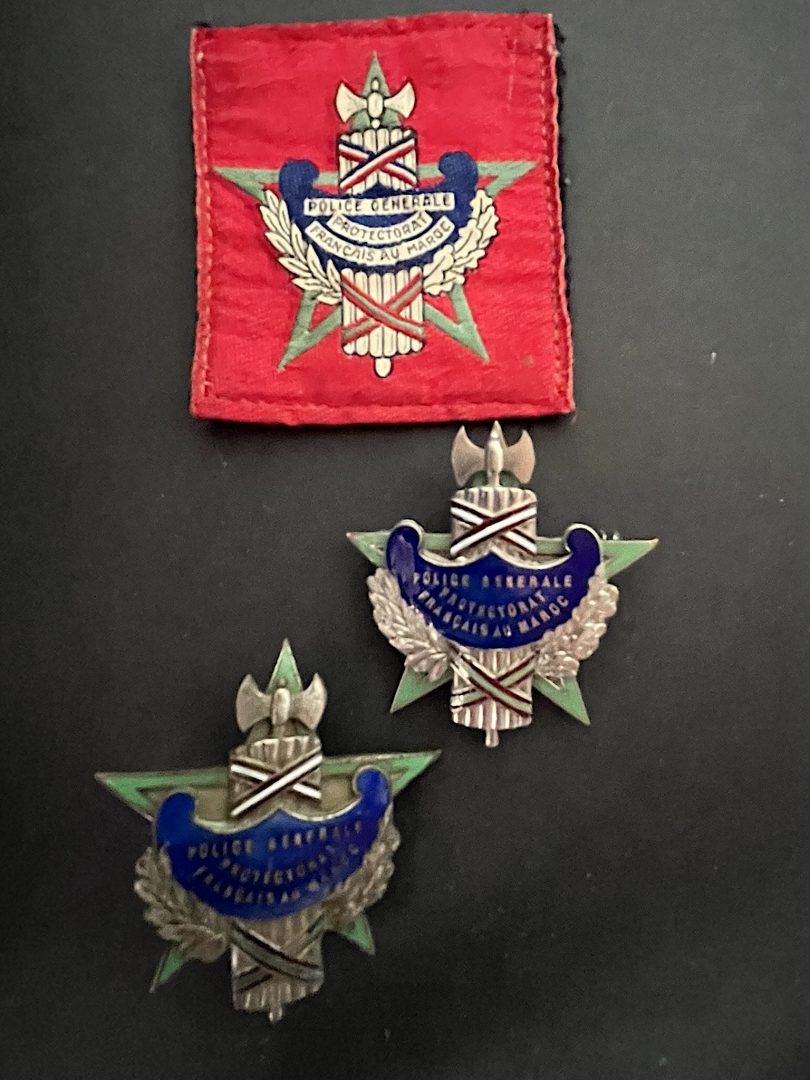 Lot de 3 pièces , Insigne émaillé Police Générale Protectorat Français du MAROC numéroté 2037 avec épingle à bascule, le même non numéroté avec pattes de fixation, le même en tissu... en savoir plus