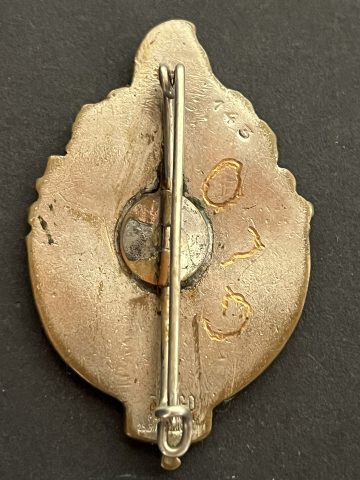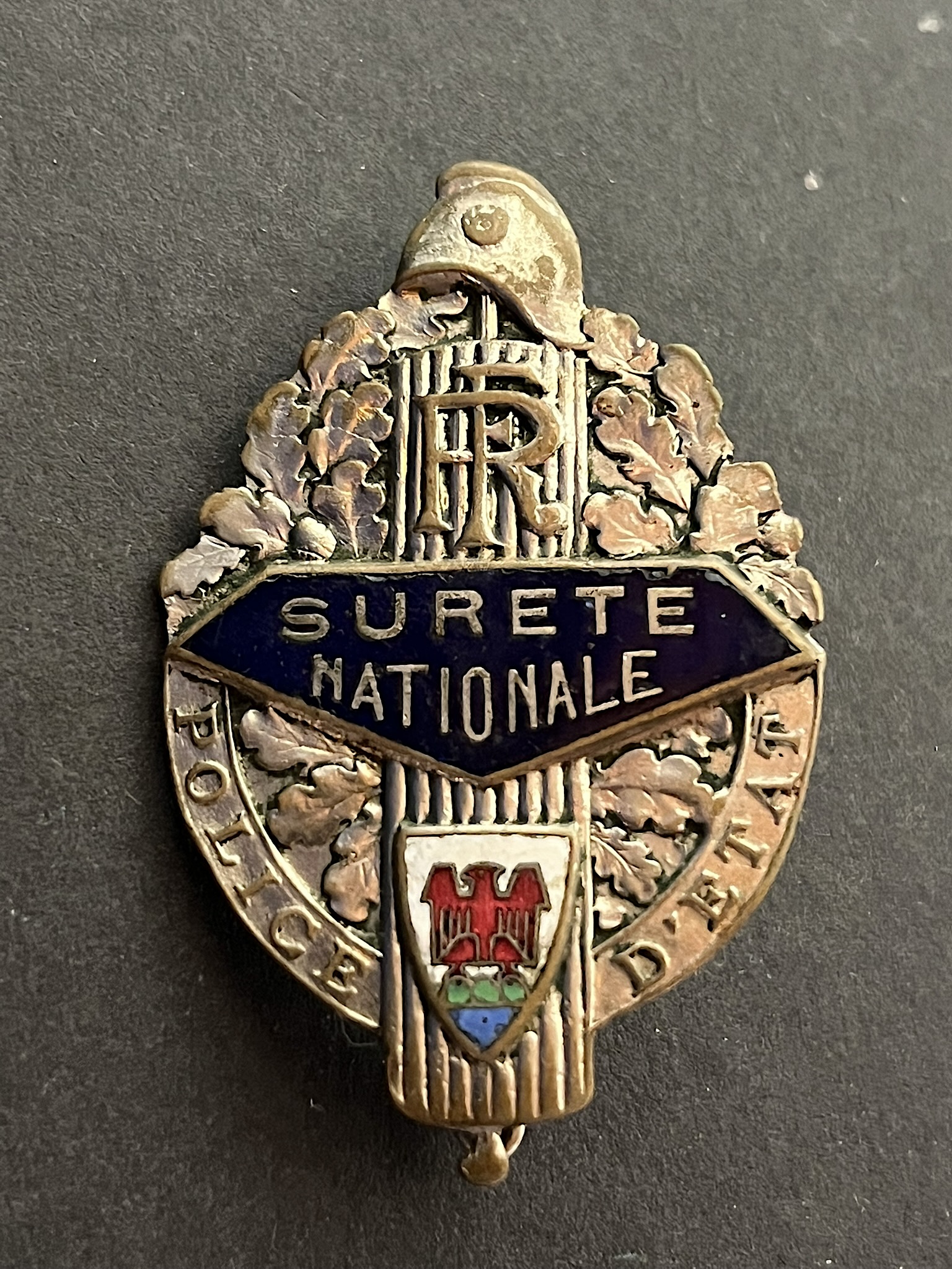 Insigne pour officiers en civil ‘patate’ de la Sureté Nationale Police d’Etat de NICE émaillée argentée numérotée 143, gravé GLO au revers. Badge for plainclothes officers “Patate” of the National Security State Police Nice enameled silvered numbered 143, engraved GLO on reverse