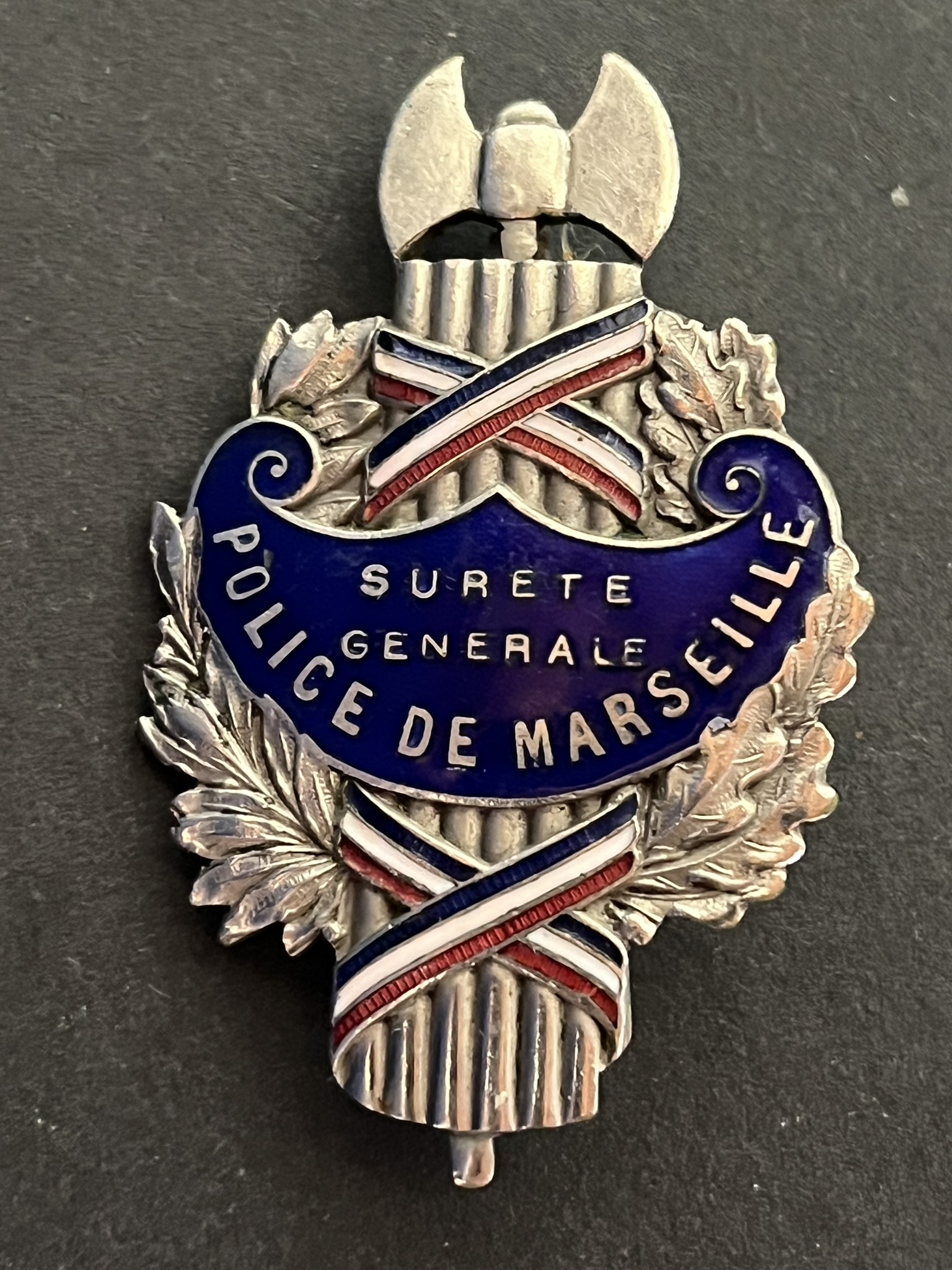 Insigne pour officiers en civil ‘patate’ de la Sureté Générale Police de MARSEILLE émaillée argentée numérotée 527 , attache probablement remplacée. Badge for plainclothes... en savoir plus