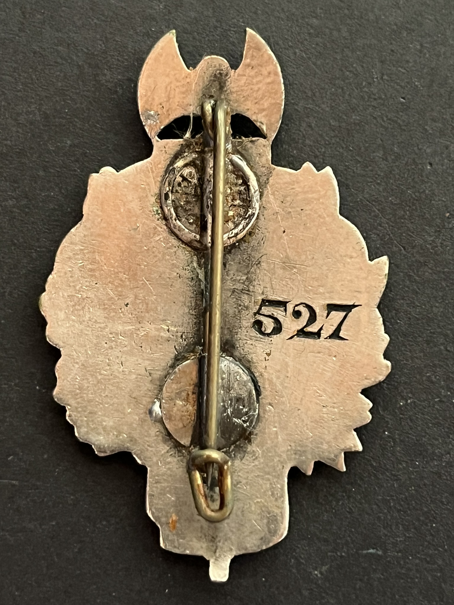 Insigne pour officiers en civil ‘patate’ de la Sureté Générale Police de MARSEILLE émaillée argentée numérotée 527 , attache probablement remplacée. Badge for plainclothes officers “Patate” of the General Security Police Marseille enameled silvered numbered 527, pin likely replaced