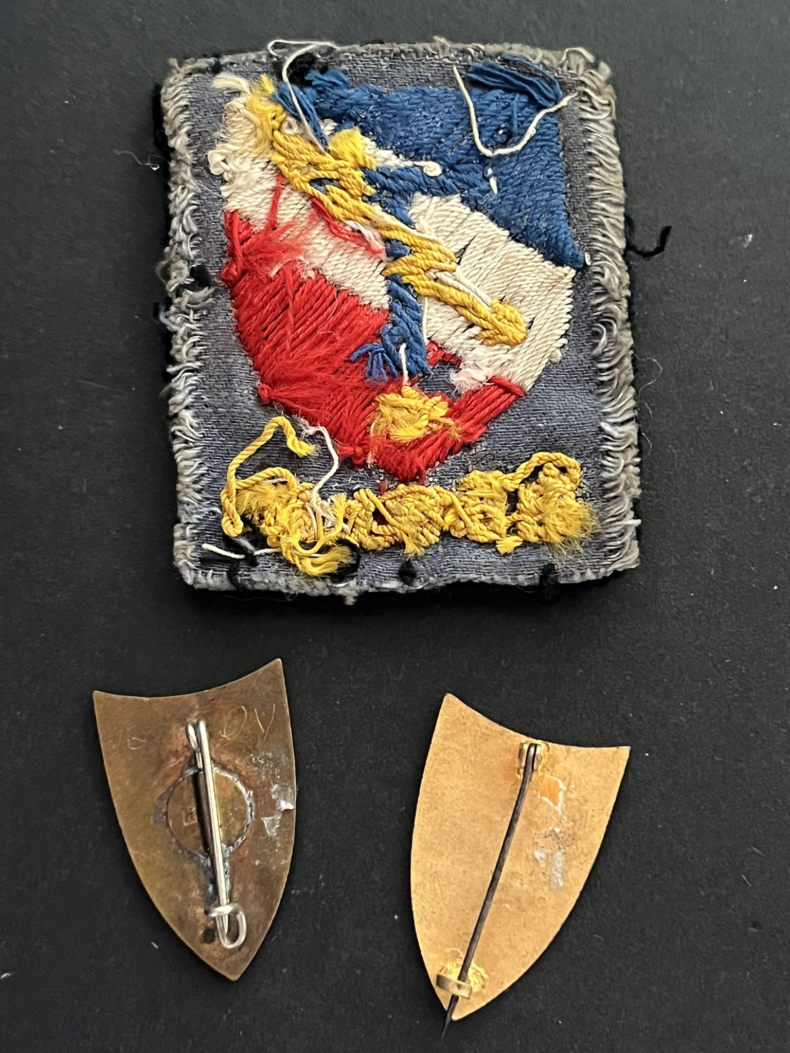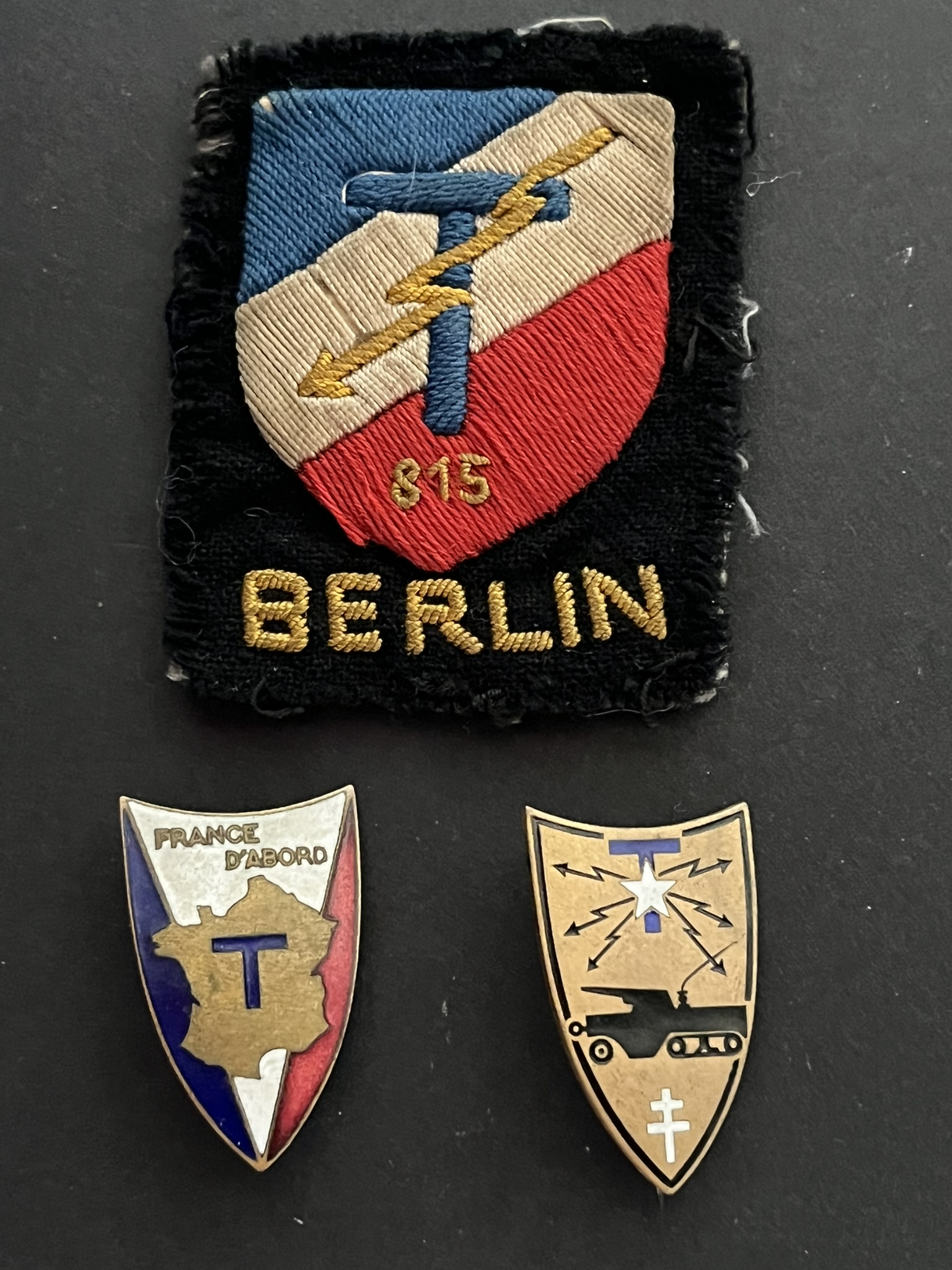 Lot 3 pièces , 815 CT Berlin tissu brodé, 96/84 CT 5DB poinçon AB, CT 2 DB épingle à bascule sans. Lot of 3 pieces, 815th CT Berlin embroidered fabric, 96/84 CT 5th Armored Division marked... en savoir plus