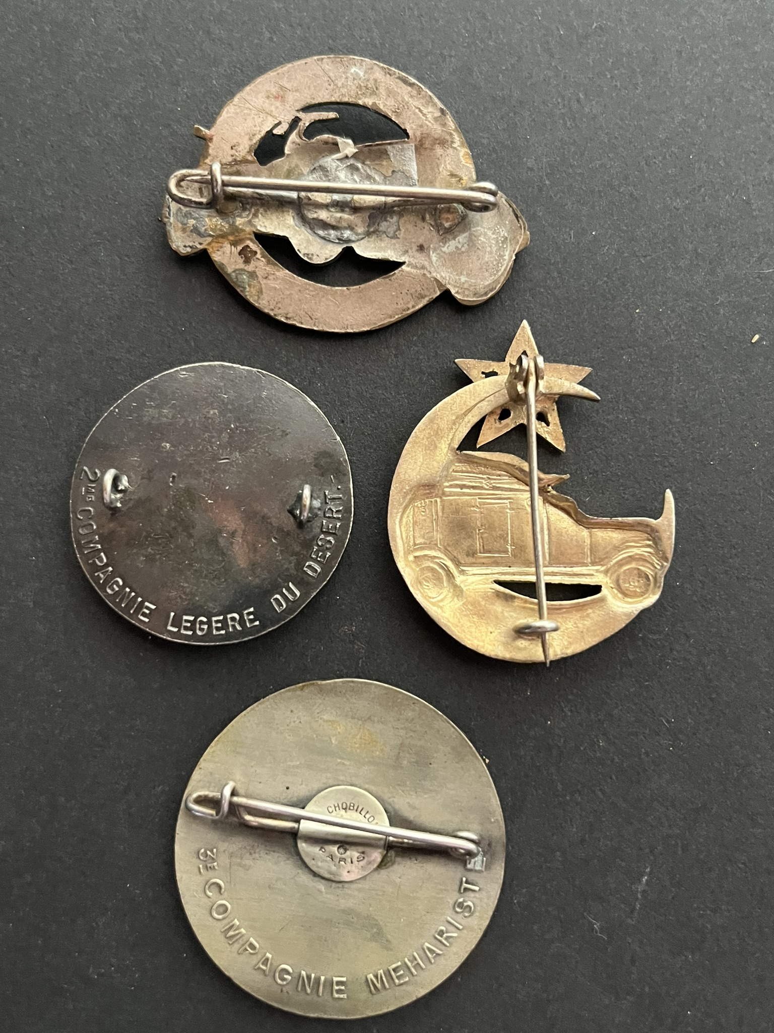 Lot 4 pièces , Insigne Auto Mitrailleuses Légères du Désert grand modèle sans, Auto Mitrailleuses du Levant métal argenté sans, 2 compagnie Légère du Désert sans (Delande), 3e compagnie... en savoir plus