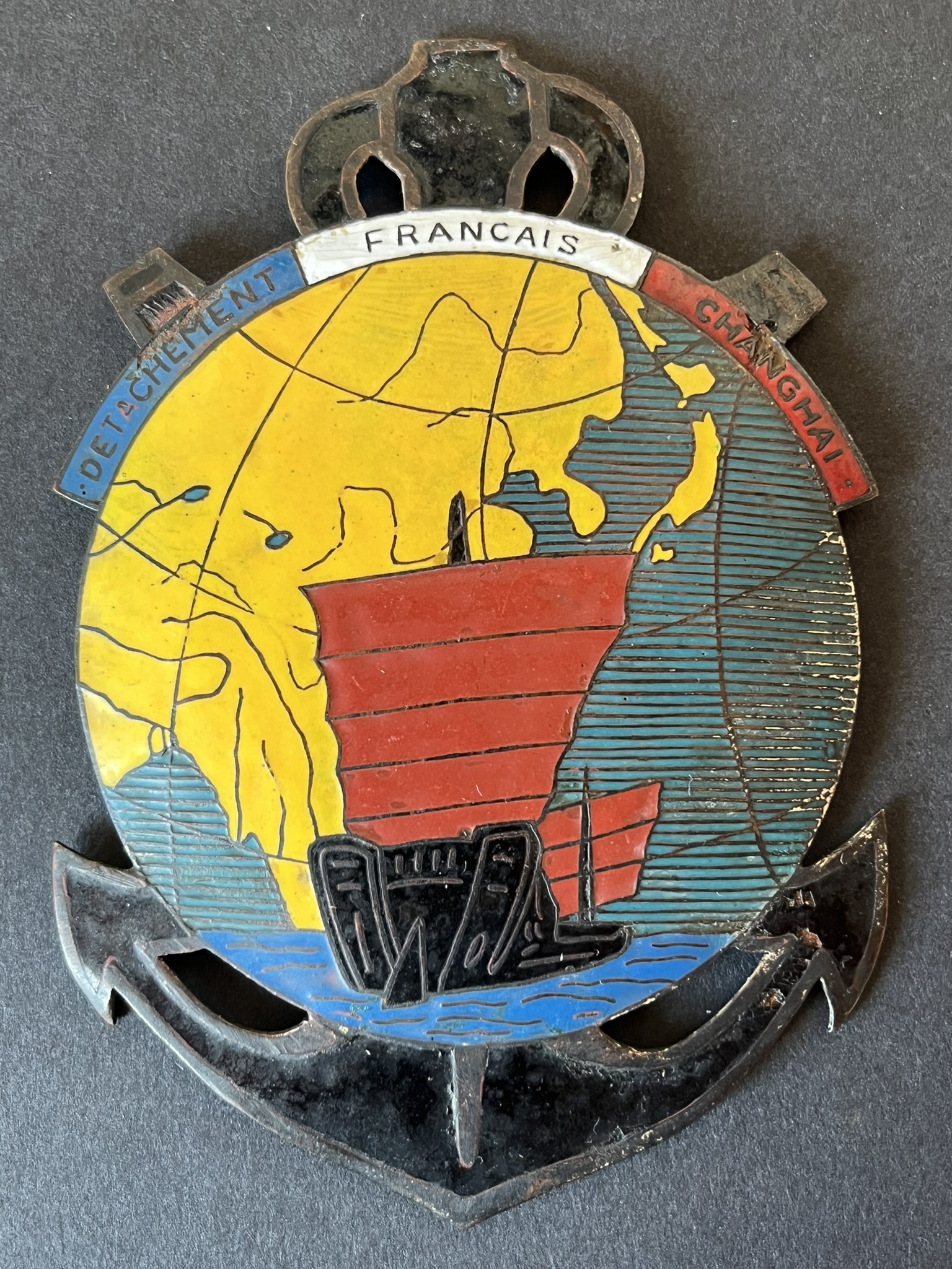 Grand Insigne de bureau émaillé et bombé du Détachement Français de Changai , DFC , fabrication chinoise 117 x 80 mm manque le support en bois de présentation et la fixation. Large domed... en savoir plus
