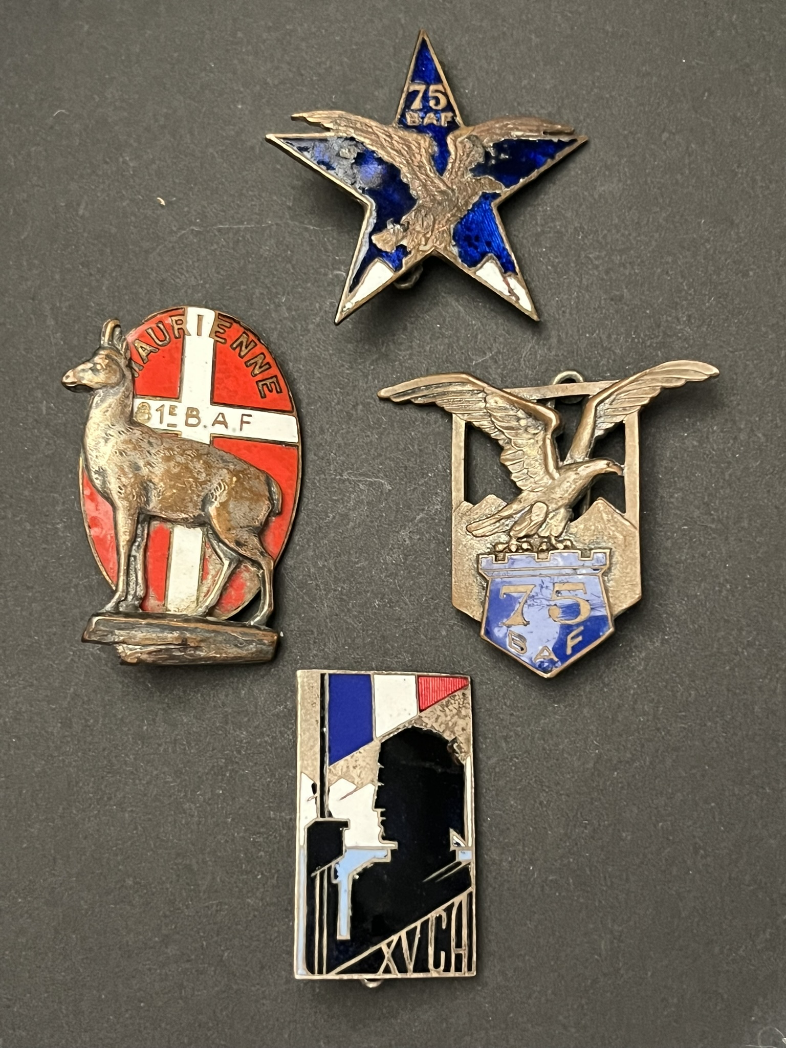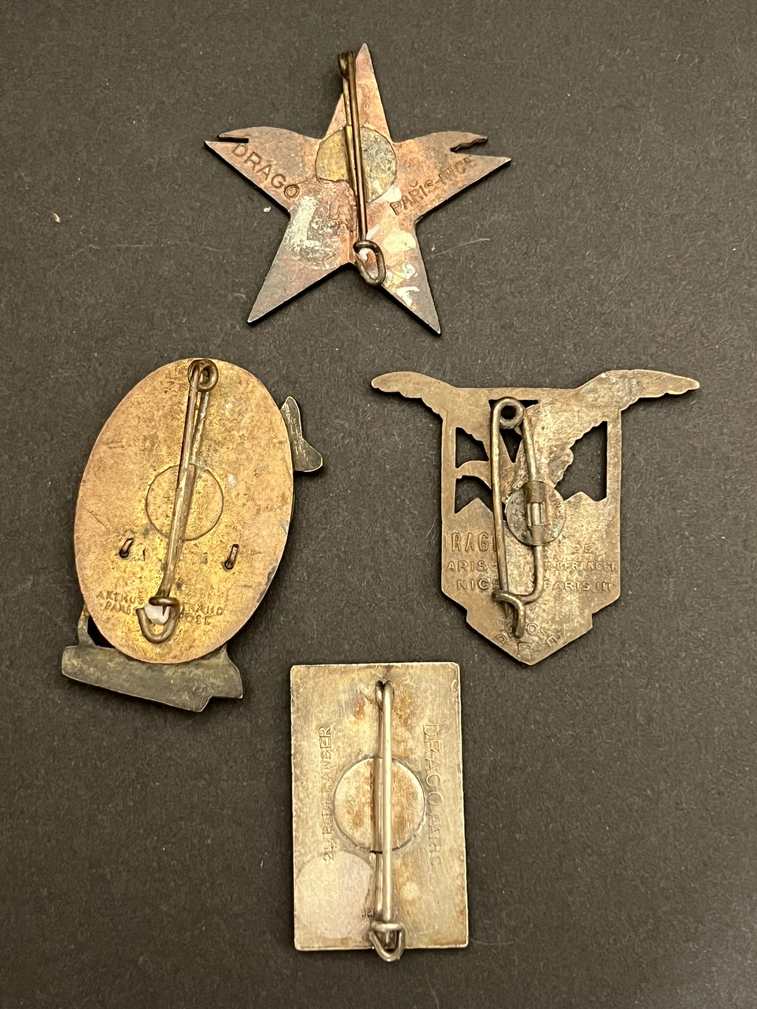 Lot 4 pièces , 75 BAF SES Drago PN, 75 BAF Drago Ber, 81 BAF AB déposé, XV CA Drago Ber. Lot of 4 pieces, 75th Alpine Fortress Battalion SES Drago Paris marked, 75th Alpine Fortress Battalion... en savoir plus