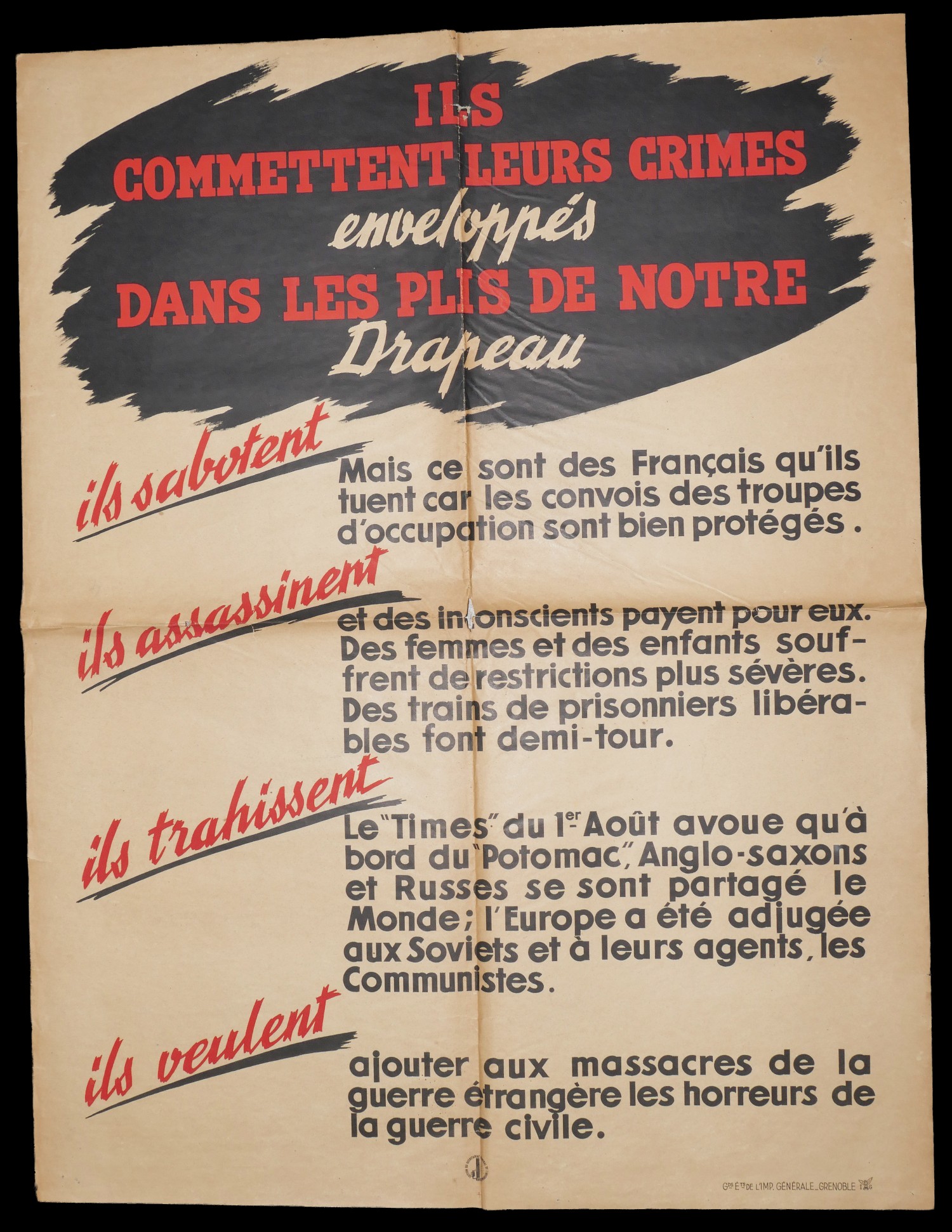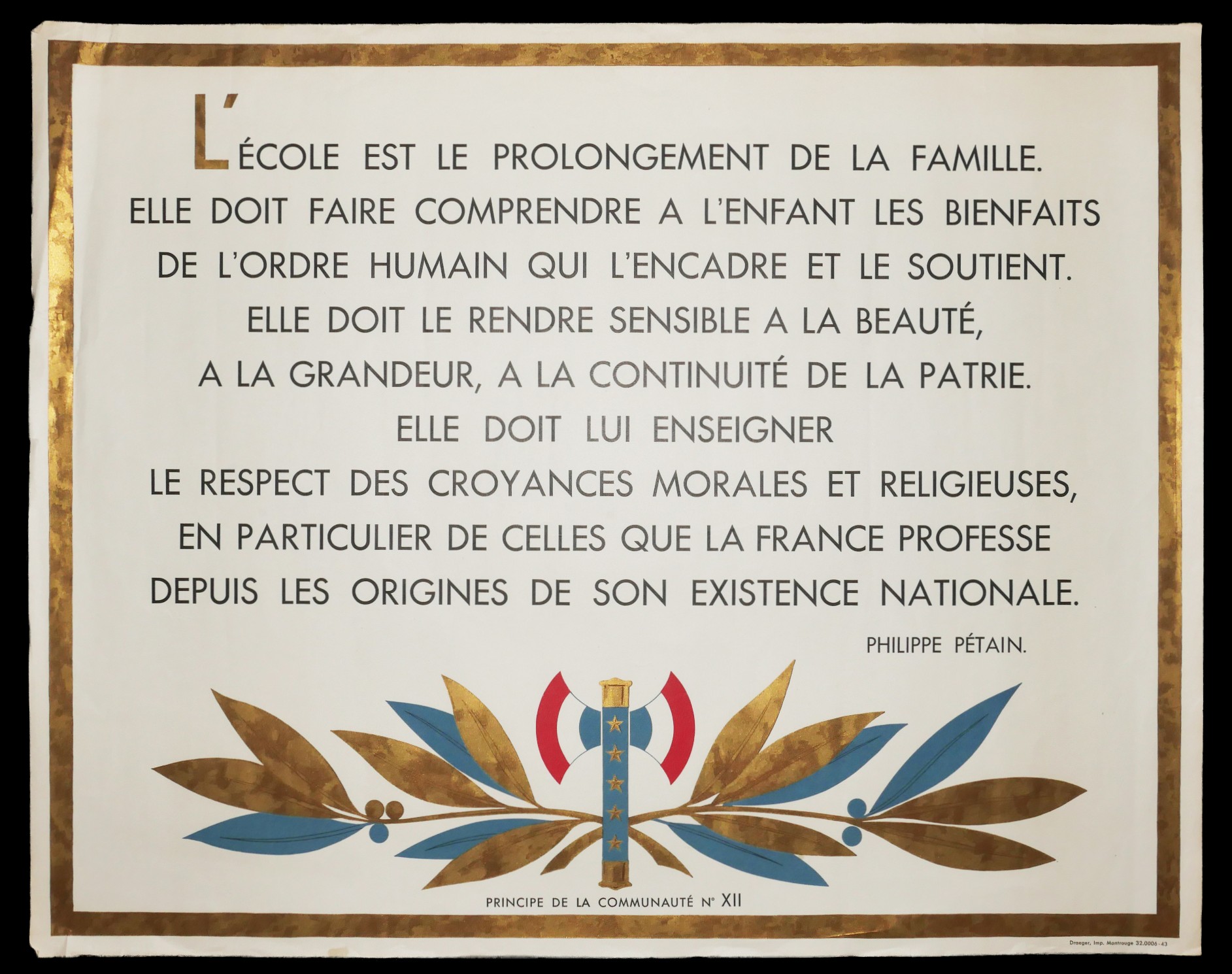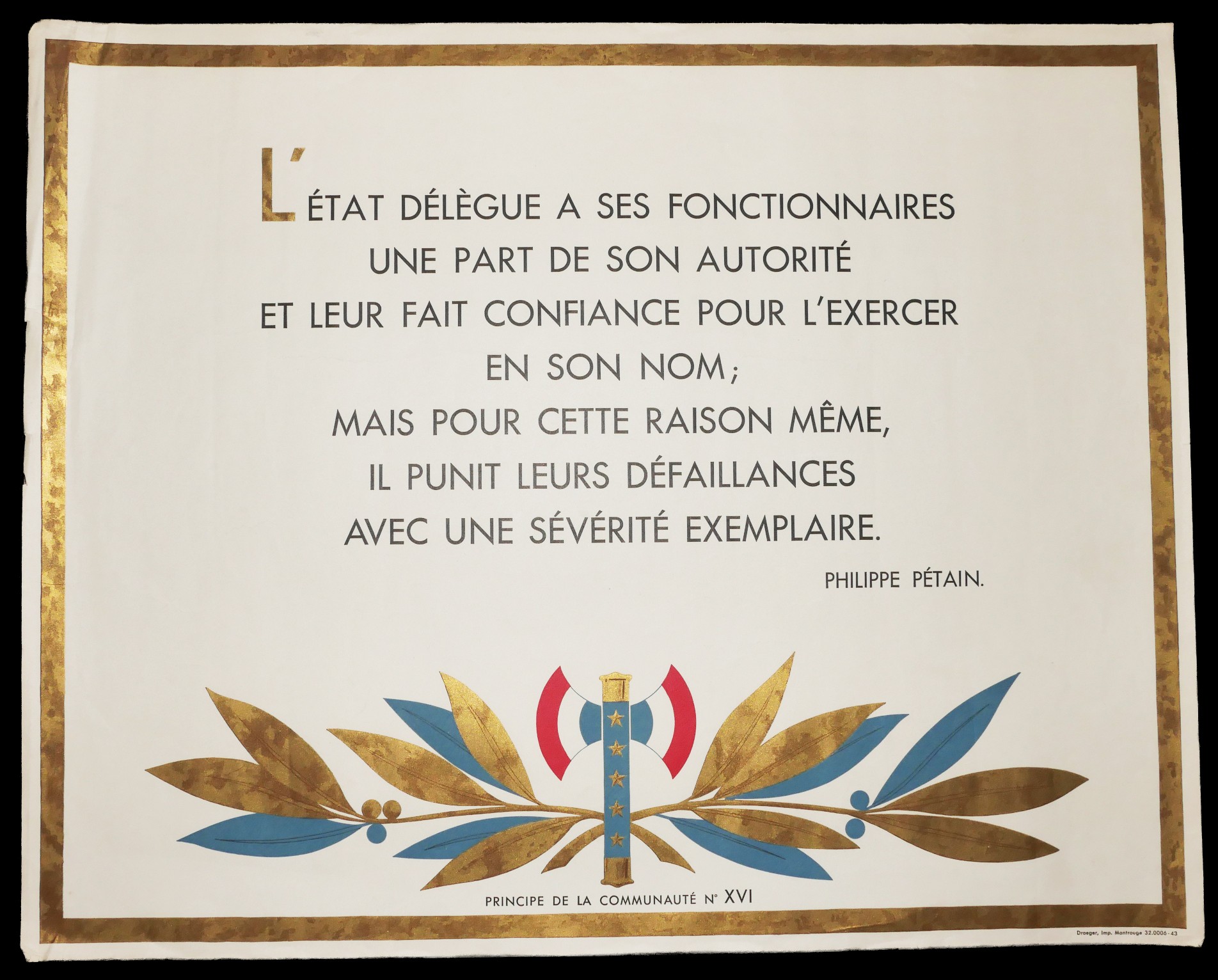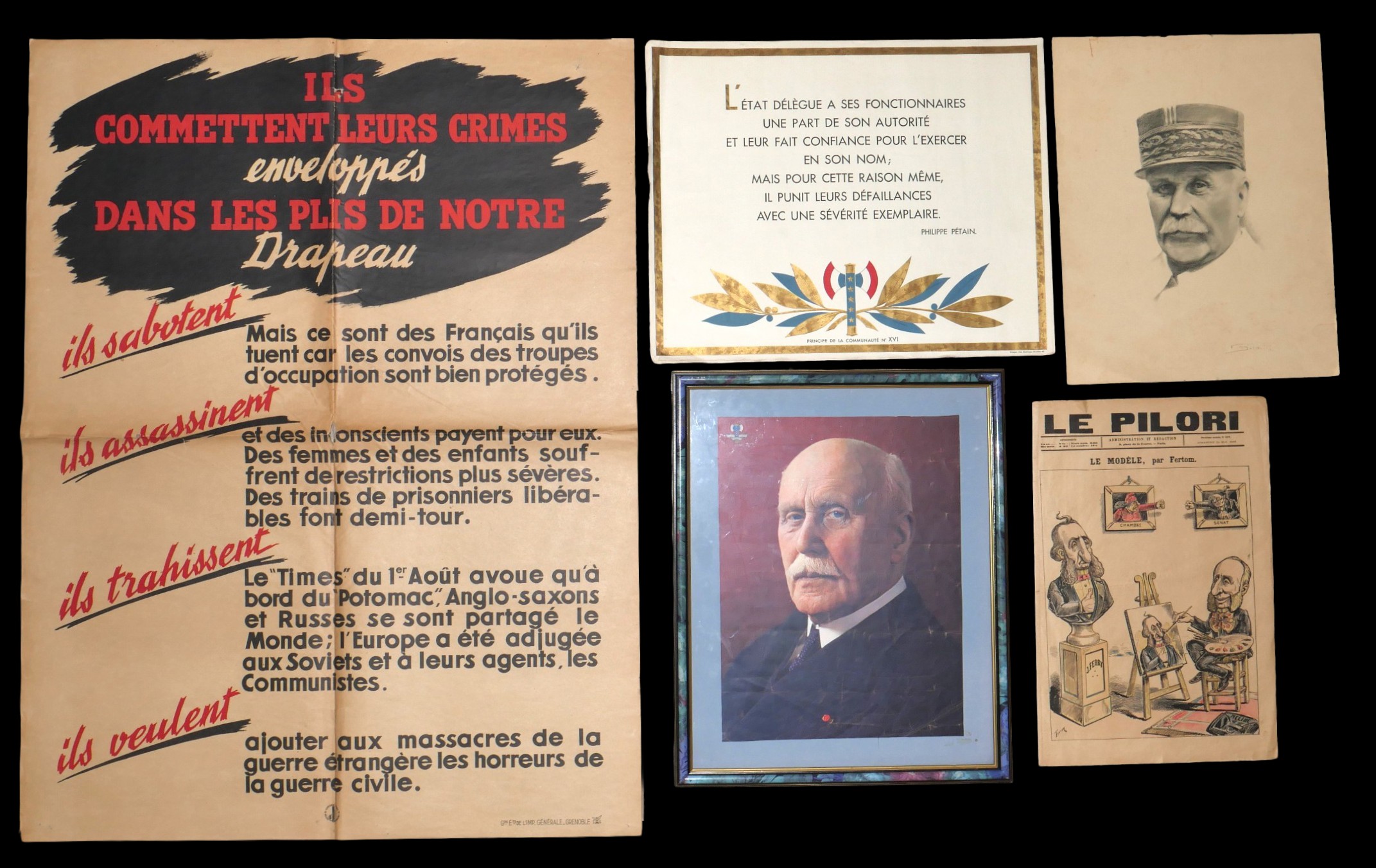 Lot d’affiches et documents. Comprenant un portrait du Maréchal, journal Le Pilori 527 du 24 mai 1896. Une affiche en couleurs Principe de la communauté numéro 16. Une affiche anti... en savoir plus
