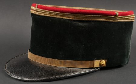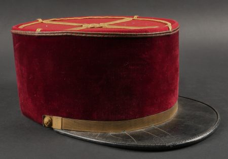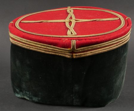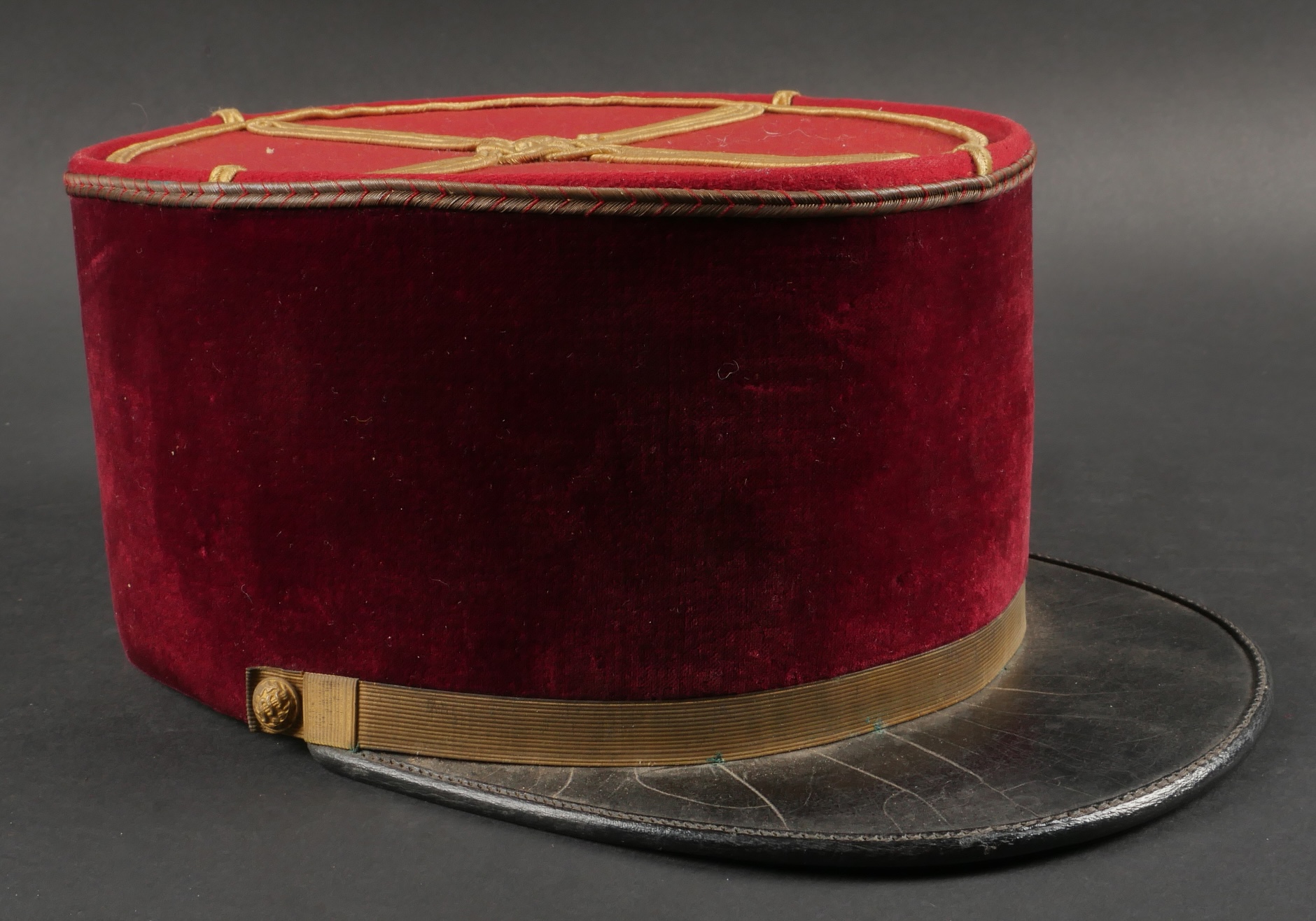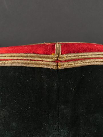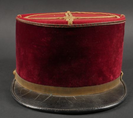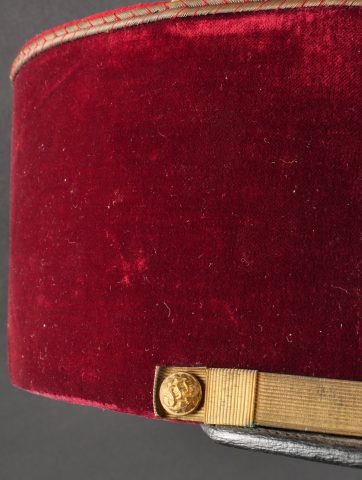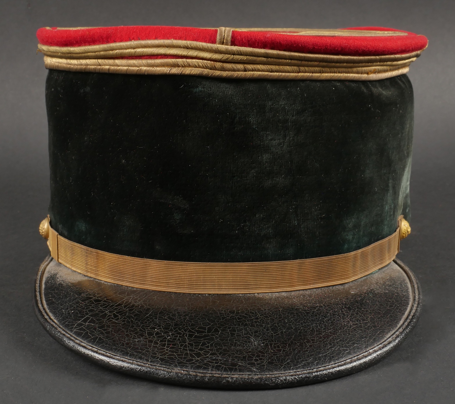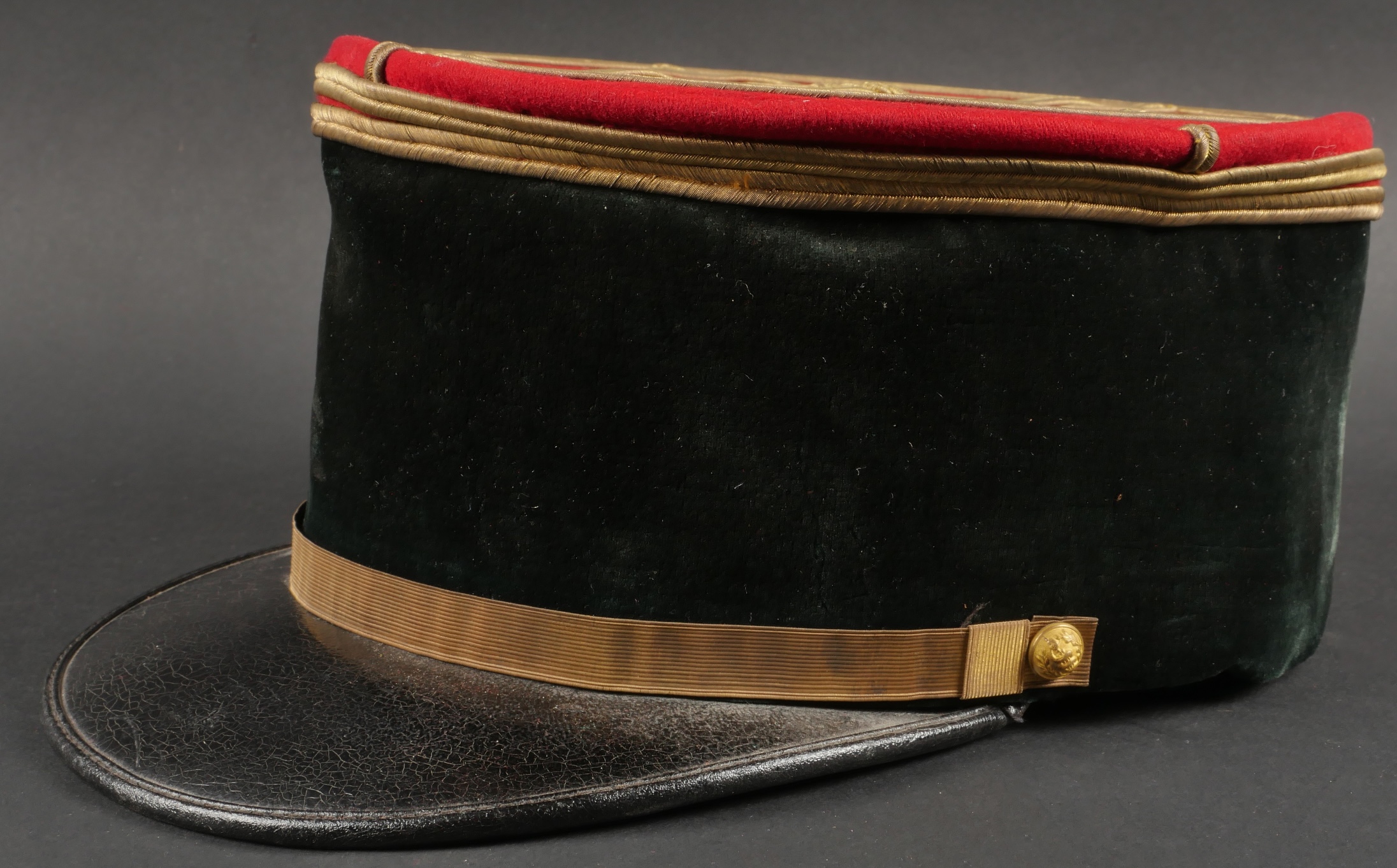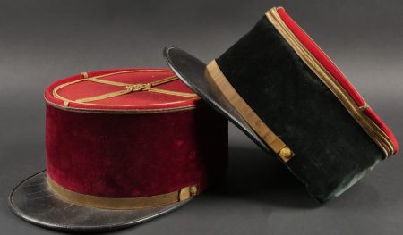 Lot de képis du service de santé. Comprenant un képi de lieutenant pharmacien, plateau rouge garance, bandeau en velours vert, petits boutons du service de santé. Visière en cuir avec jonc en... en savoir plus