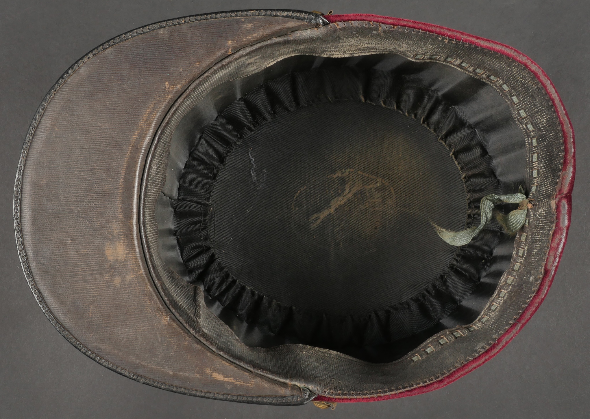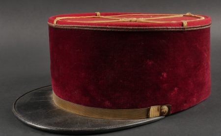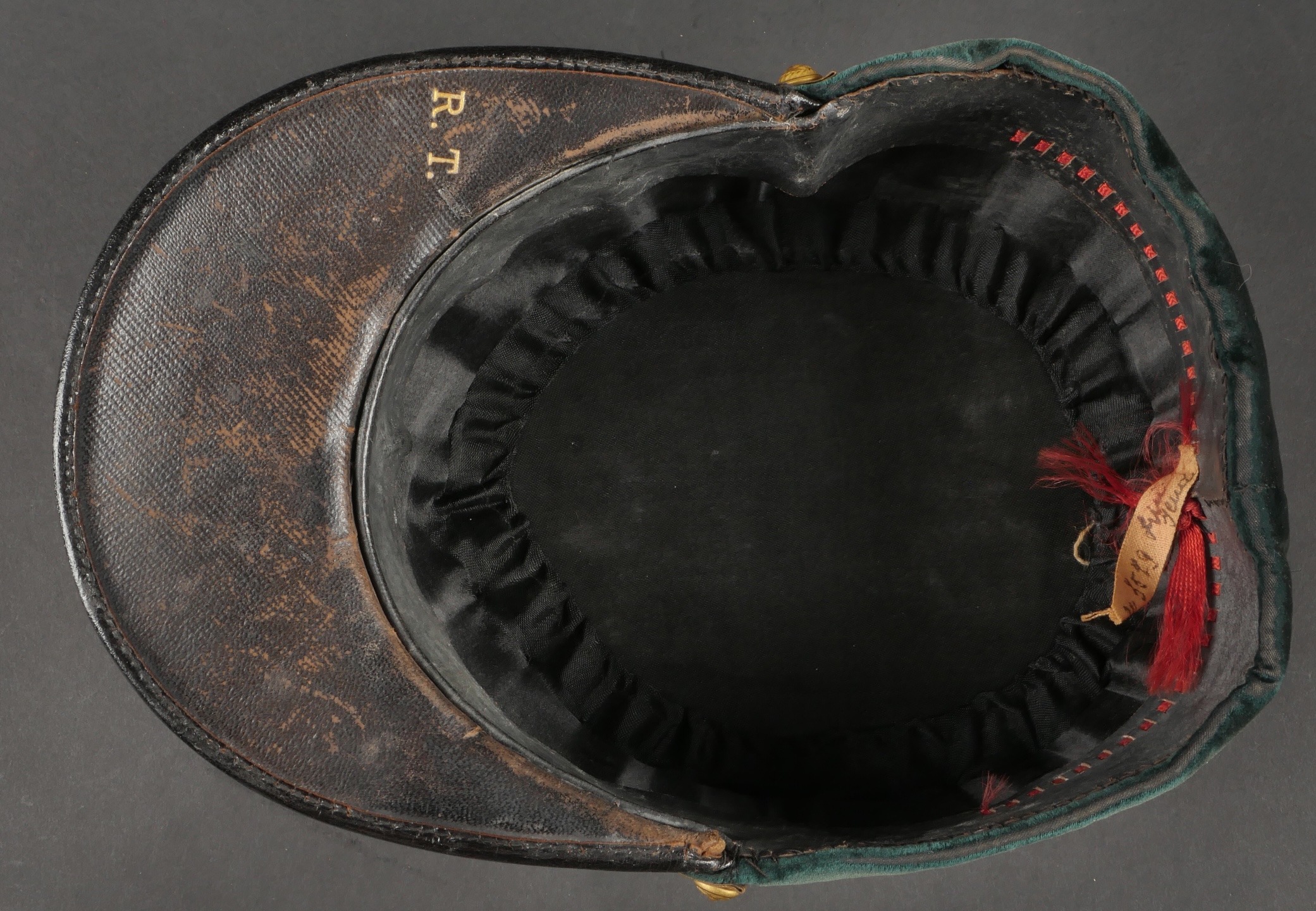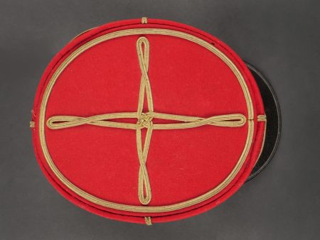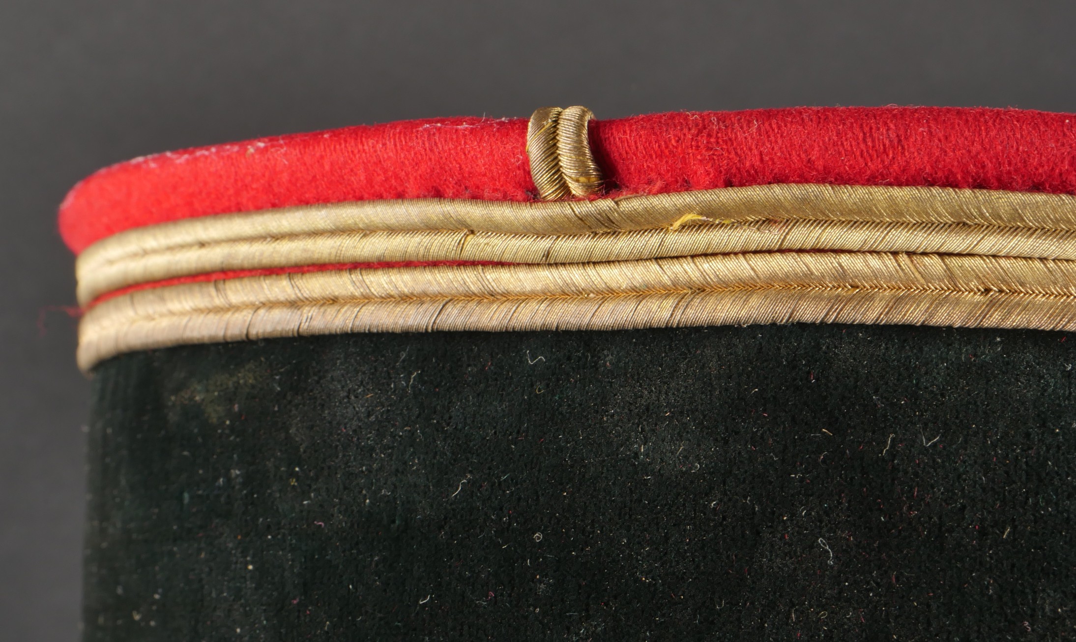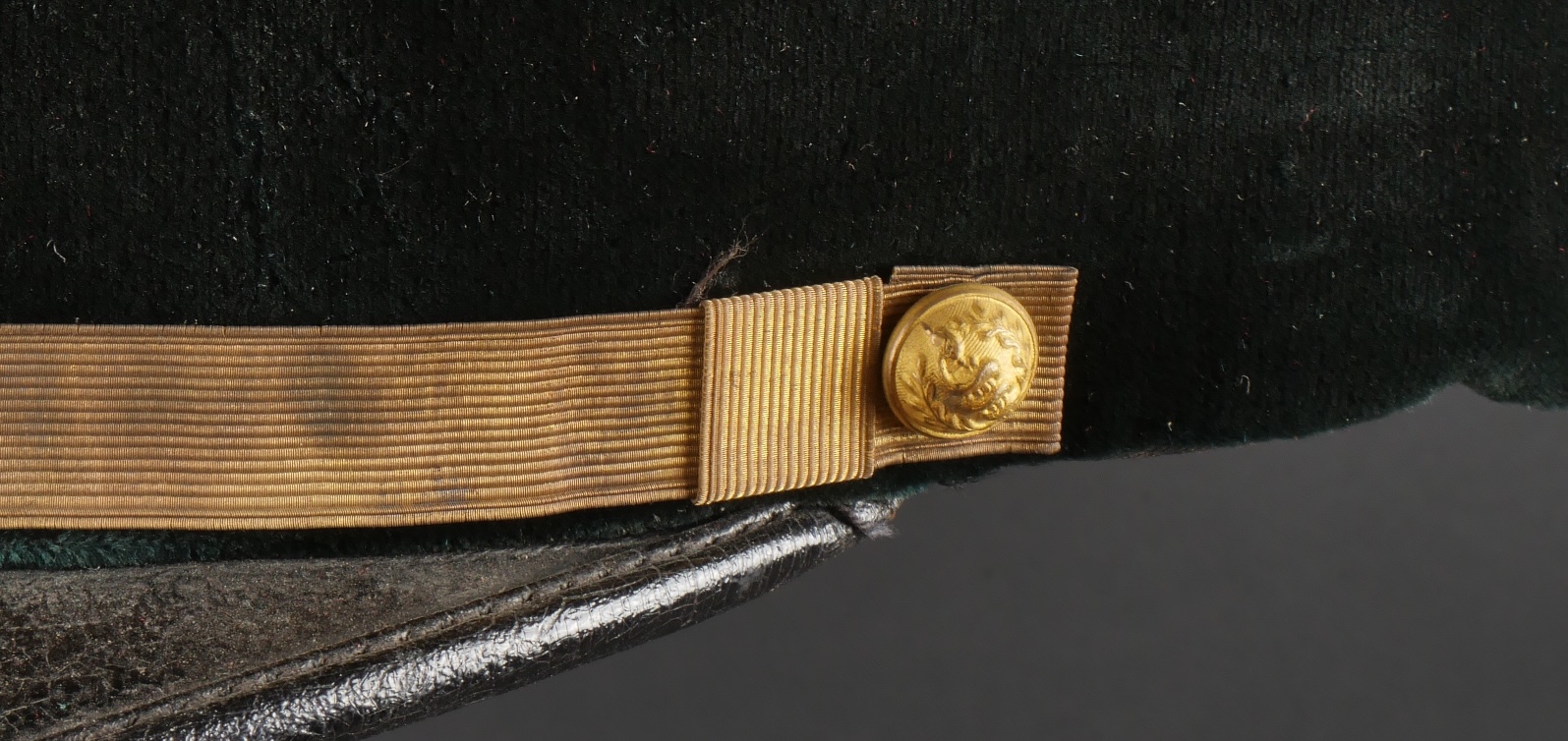 Lot de képis du service de santé. Comprenant un képi de lieutenant pharmacien, plateau rouge garance, bandeau en velours vert, petits boutons du service de santé. Visière en cuir avec jonc en... en savoir plus