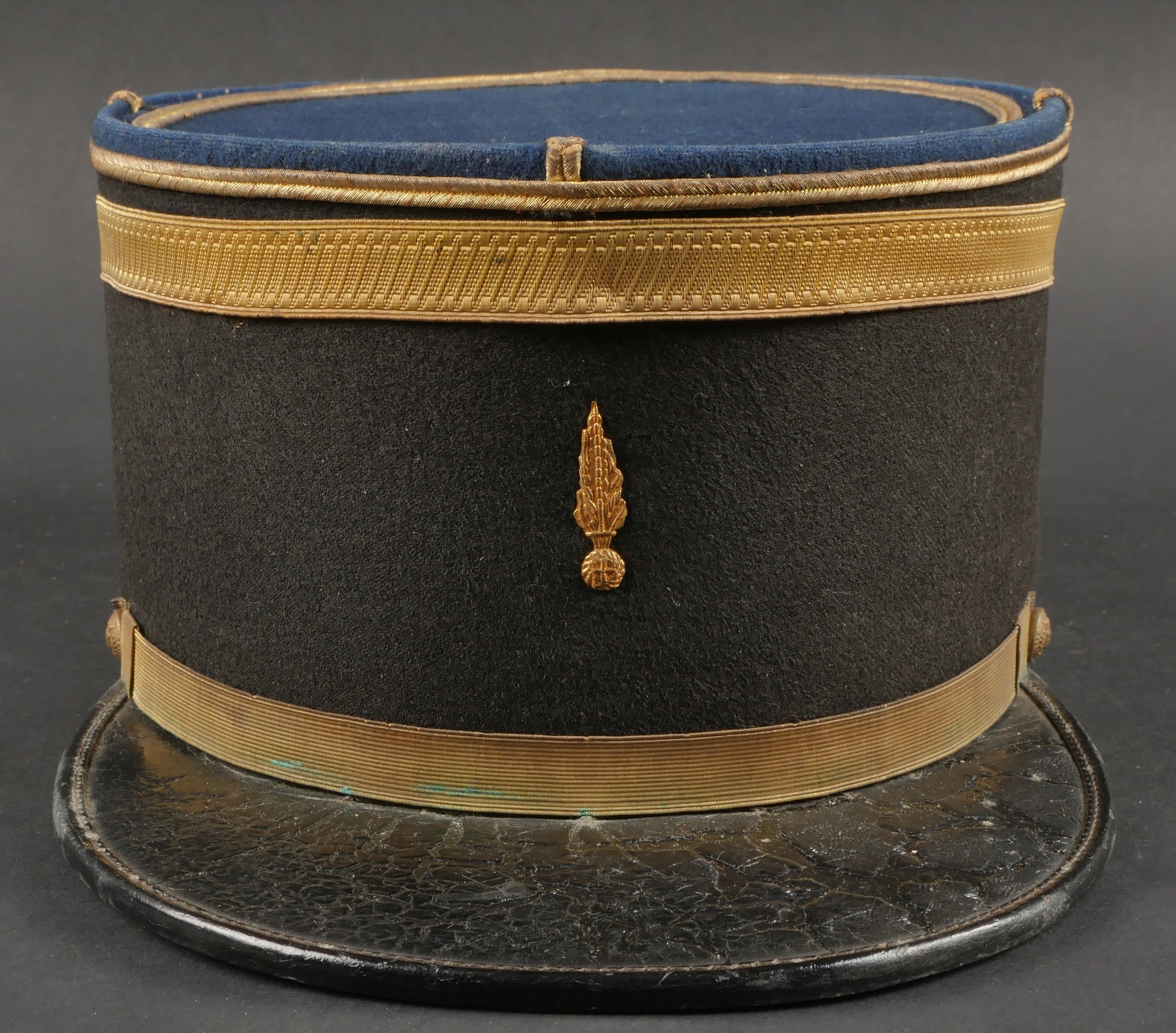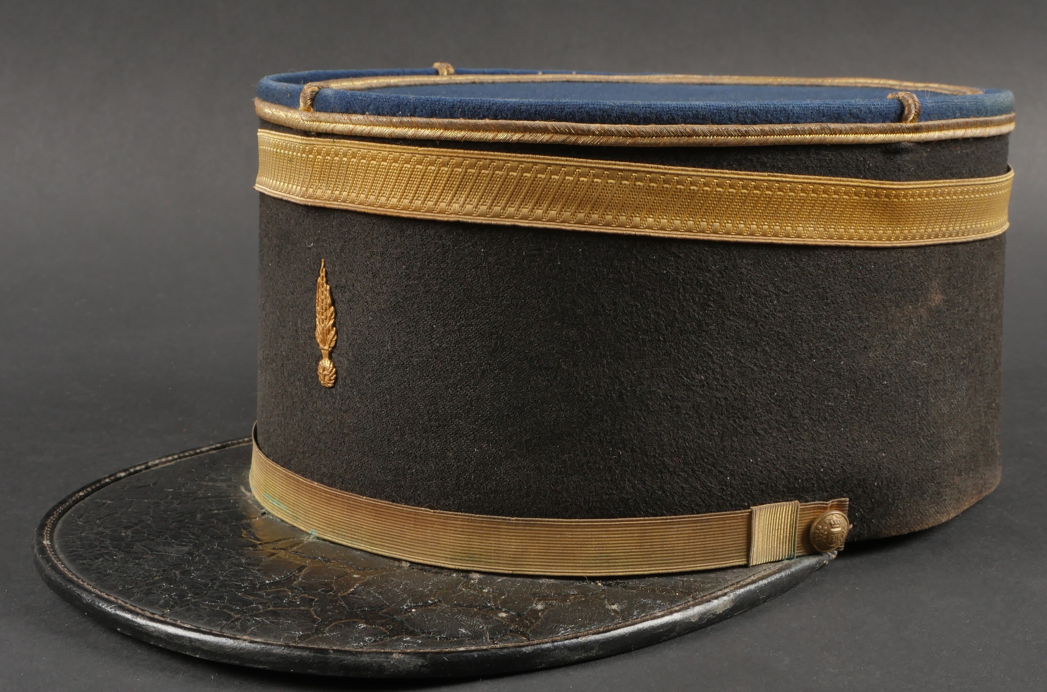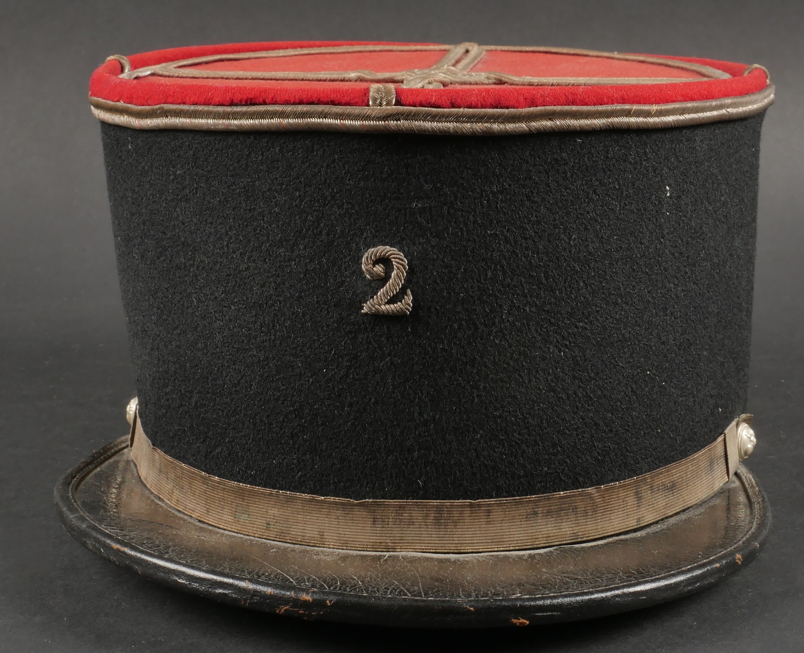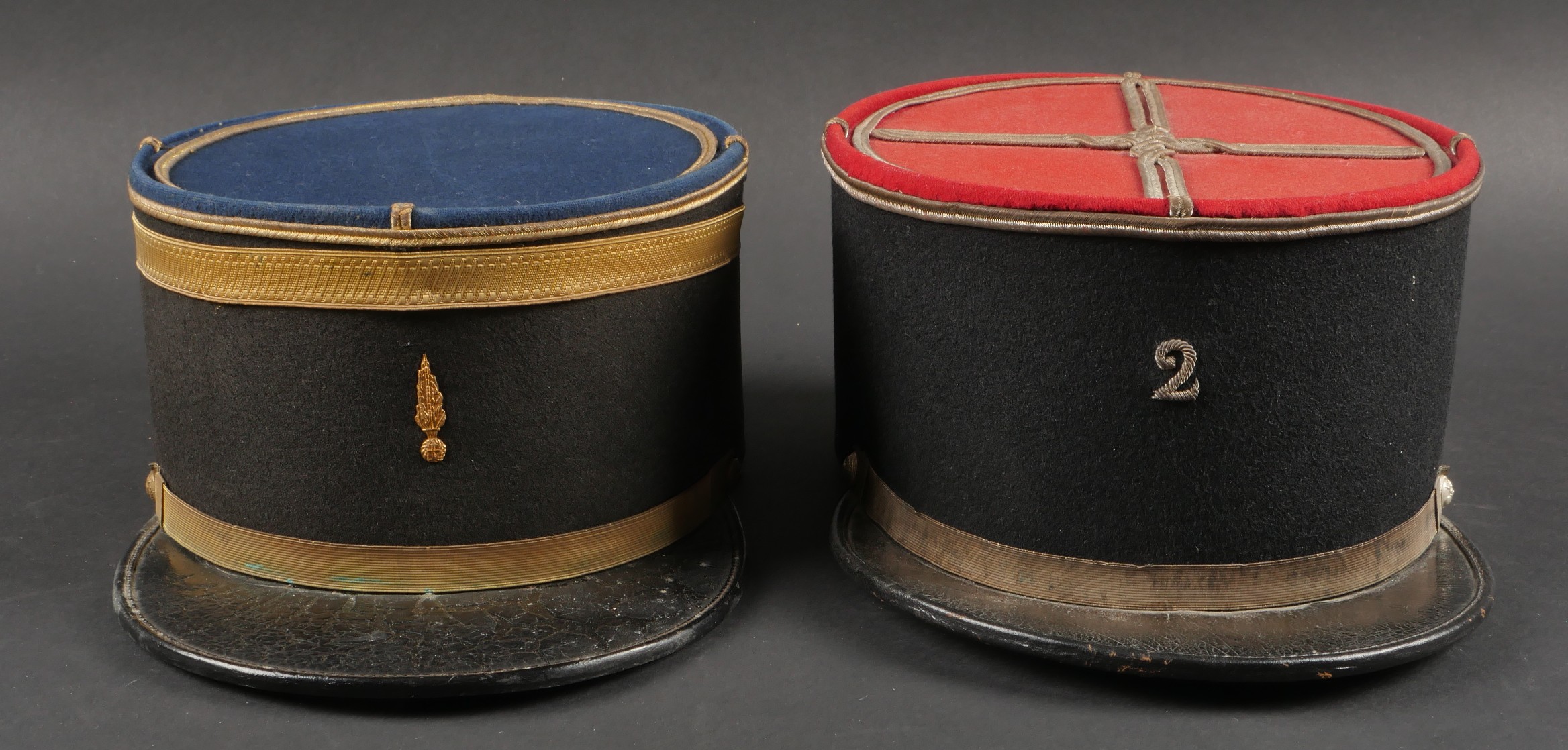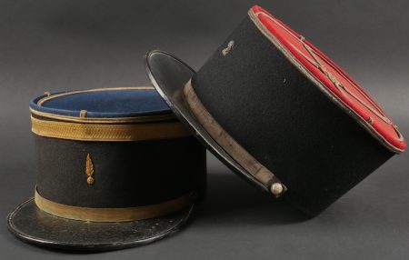 Lot de képis . Comprenant un képi modèle 1935 de garde républicain, possédant le grade de maréchal des logis, plateau bleu et bandeau noir, galon doré décousu sur l’arrière, visière et jonc en cuir. Petits boutons frappés Garde Républicaine et grenade en laiton rapportée, bandeau en cuir noir avec marquage de tailleur Perchet à Paris. Un képi modèle 1935 du 2ème régiment de dragons, plateau garance et bandeau noir, chiffre 2 brodé en cannetille argentée, fausse jugulaire plate argentée retenue par deux petits boutons argentés à la grenade, visière et jonc en cuir. Lot of képis Including a 1935 Republican Guard képi with the rank of sergeant major blue top black band detached gold braid at rear leather visor and edging small buttons with Republican Guard emblem and brass grenade black leather band marked Perchet Paris a 1935 képi of the 2nd Dragoon Regiment with garance red top black band silverembroidered number 2 silver flat chinstrap held by two small silver grenade buttons leather visor and edging.