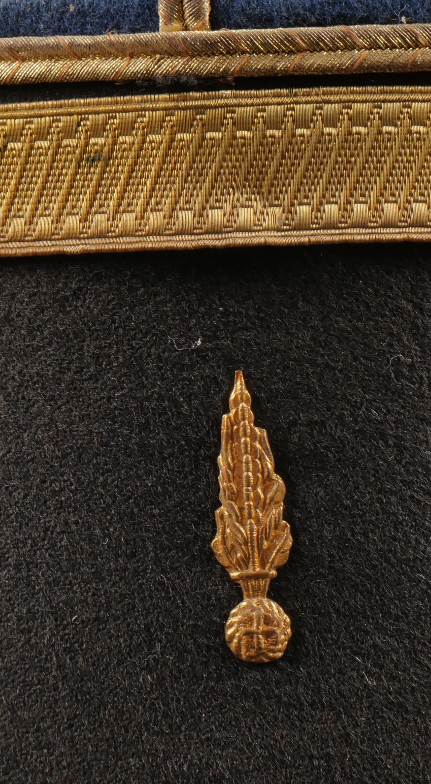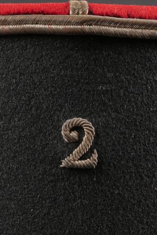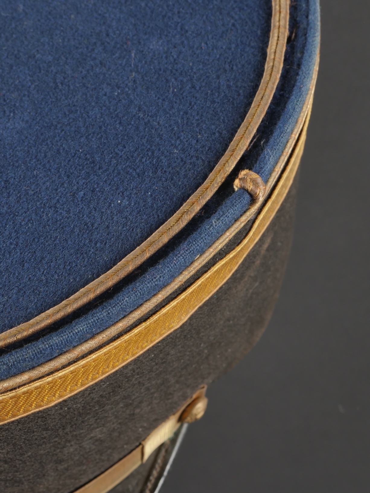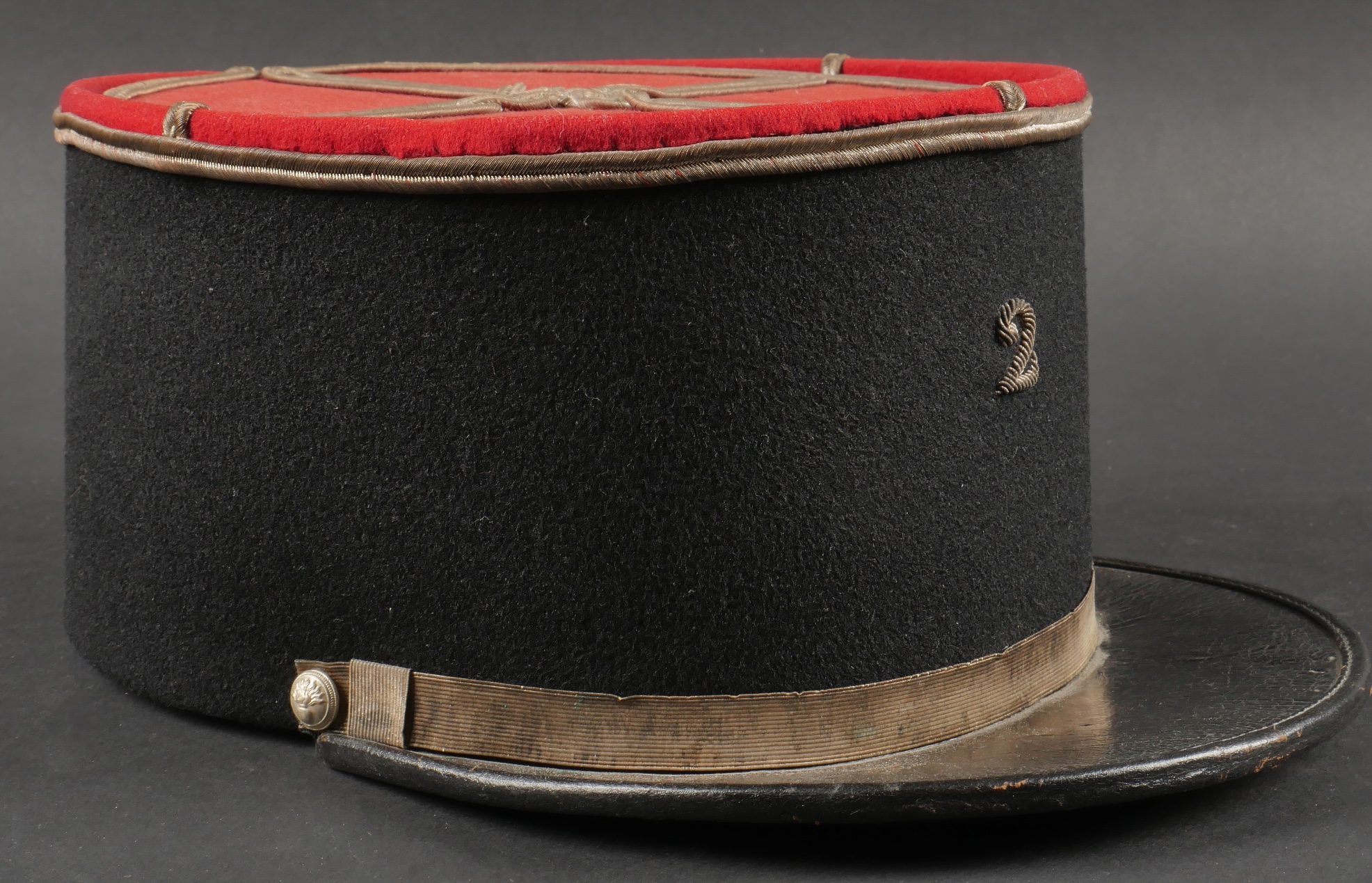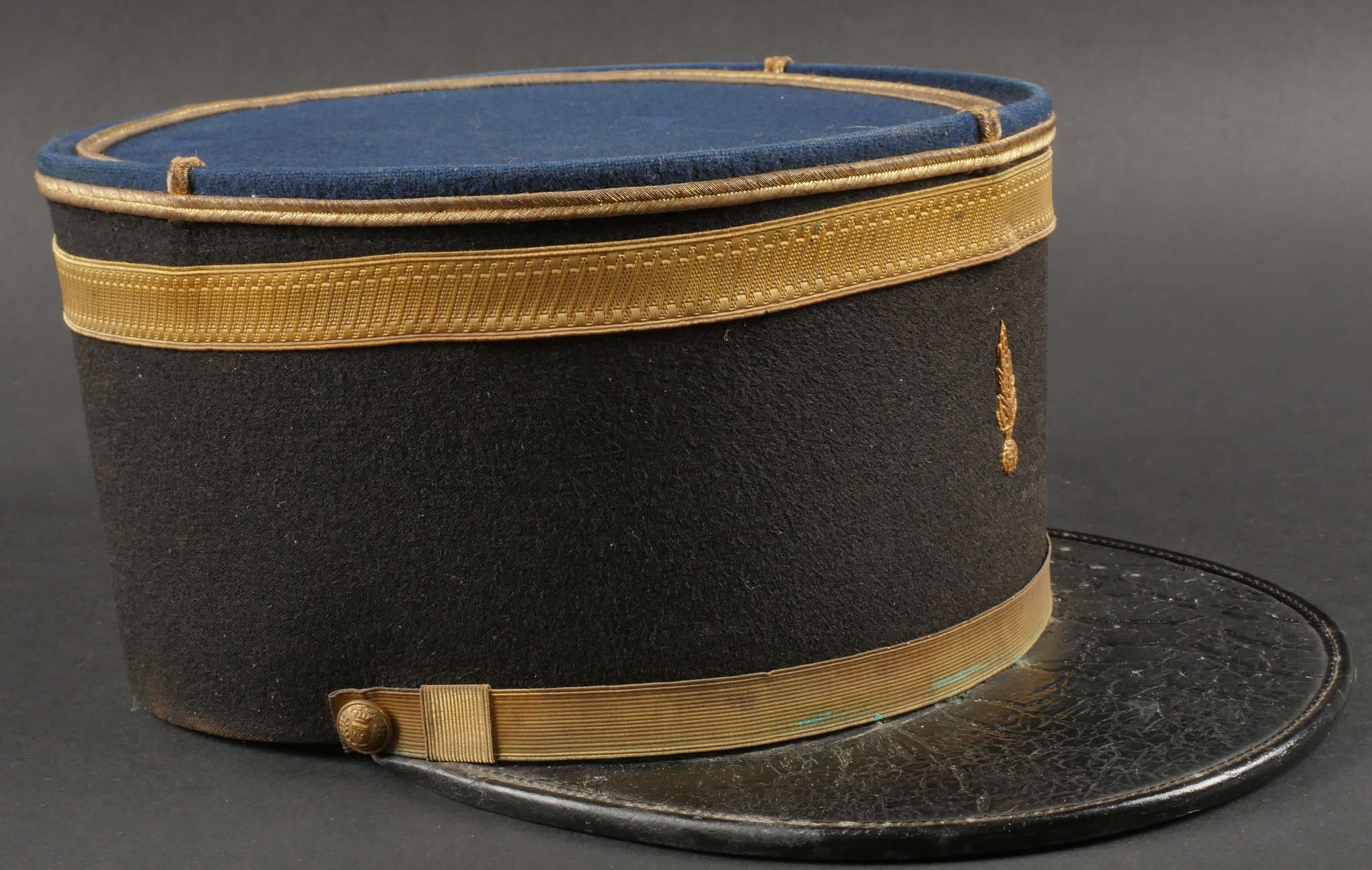 Lot de képis . Comprenant un képi modèle 1935 de garde républicain, possédant le grade de maréchal des logis, plateau bleu et bandeau noir, galon doré décousu sur l’arrière, visière et jonc en cuir. Petits boutons frappés Garde Républicaine et grenade en laiton rapportée, bandeau en cuir noir avec marquage de tailleur Perchet à Paris. Un képi modèle 1935 du 2ème régiment de dragons, plateau garance et bandeau noir, chiffre 2 brodé en cannetille argentée, fausse jugulaire plate argentée retenue par deux petits boutons argentés à la grenade, visière et jonc en cuir. Lot of képis Including a 1935 Republican Guard képi with the rank of sergeant major blue top black band detached gold braid at rear leather visor and edging small buttons with Republican Guard emblem and brass grenade black leather band marked Perchet Paris a 1935 képi of the 2nd Dragoon Regiment with garance red top black band silverembroidered number 2 silver flat chinstrap held by two small silver grenade buttons leather visor and edging.