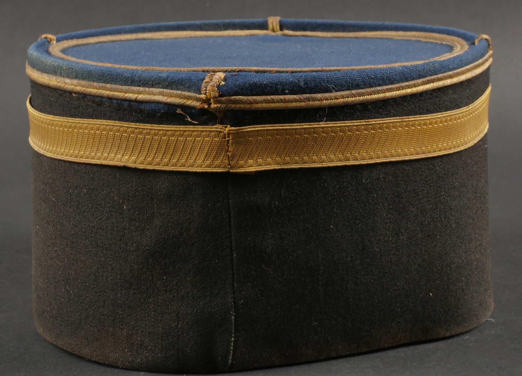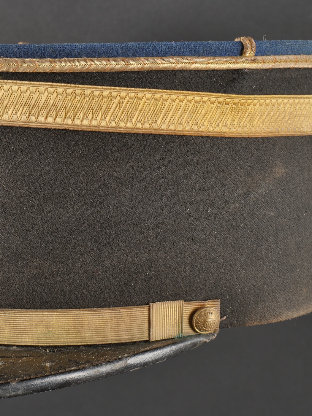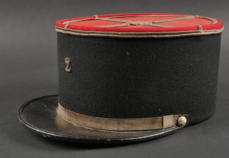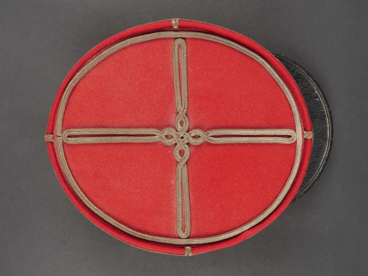 Lot de képis . Comprenant un képi modèle 1935 de garde républicain, possédant le grade de maréchal des logis, plateau bleu et bandeau noir, galon doré décousu sur l’arrière, visière et jonc en cuir. Petits boutons frappés Garde Républicaine et grenade en laiton rapportée, bandeau en cuir noir avec marquage de tailleur Perchet à Paris. Un képi modèle 1935 du 2ème régiment de dragons, plateau garance et bandeau noir, chiffre 2 brodé en cannetille argentée, fausse jugulaire plate argentée retenue par deux petits boutons argentés à la grenade, visière et jonc en cuir. Lot of képis Including a 1935 Republican Guard képi with the rank of sergeant major blue top black band detached gold braid at rear leather visor and edging small buttons with Republican Guard emblem and brass grenade black leather band marked Perchet Paris a 1935 képi of the 2nd Dragoon Regiment with garance red top black band silverembroidered number 2 silver flat chinstrap held by two small silver grenade buttons leather visor and edging.