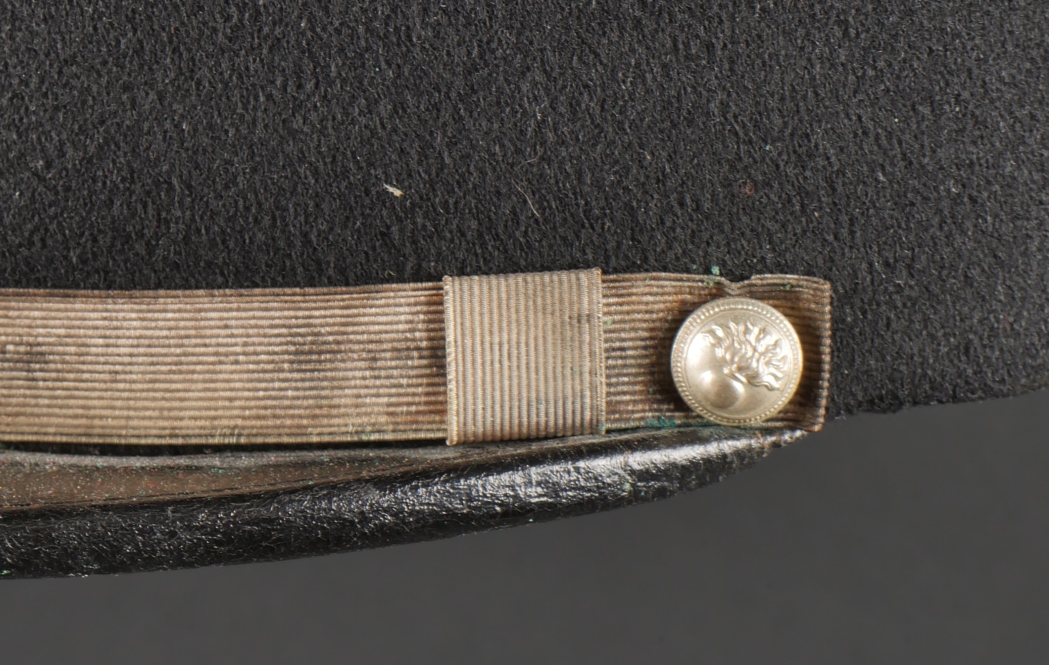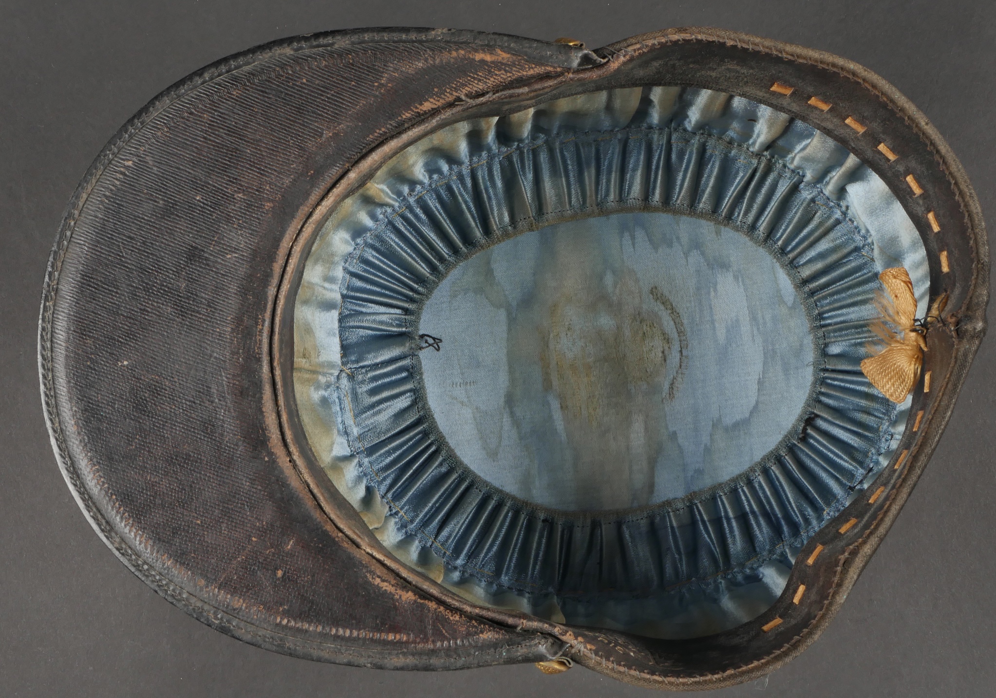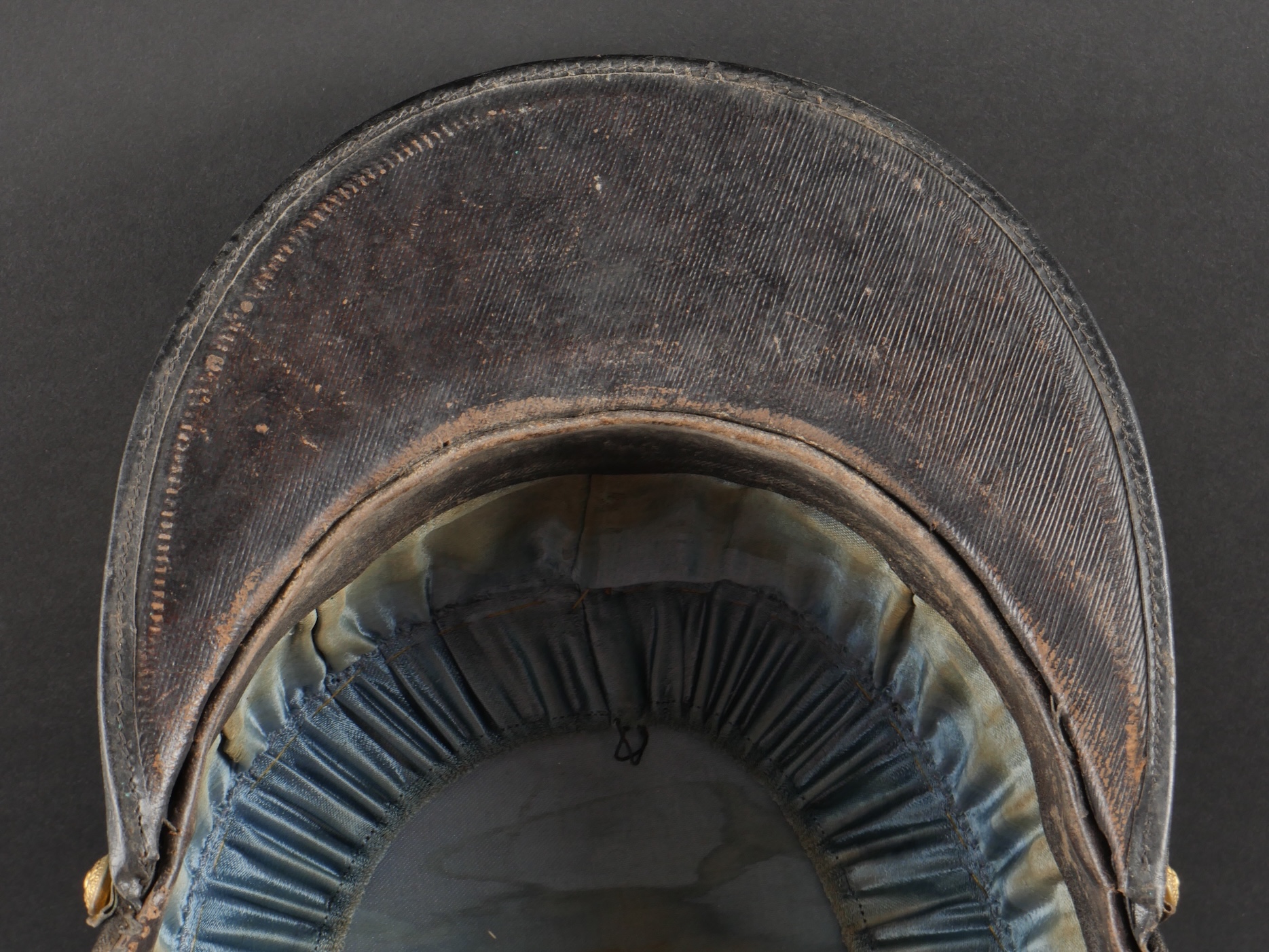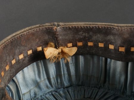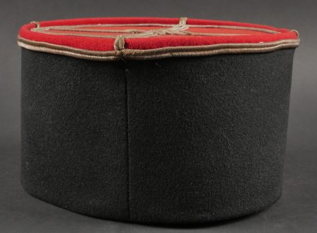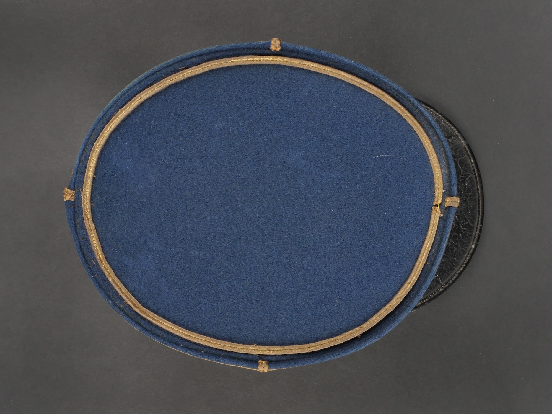 Lot de képis . Comprenant un képi modèle 1935 de garde républicain, possédant le grade de maréchal des logis, plateau bleu et bandeau noir, galon doré décousu sur l’arrière, visière et jonc en cuir. Petits boutons frappés Garde Républicaine et grenade en laiton rapportée, bandeau en cuir noir avec marquage de tailleur Perchet à Paris. Un képi modèle 1935 du 2ème régiment de dragons, plateau garance et bandeau noir, chiffre 2 brodé en cannetille argentée, fausse jugulaire plate argentée retenue par deux petits boutons argentés à la grenade, visière et jonc en cuir. Lot of képis Including a 1935 Republican Guard képi with the rank of sergeant major blue top black band detached gold braid at rear leather visor and edging small buttons with Republican Guard emblem and brass grenade black leather band marked Perchet Paris a 1935 képi of the 2nd Dragoon Regiment with garance red top black band silverembroidered number 2 silver flat chinstrap held by two small silver grenade buttons leather visor and edging.