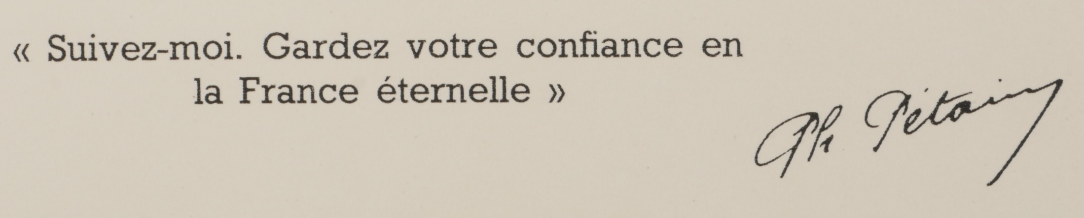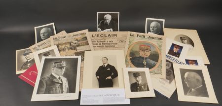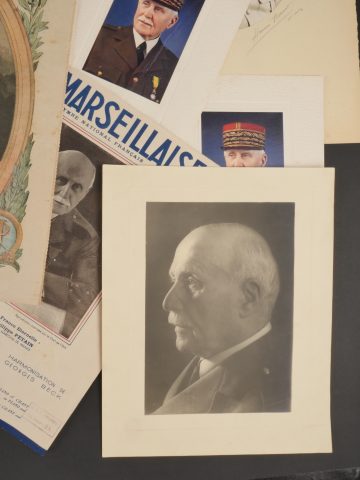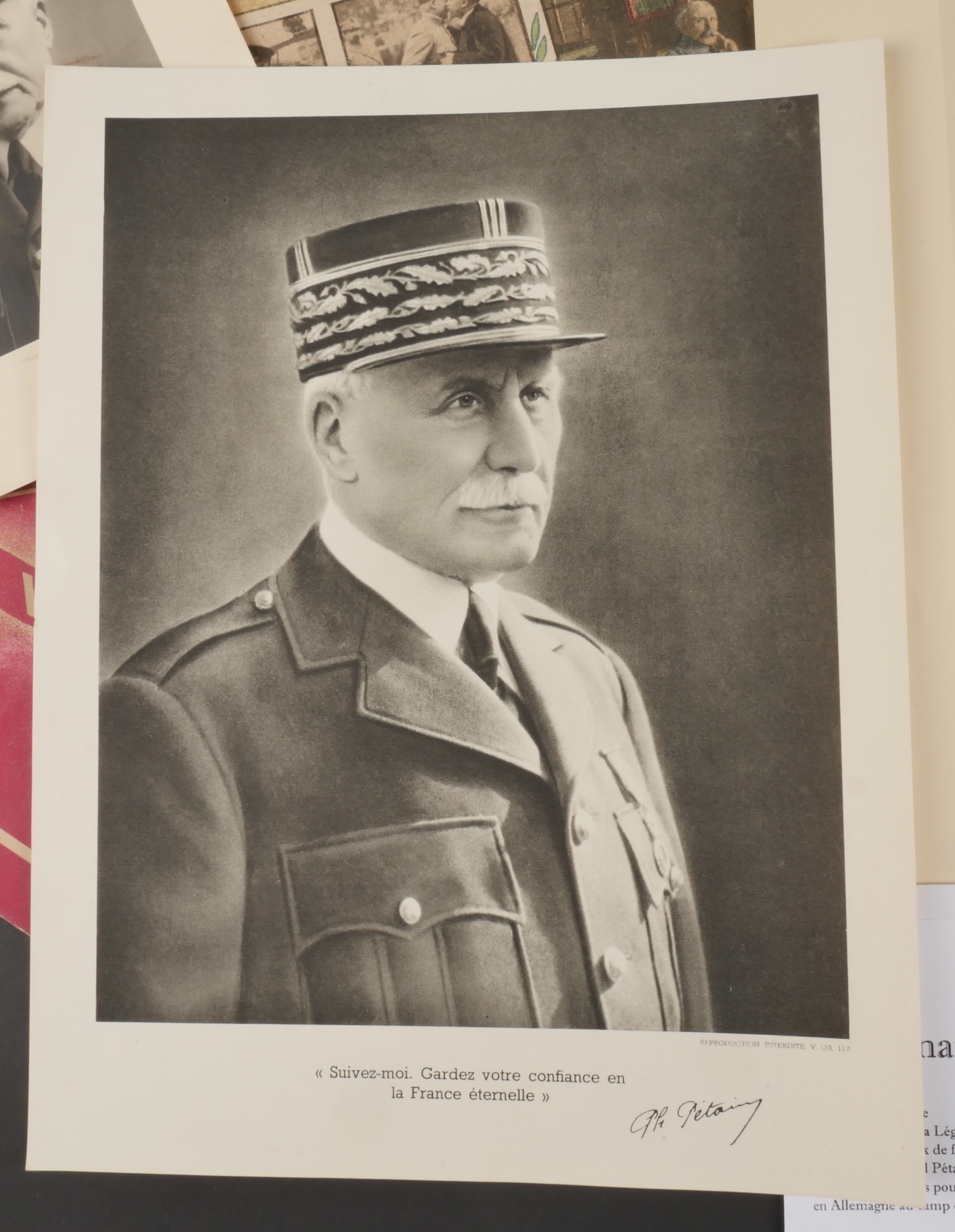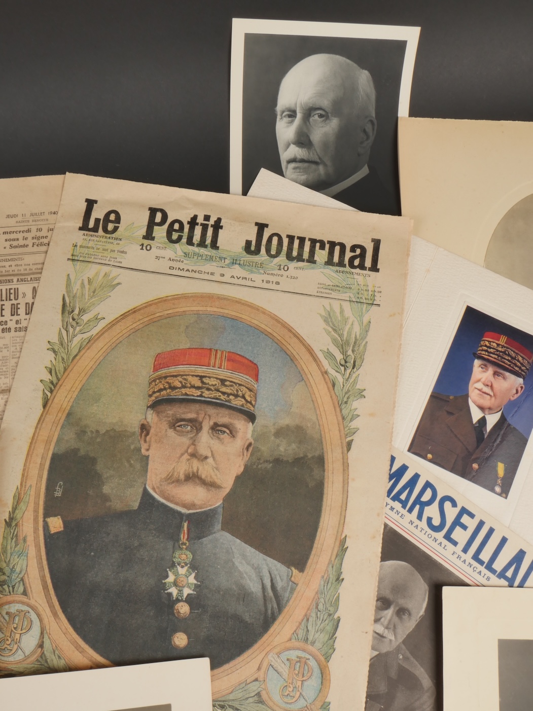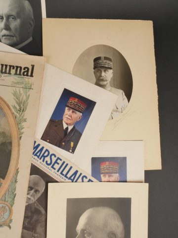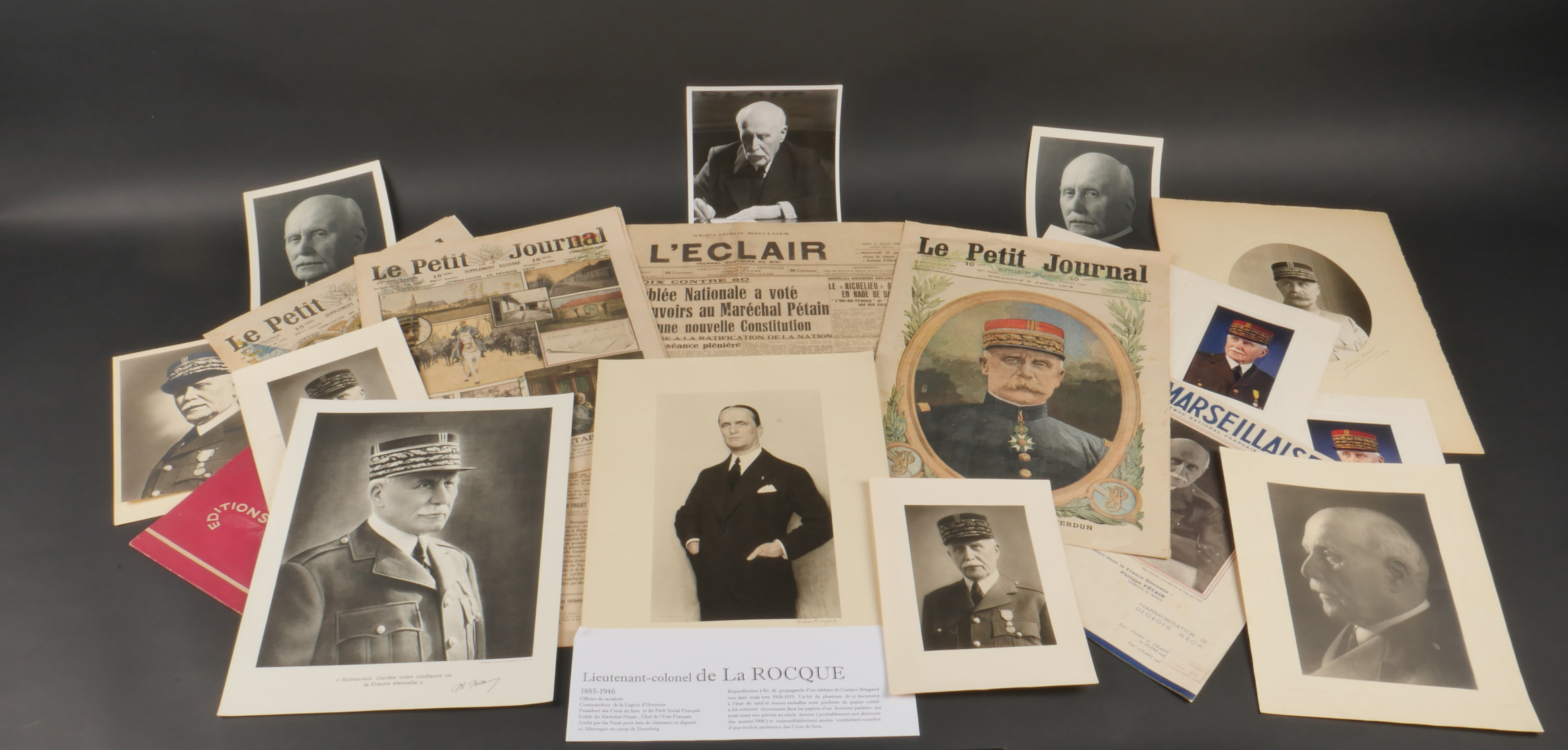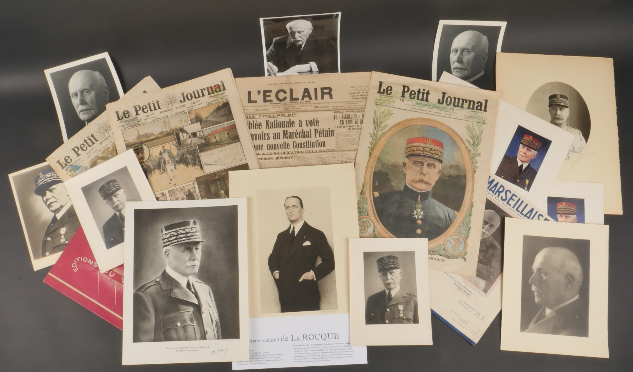 Lot de portraits du Maréchal. Comprenant onze portraits papier du Maréchal Pétain de plusieurs tailles dont un lorsqu’il est général, dix sous Vichy dont deux en couleurs. On y joint Hymne nationale la marseillaise sous Pétain, une partition de Maréchal nous voilà aux éditions vers luisant, le petit journal du 9 avril 1916 ainsi qu’un journal l’Eclair du 11 juillet 1940 concernant les pleins pouvoirs du Maréchal. Une photo du colonel de La Rocque. Lot of portraits of the Marshal. Including eleven paper portraits of Marshal Pétain in various sizes, one from his time as general and ten from the Vichy period, two in color. Also includes Hymne national – La Marseillaise sous Pétain, a Maréchal nous voilà score Vers Luisant editions, Le Petit Journal 9 April 1916, and L’Éclair 11 July 1940 reporting on Pétain’s full powers. One photo of Colonel de La Rocque.