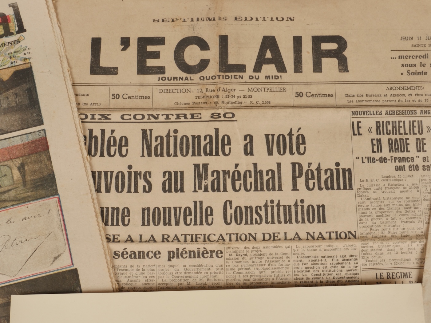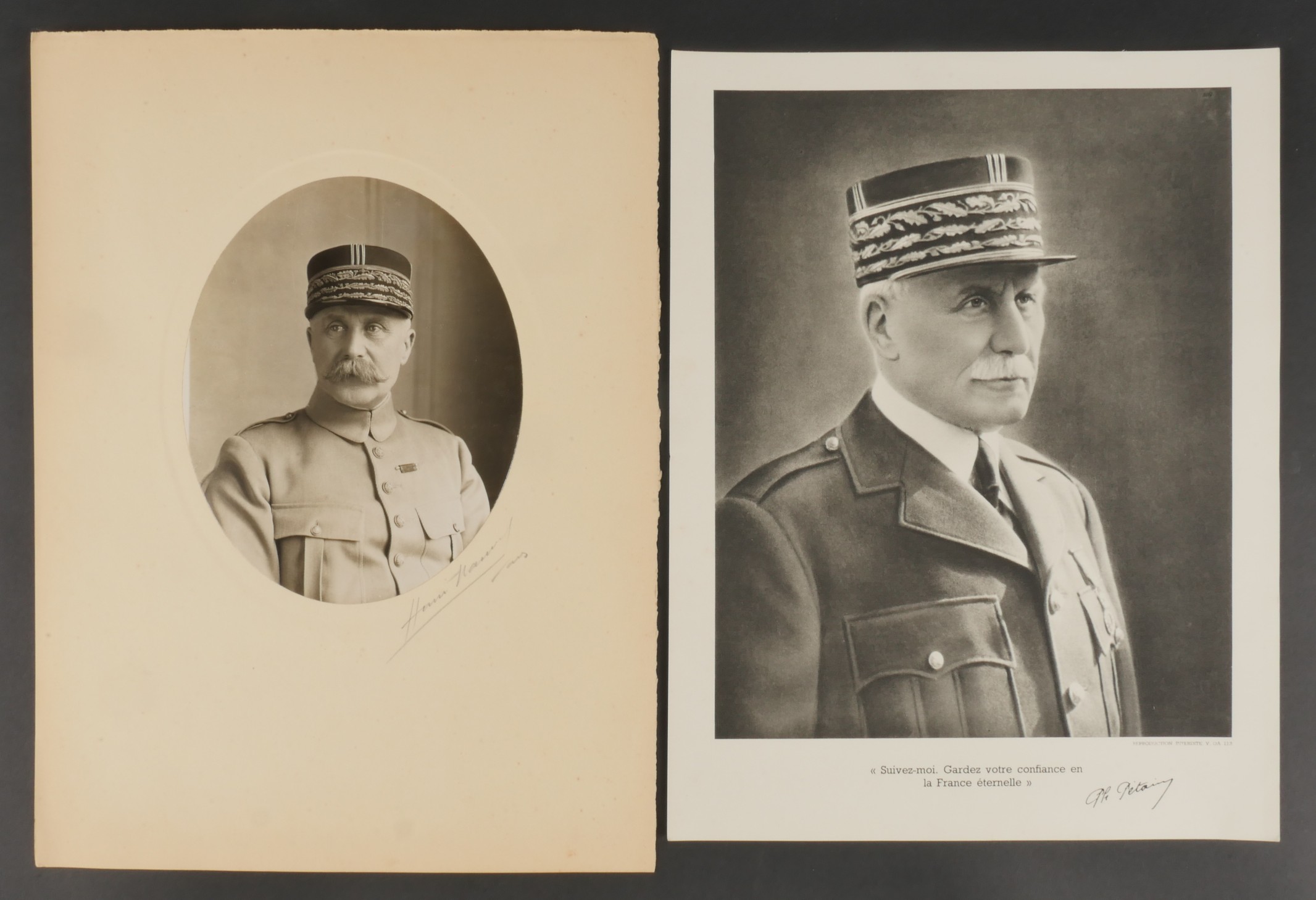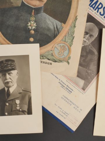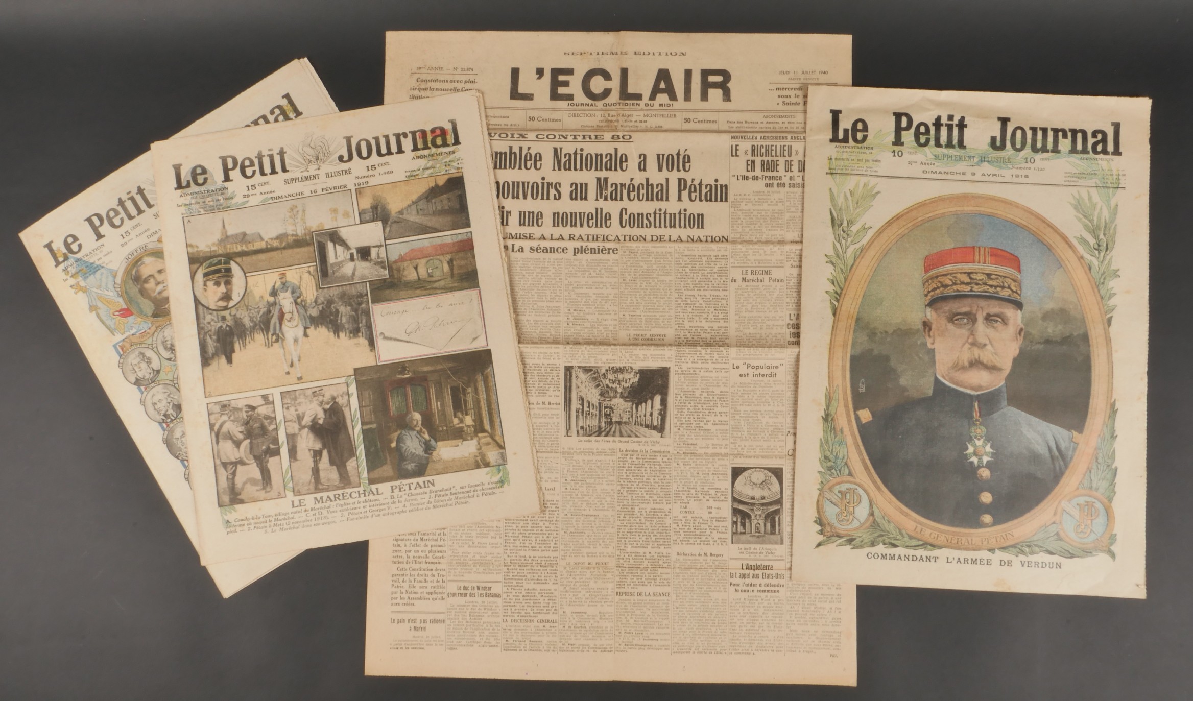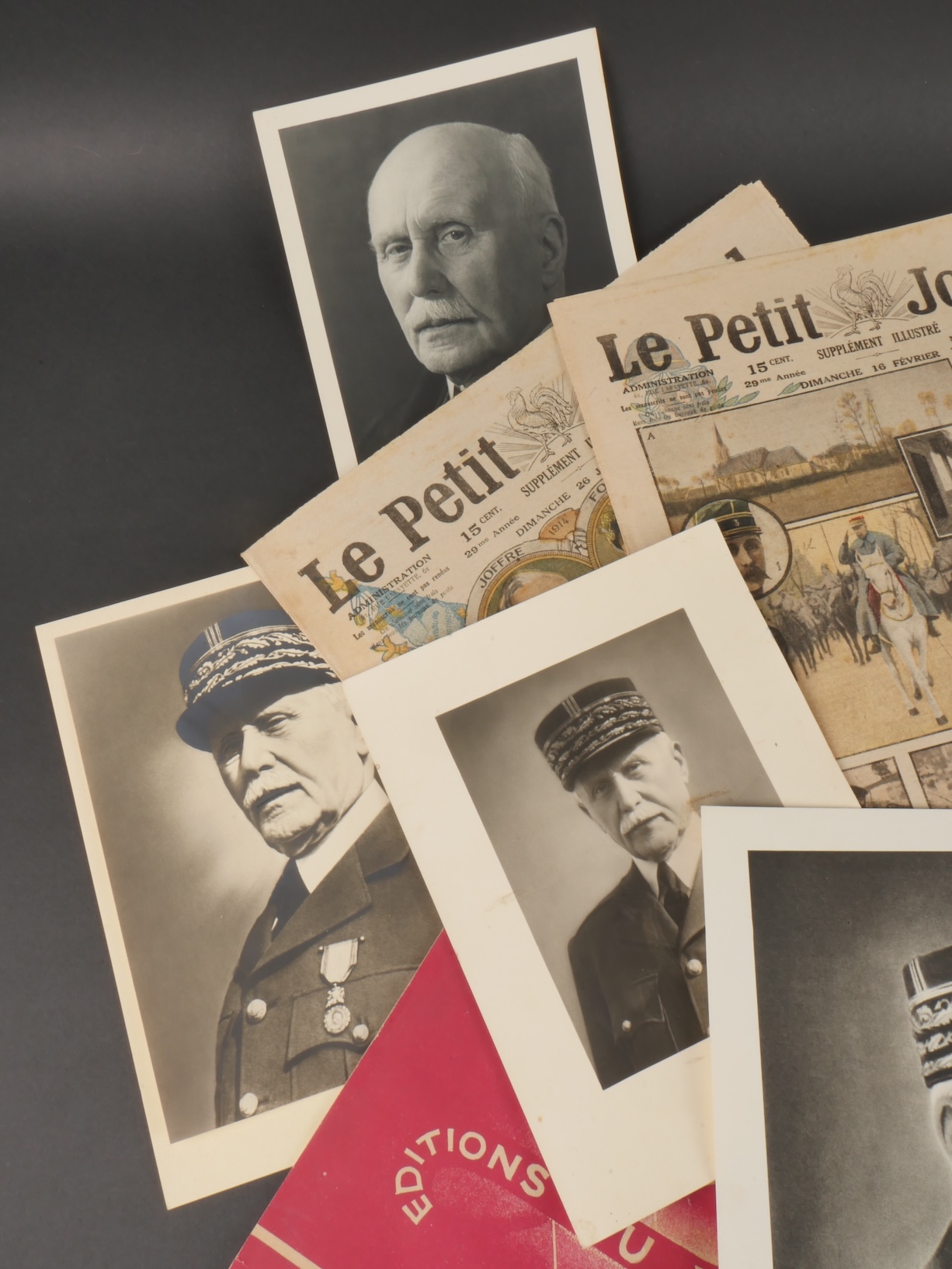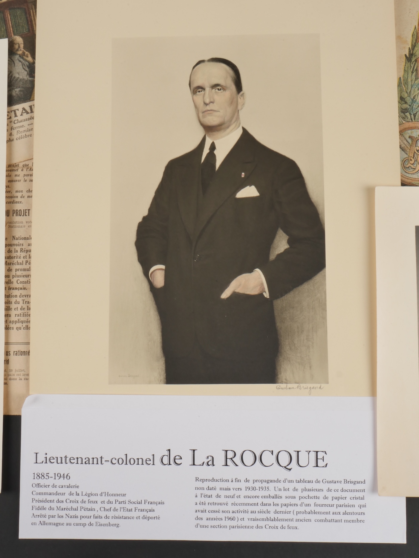 Lot de portraits du Maréchal. Comprenant onze portraits papier du Maréchal Pétain de plusieurs tailles dont un lorsqu’il est général, dix sous Vichy dont deux en couleurs. On y joint Hymne nationale la marseillaise sous Pétain, une partition de Maréchal nous voilà aux éditions vers luisant, le petit journal du 9 avril 1916 ainsi qu’un journal l’Eclair du 11 juillet 1940 concernant les pleins pouvoirs du Maréchal. Une photo du colonel de La Rocque. Lot of portraits of the Marshal. Including eleven paper portraits of Marshal Pétain in various sizes, one from his time as general and ten from the Vichy period, two in color. Also includes Hymne national – La Marseillaise sous Pétain, a Maréchal nous voilà score Vers Luisant editions, Le Petit Journal 9 April 1916, and L’Éclair 11 July 1940 reporting on Pétain’s full powers. One photo of Colonel de La Rocque.