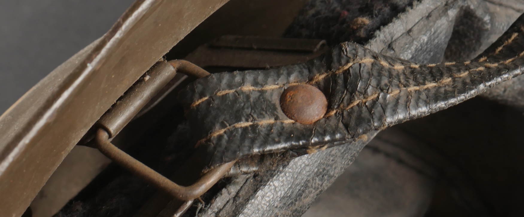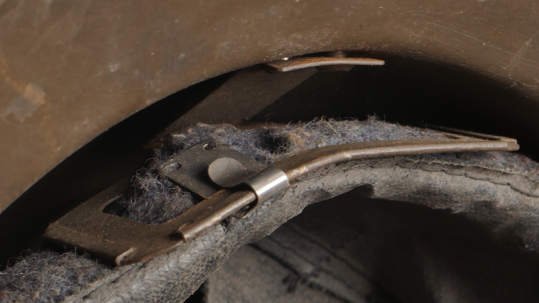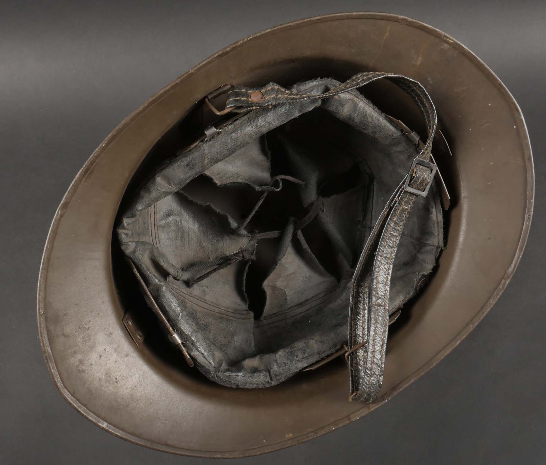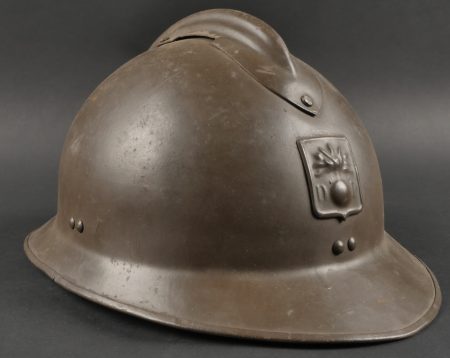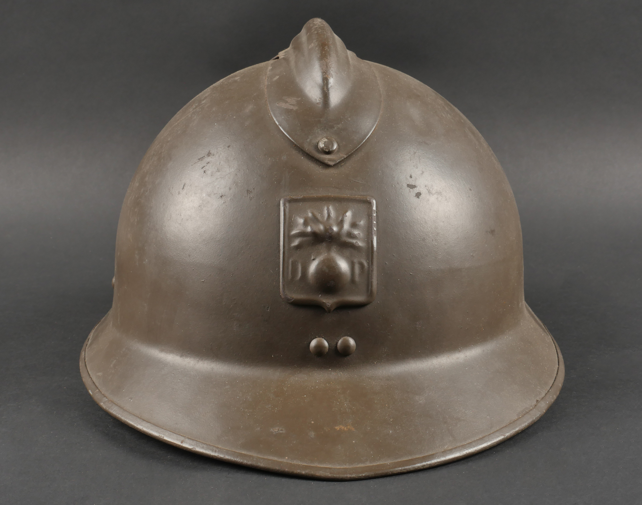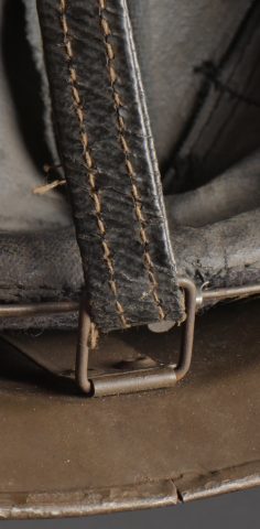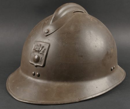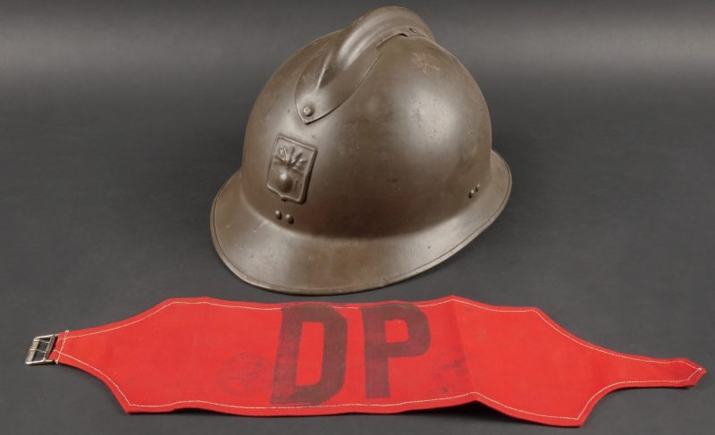 Lot Défense Passive. Comprenant un casque modèle 1926 en peinture kaki à 95%, attribut de la défense passive, coiffe à six dents de loup en toile cirée retenue par quatre agrafes. Nuquière... en savoir plus