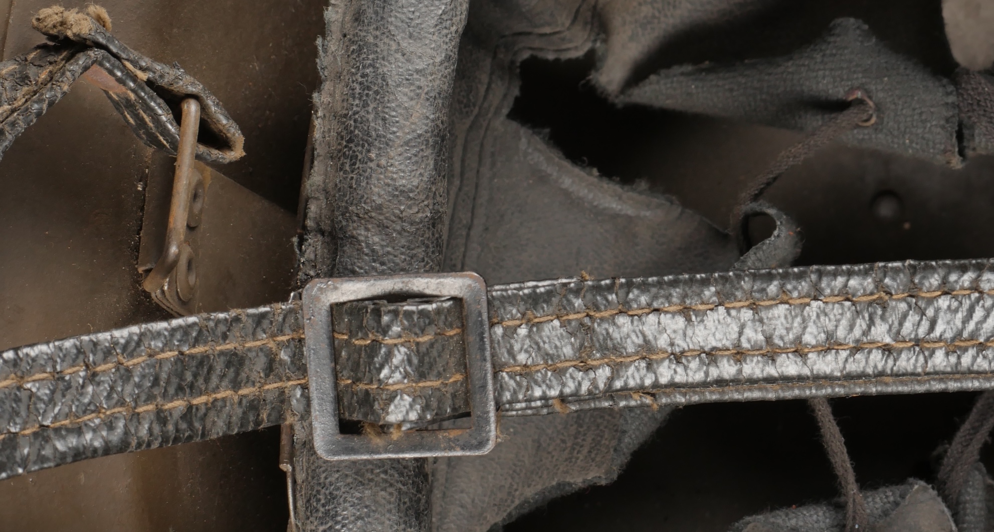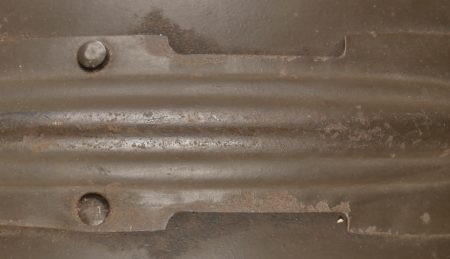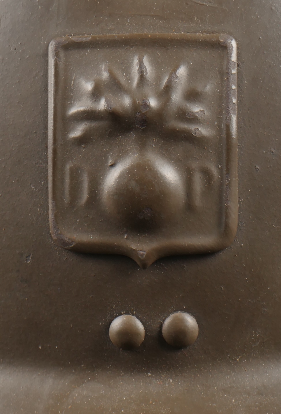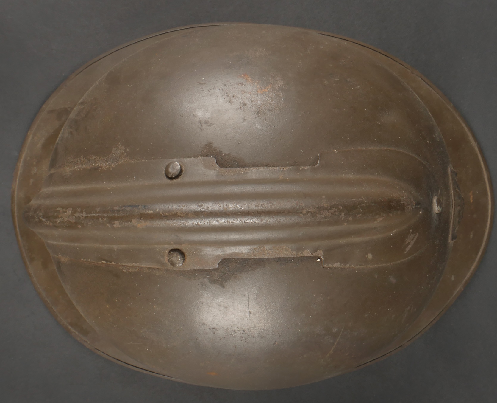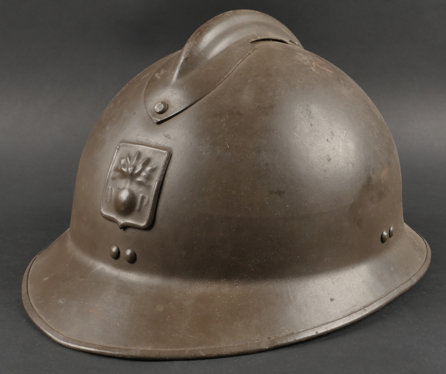 Lot Défense Passive. Comprenant un casque modèle 1926 en peinture kaki à 95%, attribut de la défense passive, coiffe à six dents de loup en toile cirée retenue par quatre agrafes. Nuquière... en savoir plus
