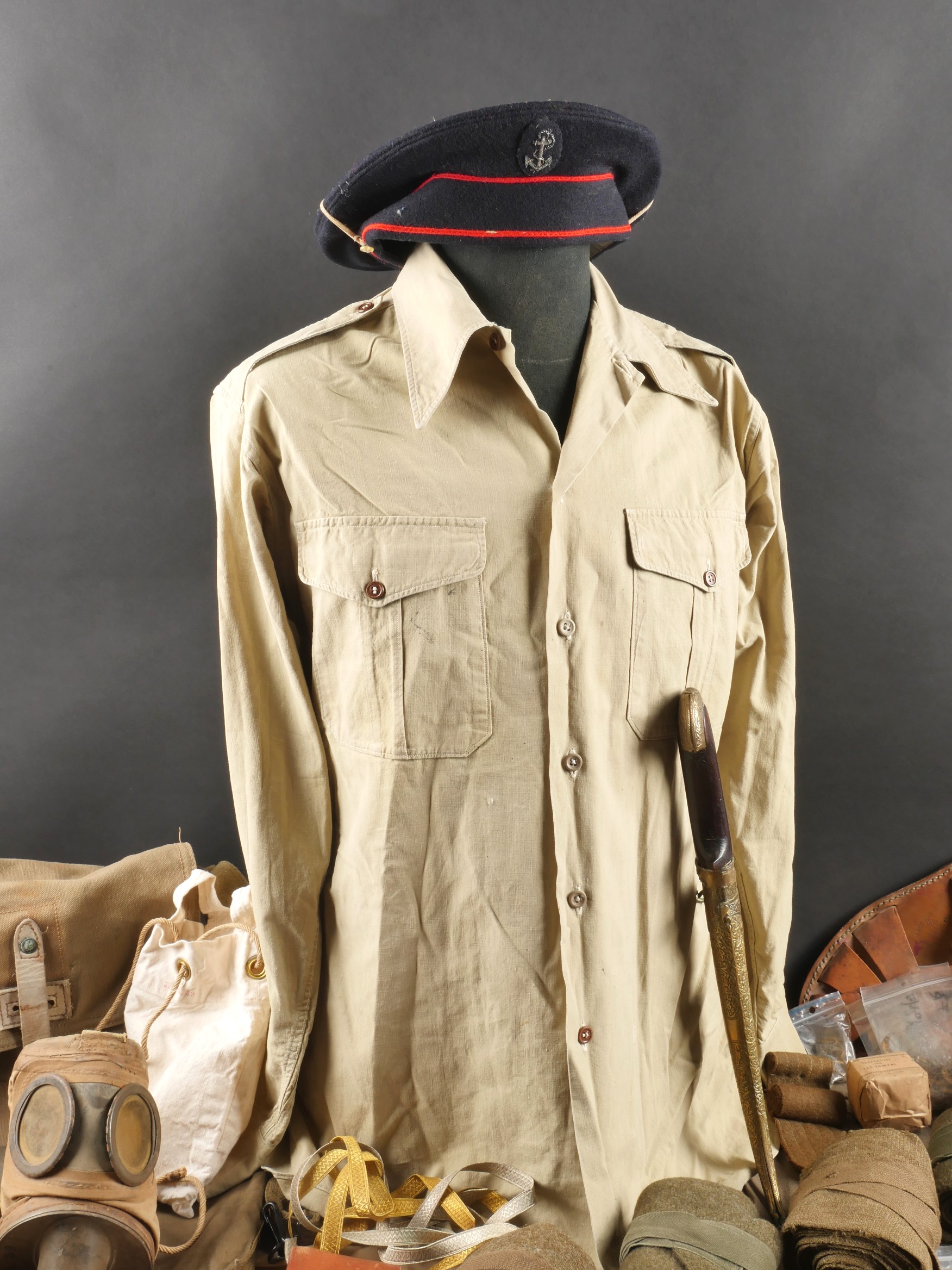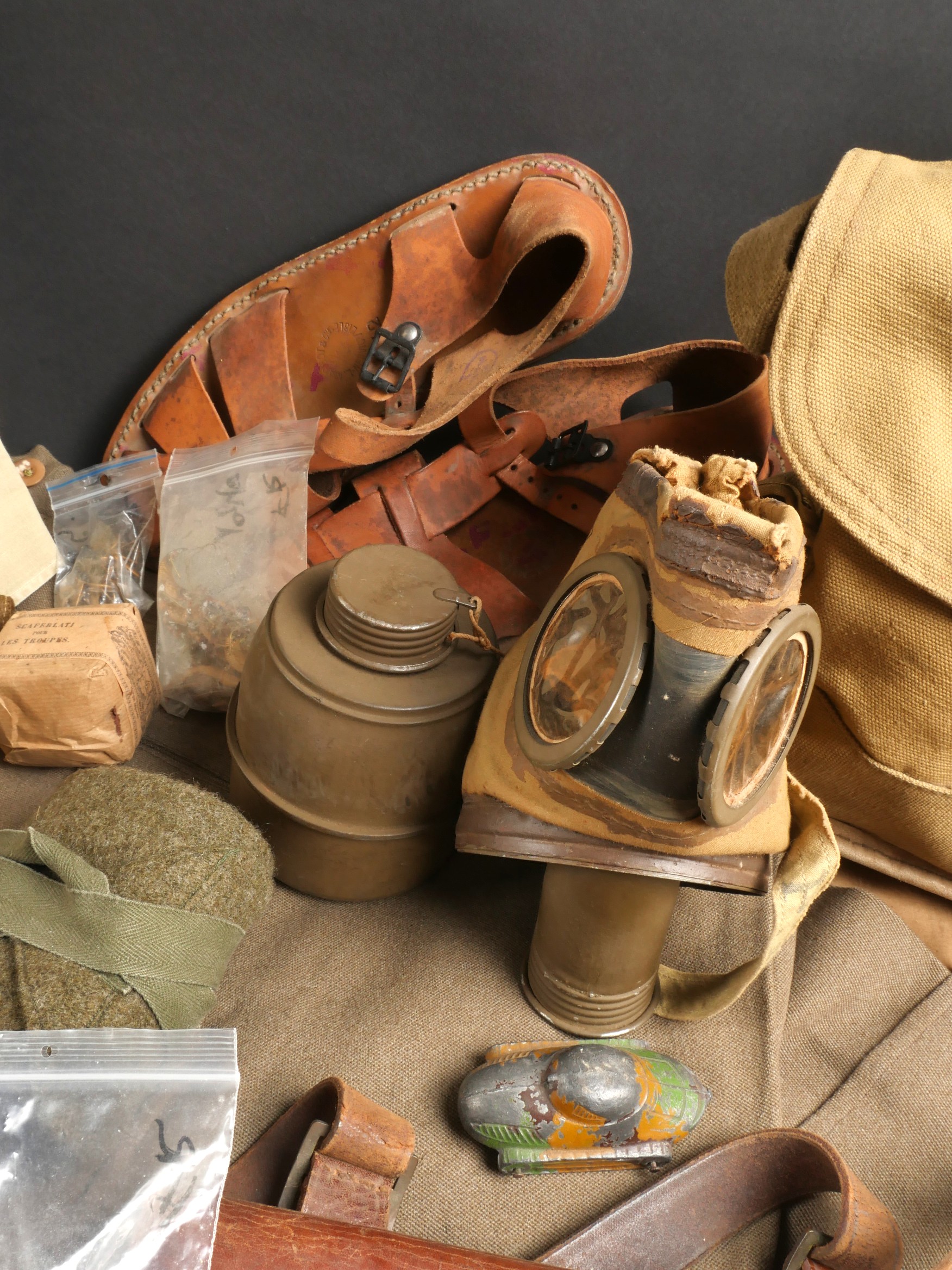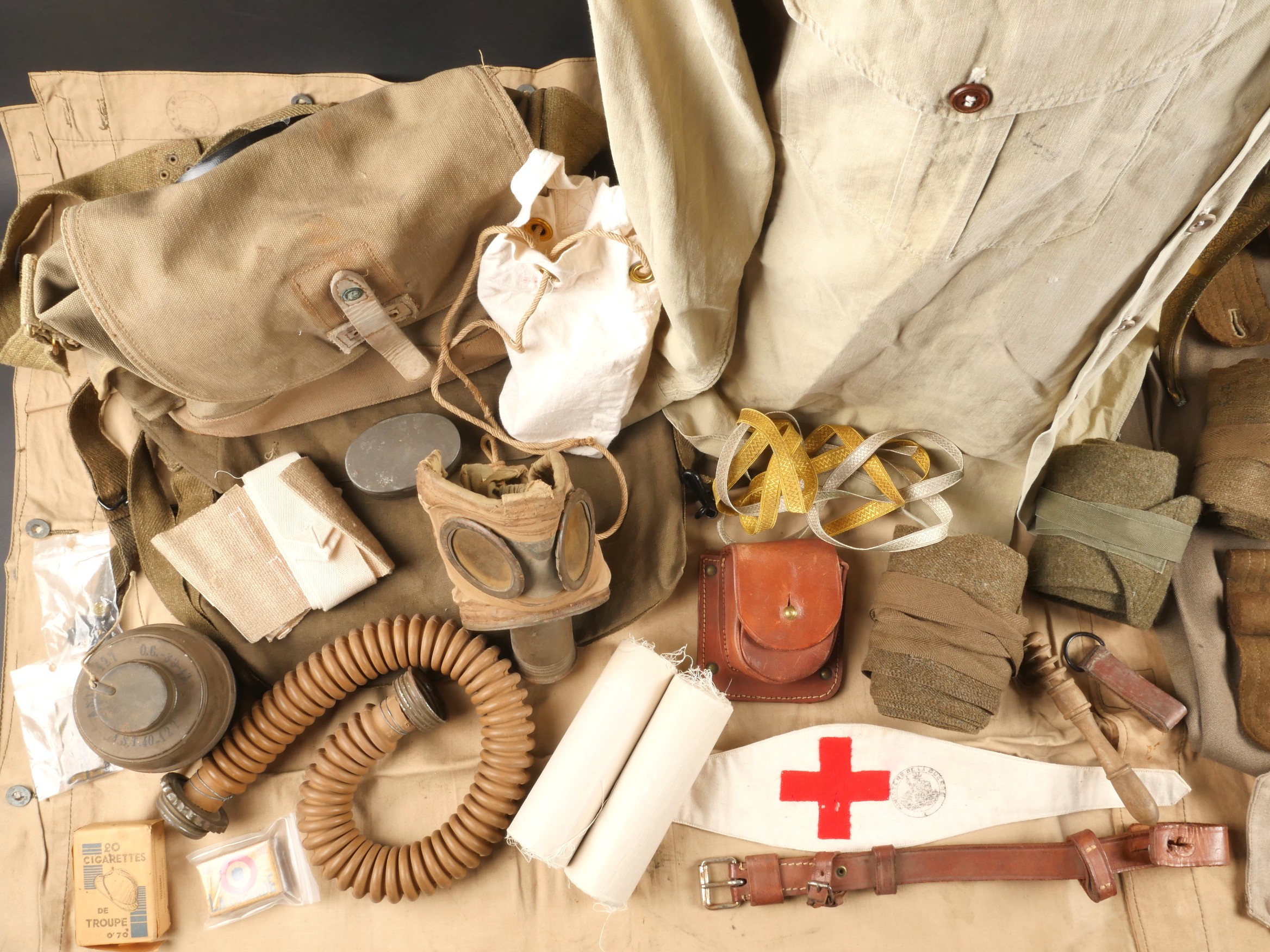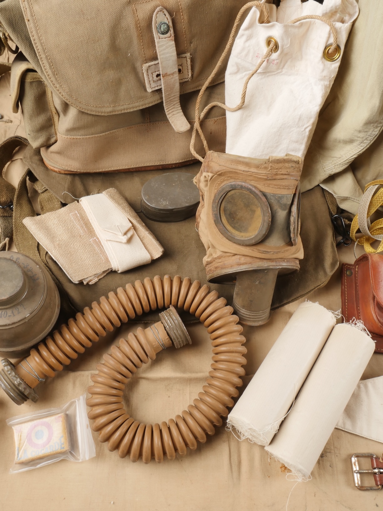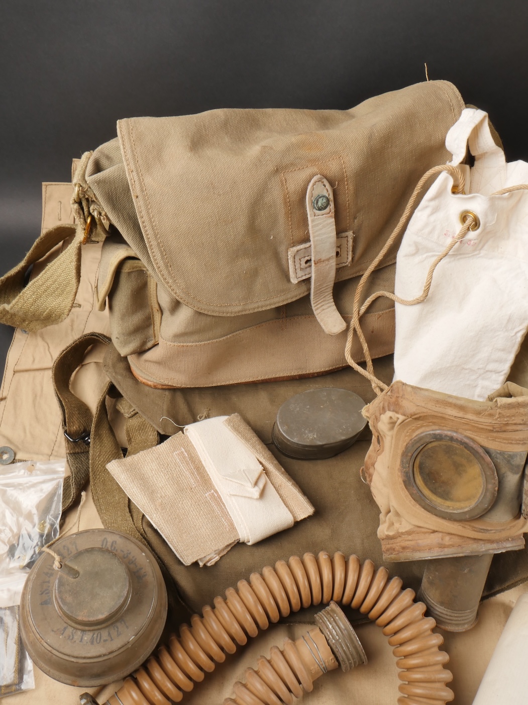 Lot d’équipements France 40. Comprenant un masque anti gaz ANP31, masque en bon état, tuyau souple, cartouche datée 1940, sacoche datée 1939. Un second ANP3, masque un peu sec, tuyau... en savoir plus