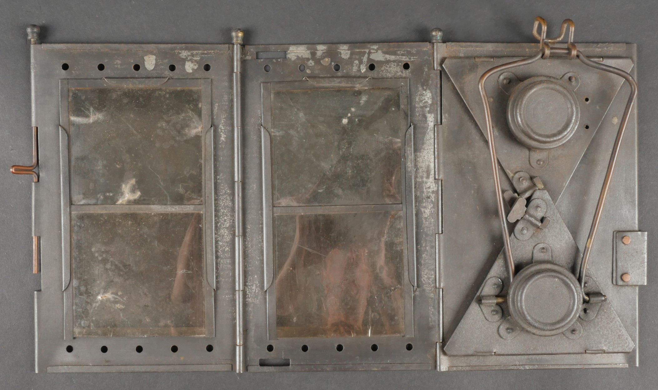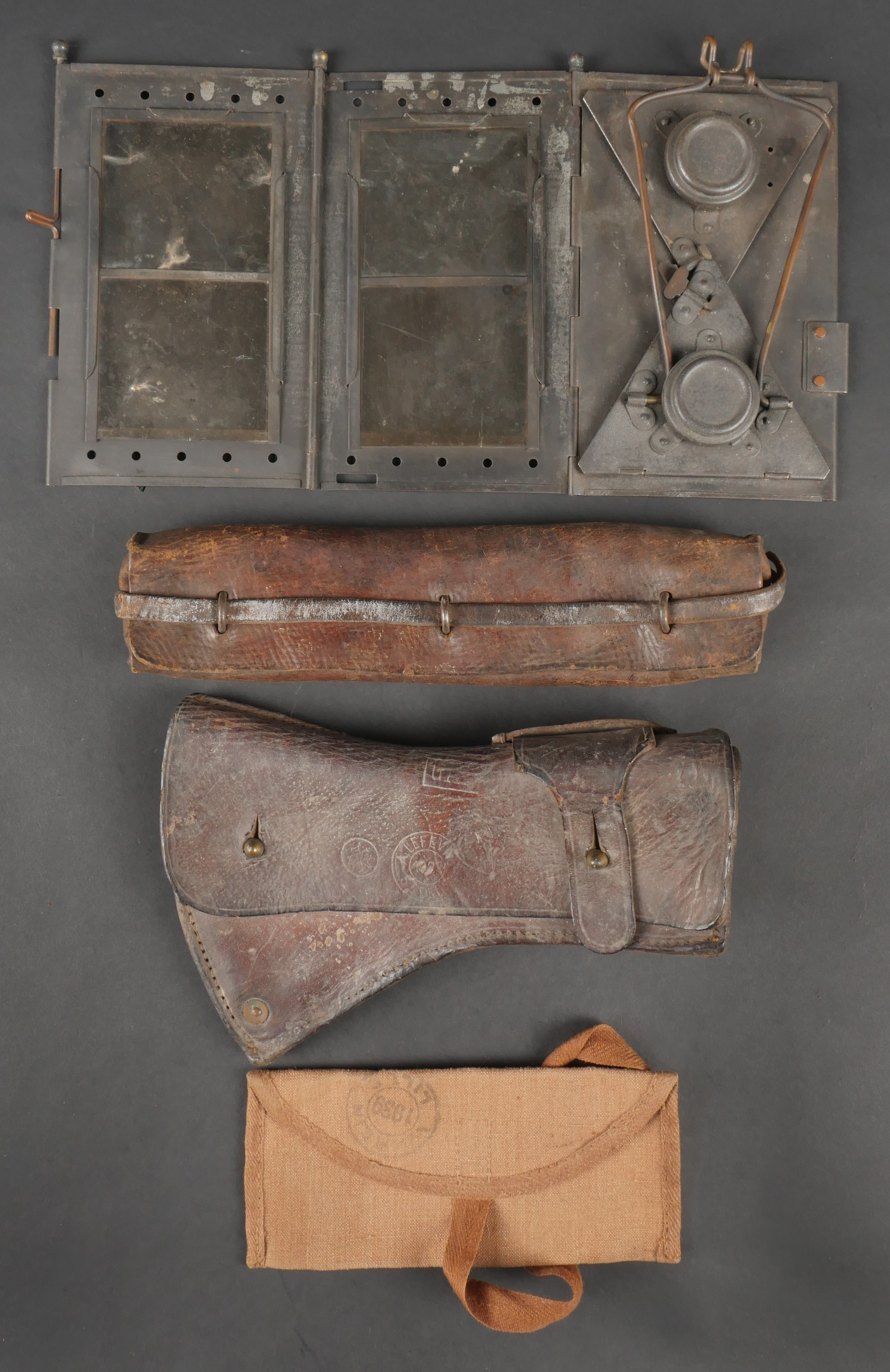 Lot d’équipements France 40. Comprenant une lanterne type Montjardet avec ses plaques et son système de fermeture fonctionnel. Une trousse à couture en toile cachou datée 1939. Un étui... en savoir plus