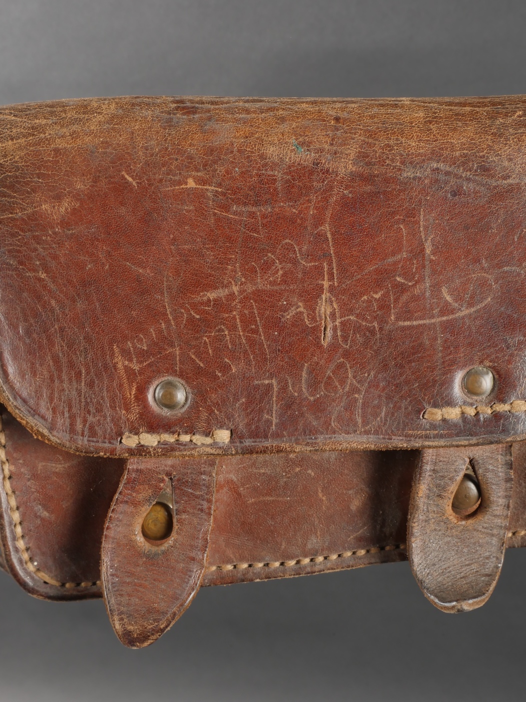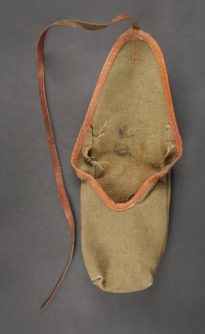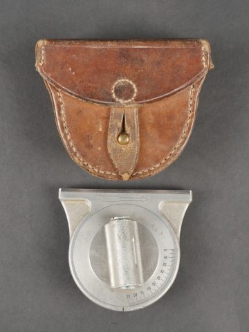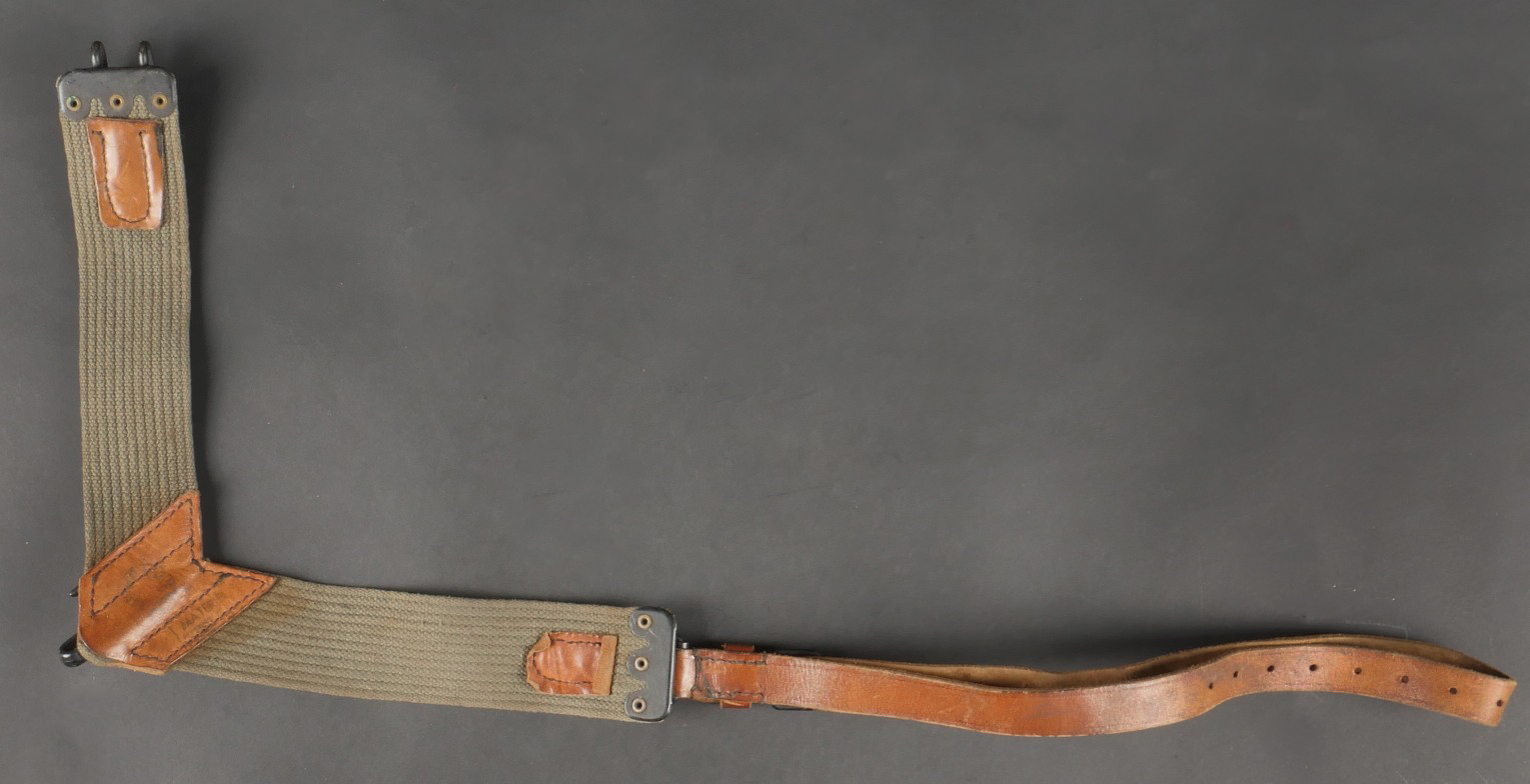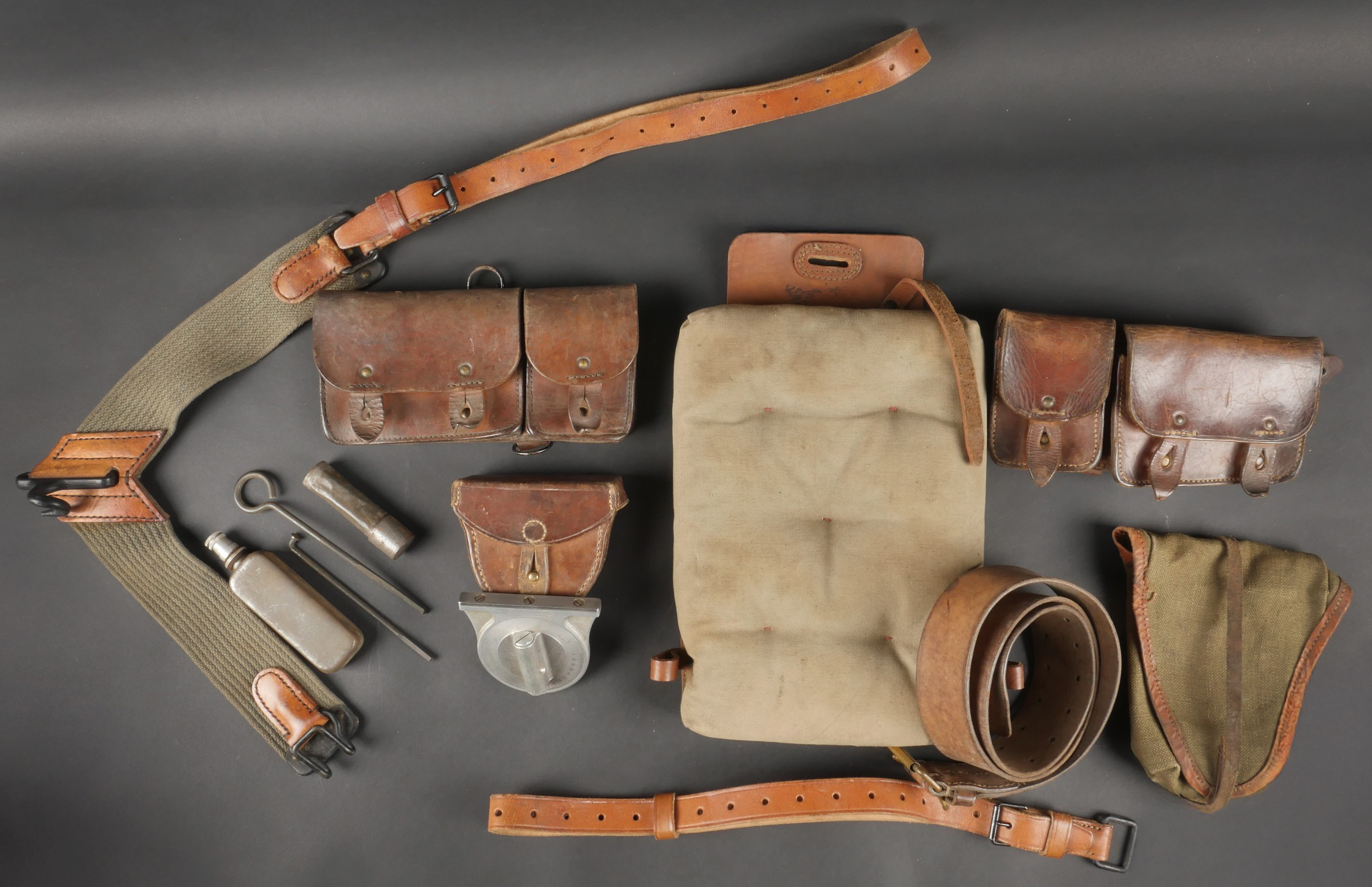 Lot d’équipements France 40. Une paire de cartouchières en cuir modèle 193537, côté droit à marquage illisible, petite patte de maintien cousue d’origine, côté gauche à marquage illisible, complète avec son téton. Un ceinturon 1903 daté 1930, un passant absent. Un système de portage de la plaque de base pour le mortier modèle 192731 de 81mm. Un niveau de pointage mortier dans son étui. Une housse de nécessaire 2429 avec la burette à huile et deux chasse goupilles. Lot of France 40 equipment A pair of leather cartridge pouches model 193537 right side with illegible marking small original retaining strap left side with illegible marking complete with stud. A 1903 belt dated 1930 with one loop missing. A base plate carrying system for 81 mm mortar model 192731 a mortar sight level in its case and a 2429 maintenance kit pouch with oil bottle and two pin punches.