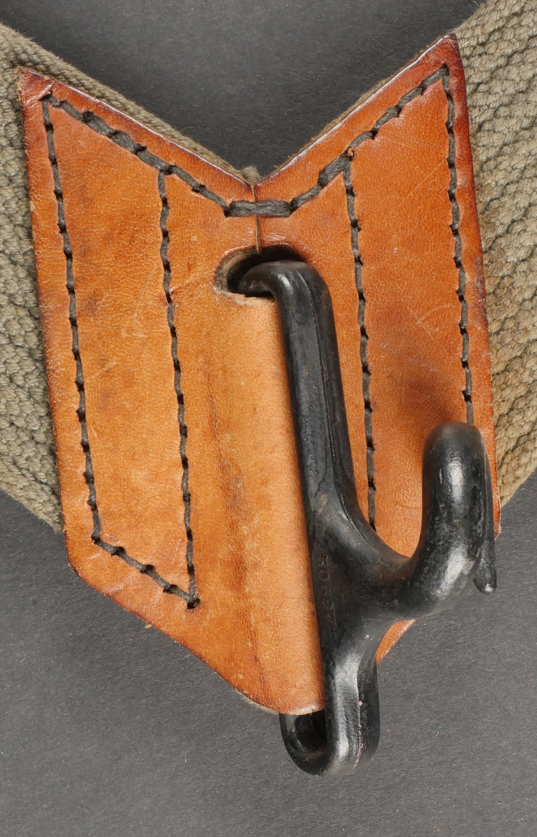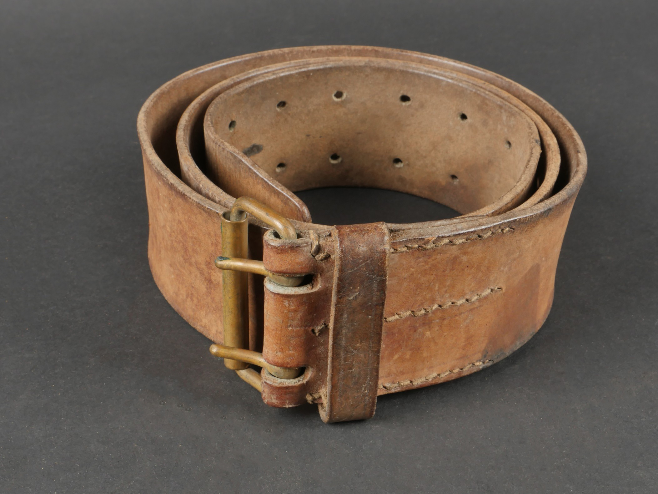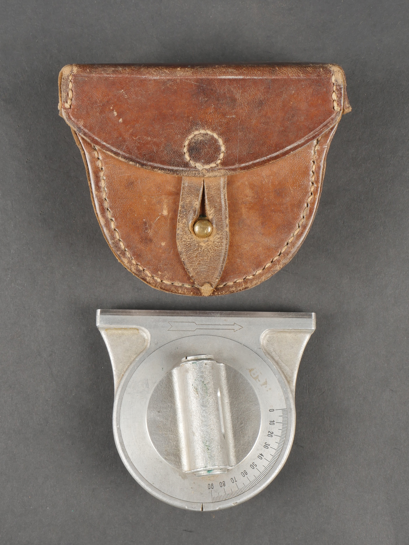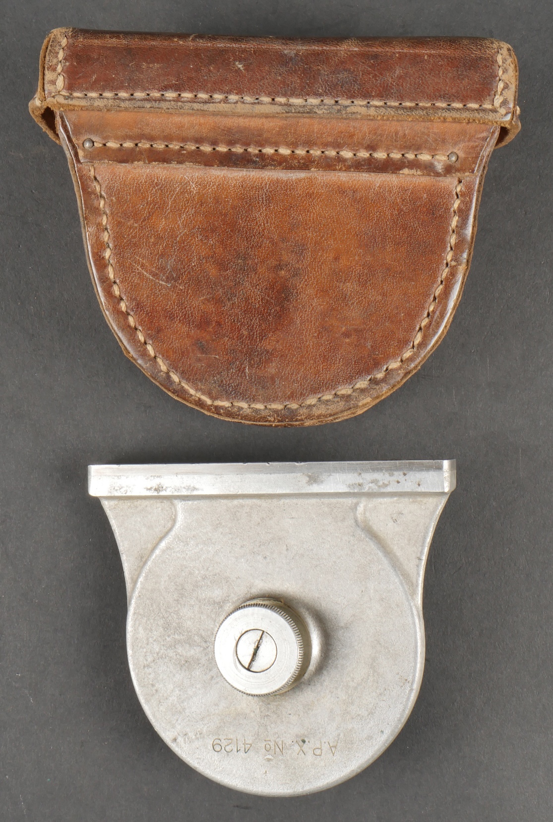 Lot d’équipements France 40. Une paire de cartouchières en cuir modèle 193537, côté droit à marquage illisible, petite patte de maintien cousue d’origine, côté gauche à marquage illisible, complète avec son téton. Un ceinturon 1903 daté 1930, un passant absent. Un système de portage de la plaque de base pour le mortier modèle 192731 de 81mm. Un niveau de pointage mortier dans son étui. Une housse de nécessaire 2429 avec la burette à huile et deux chasse goupilles. Lot of France 40 equipment A pair of leather cartridge pouches model 193537 right side with illegible marking small original retaining strap left side with illegible marking complete with stud. A 1903 belt dated 1930 with one loop missing. A base plate carrying system for 81 mm mortar model 192731 a mortar sight level in its case and a 2429 maintenance kit pouch with oil bottle and two pin punches.