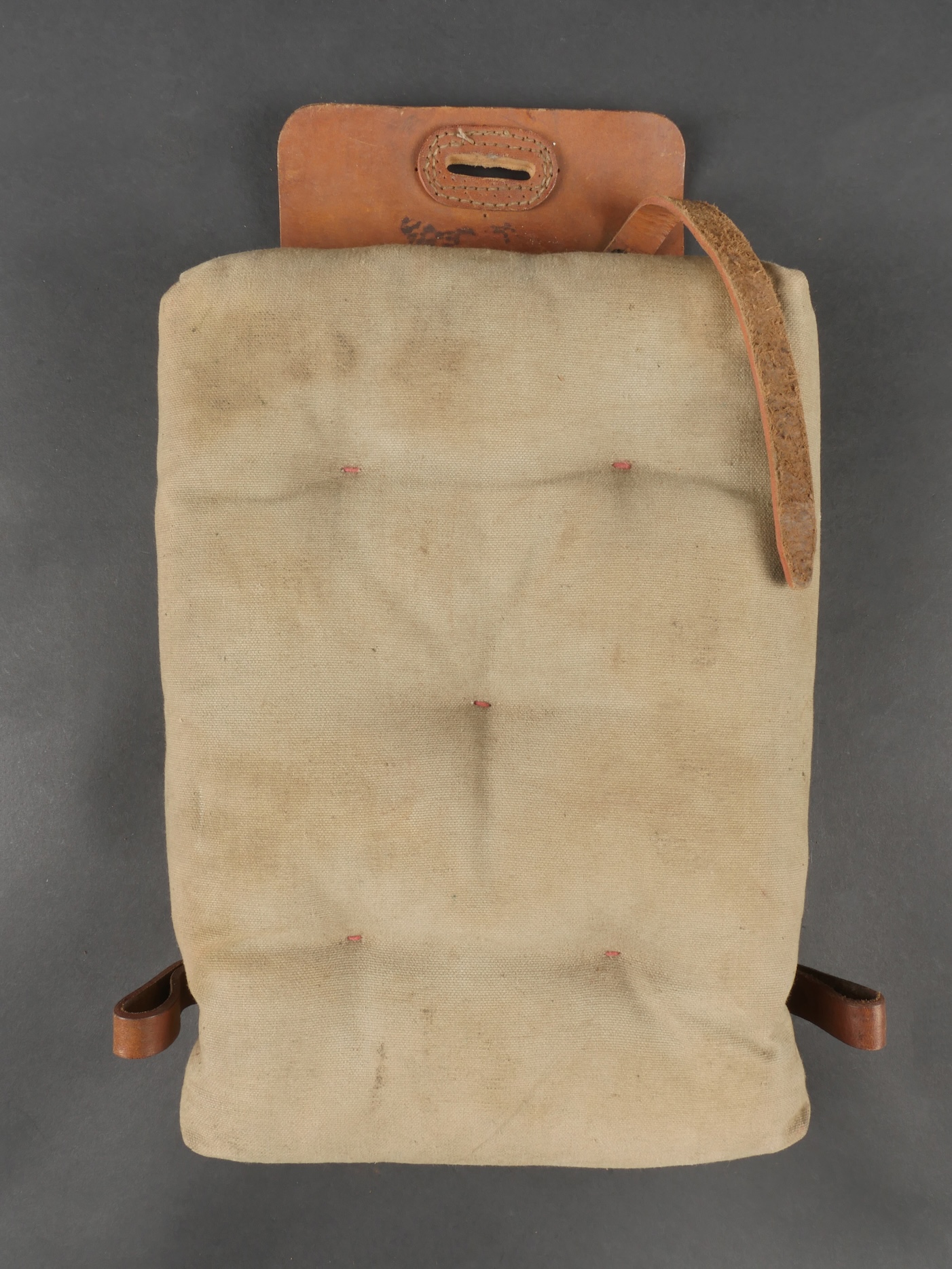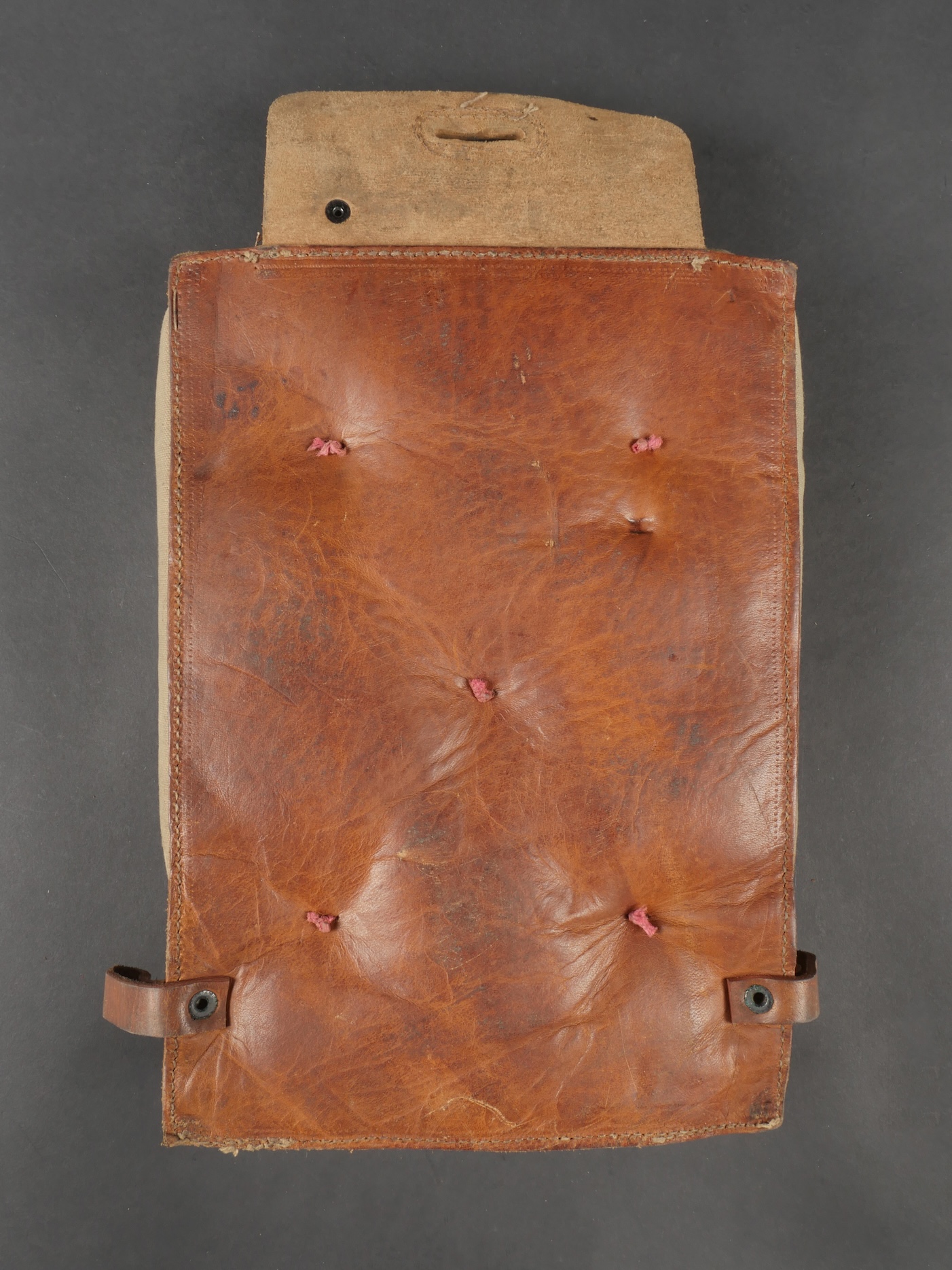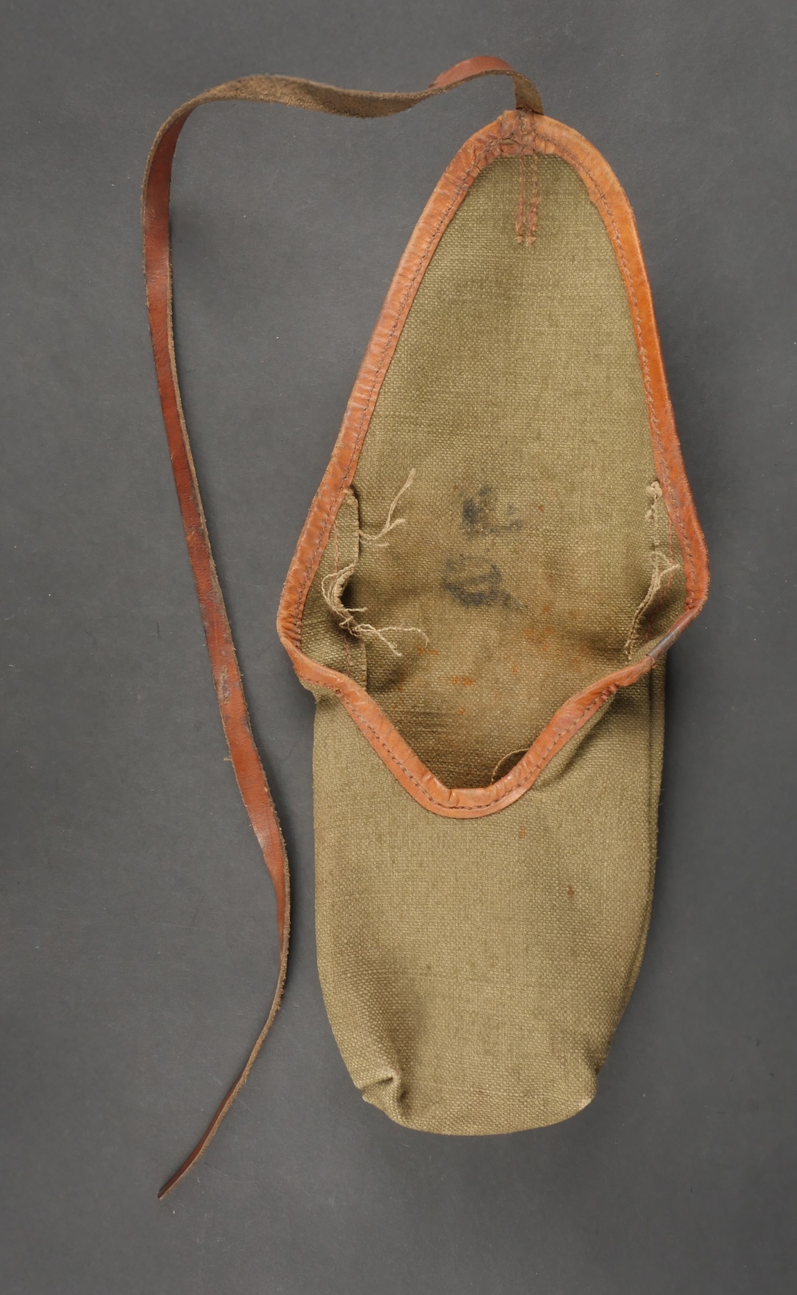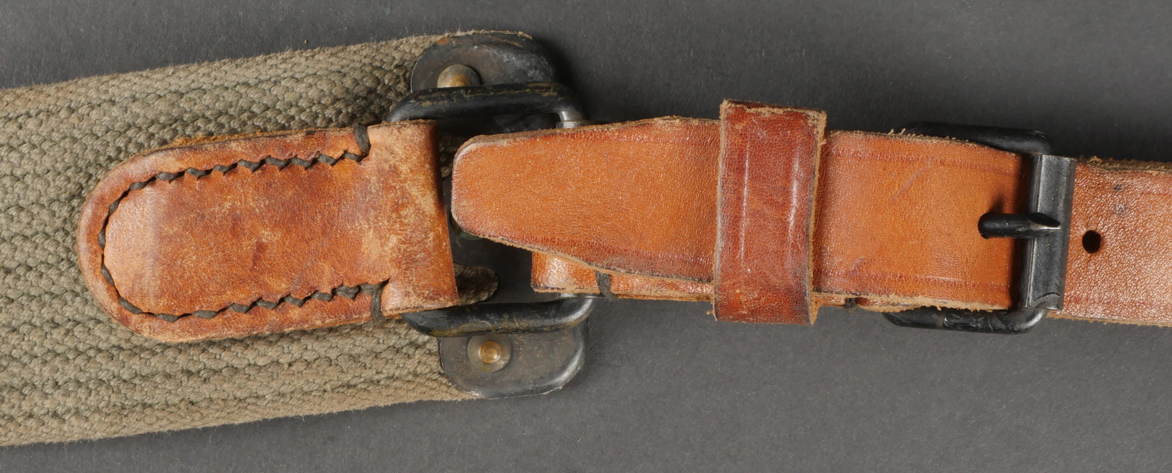 Lot d’équipements France 40. Une paire de cartouchières en cuir modèle 193537, côté droit à marquage illisible, petite patte de maintien cousue d’origine, côté gauche à marquage illisible, complète avec son téton. Un ceinturon 1903 daté 1930, un passant absent. Un système de portage de la plaque de base pour le mortier modèle 192731 de 81mm. Un niveau de pointage mortier dans son étui. Une housse de nécessaire 2429 avec la burette à huile et deux chasse goupilles. Lot of France 40 equipment A pair of leather cartridge pouches model 193537 right side with illegible marking small original retaining strap left side with illegible marking complete with stud. A 1903 belt dated 1930 with one loop missing. A base plate carrying system for 81 mm mortar model 192731 a mortar sight level in its case and a 2429 maintenance kit pouch with oil bottle and two pin punches.
