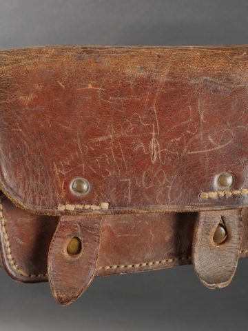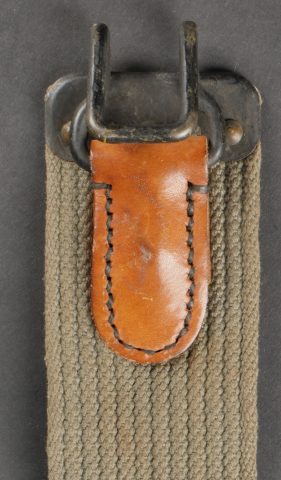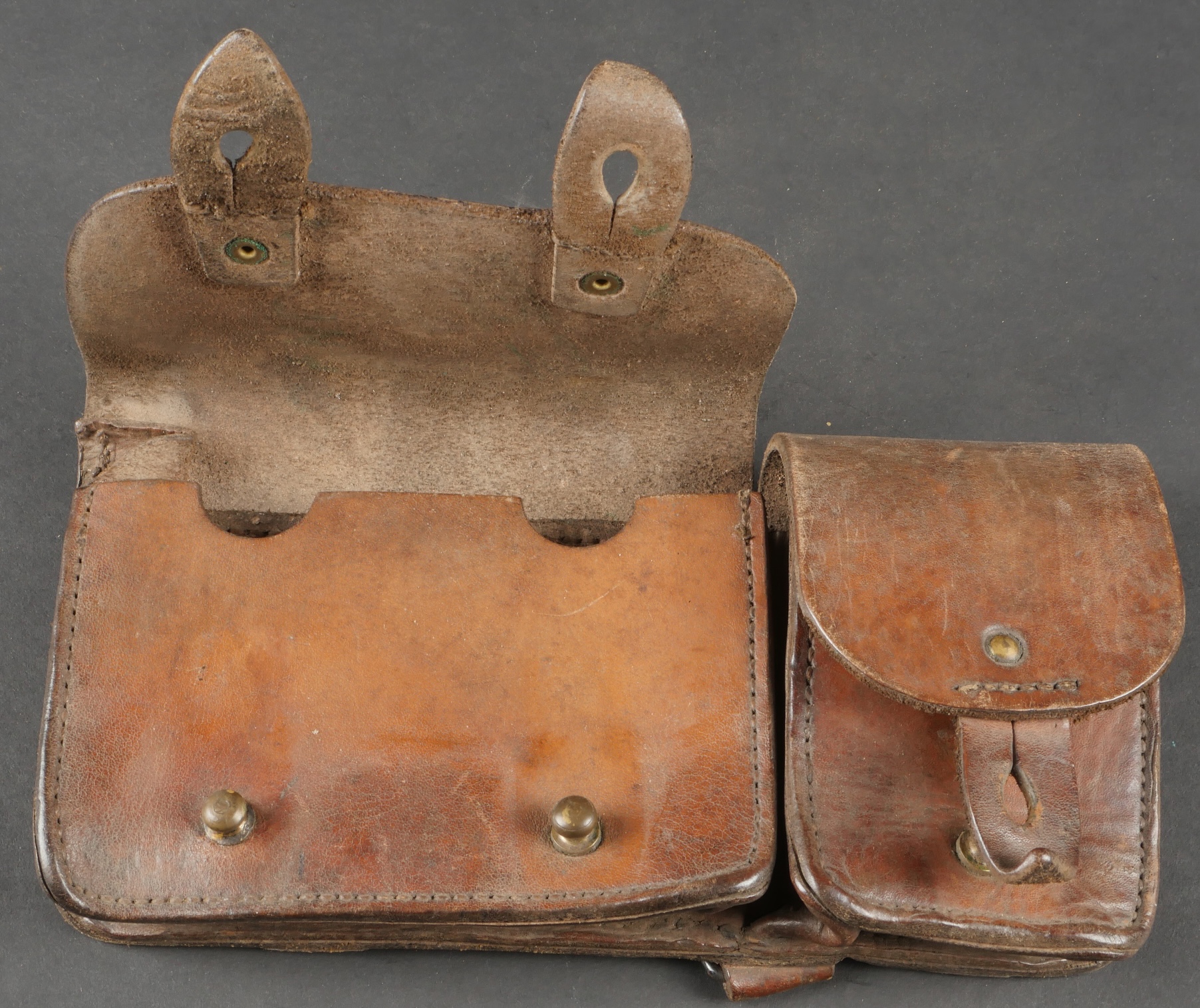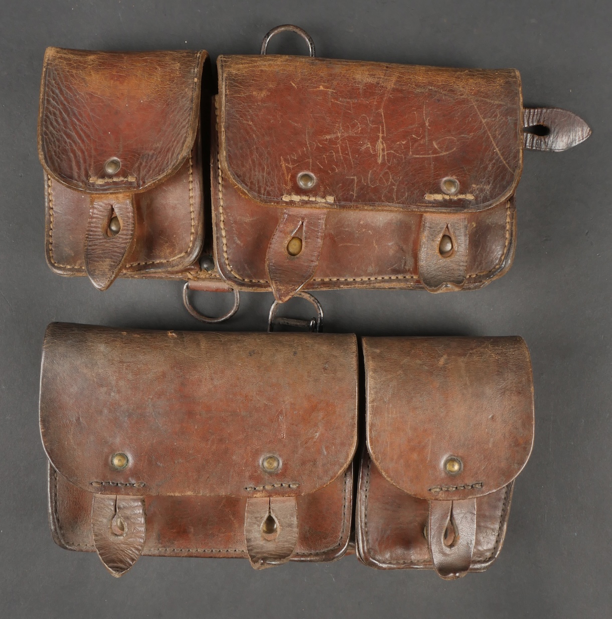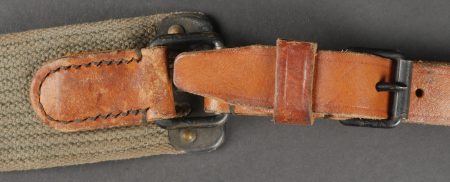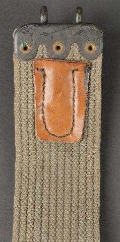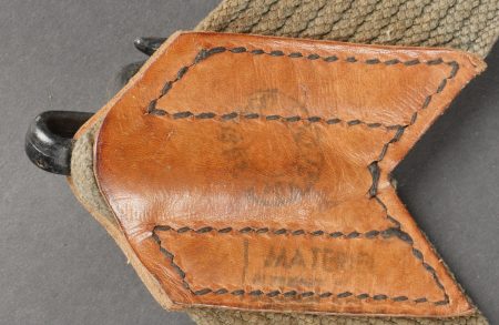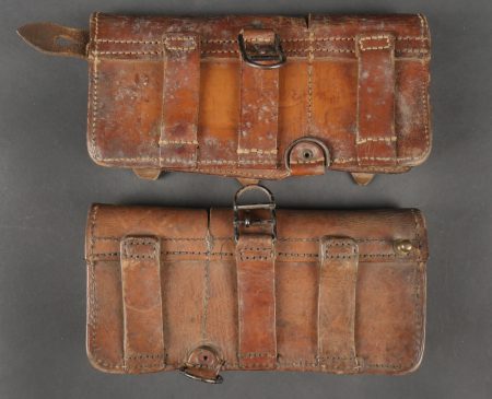 Lot d’équipements France 40. Une paire de cartouchières en cuir modèle 193537, côté droit à marquage illisible, petite patte de maintien cousue d’origine, côté gauche à... en savoir plus