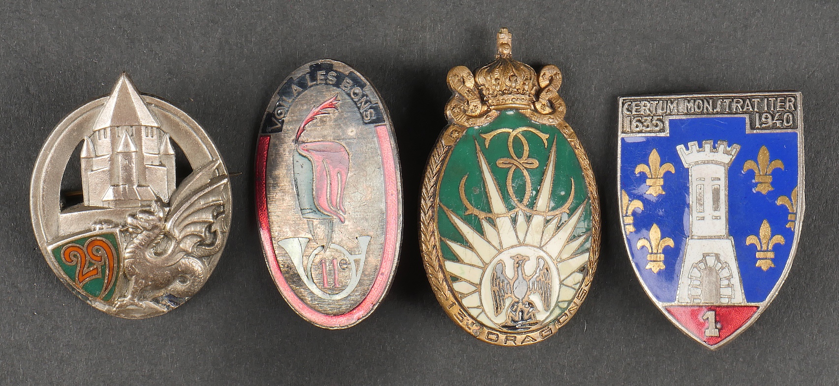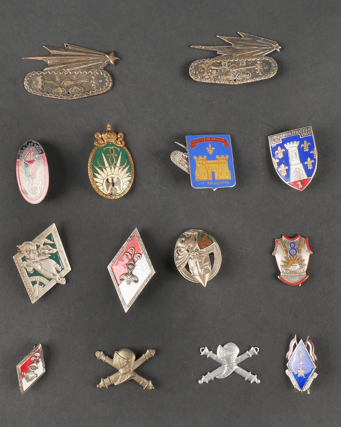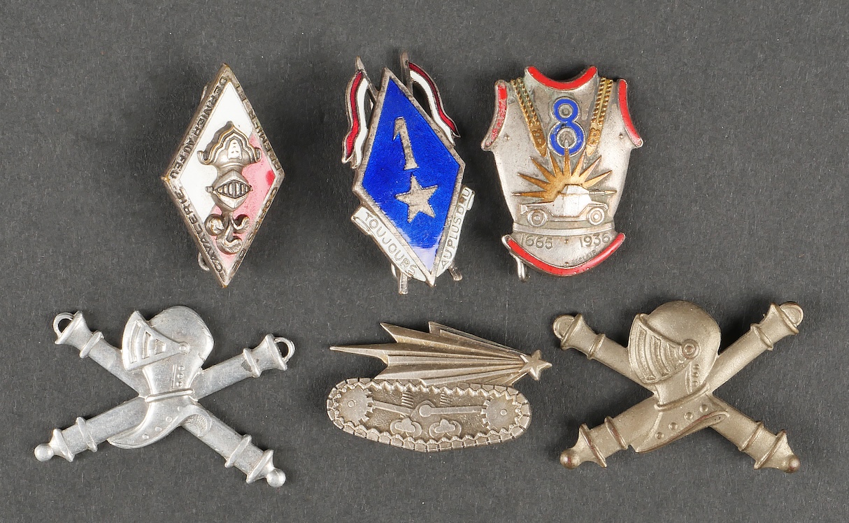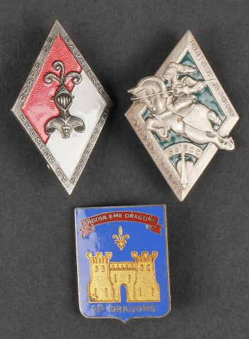 Lot d’insignes cavalerie. Comprenant un insigne du 13ème RDP de fabrication Arthus Bertrand. Un insigne du 29ème dragon de fabrication Arthus Bertrand. Un insigne du 8ème cuirassier de... en savoir plus