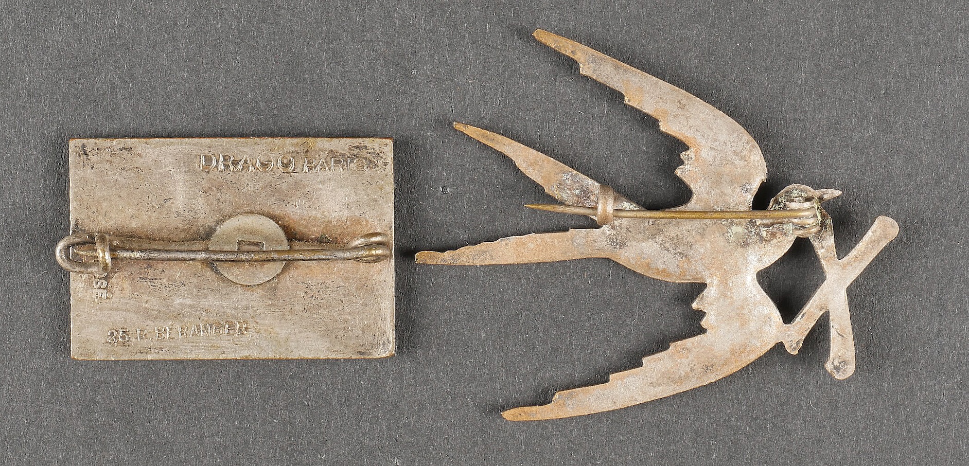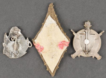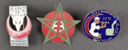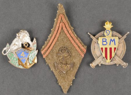 Lot d’insignes troupes d’Afrique. Comprenant un insigne du 1er RTA en laiton embouti. Un insigne du parc divisionnaire d’artillerie 80 1ère DIM, croissant rouge, attache à vis. Un insigne du 4ème RTS de fabrication Drago Béranger, attache ressoudée. Un insigne du 11ème zouave de fabrication Arthus Bertrand. Un insigne du groupe sanitaire divisionnaire 80 1ère DIM de fabrication Fraisse Demey. Un insigne du 9ème bataillon de mitrailleurs de fabrication Drago Béranger. Un insigne du 10ème bataillon de mitrailleur de fabrication Drago Béranger. Une patte de col d’officier d’infanterie coloniale. Lot of African troops insignia Including a 1st RTA badge in pressed brass, a divisional artillery park 80 1st DIM badge with red crescent and screw fastener, a 4th RTS badge by Drago Béranger with repaired attachment, an 11th Zouaves badge by Arthus Bertrand, a 80 1st DIM divisional medical group badge by Fraisse Demey, a 9th machinegun battalion badge by Drago Béranger, a 10th machinegun battalion badge by Drago Béranger, and a colonial infantry officer’s collar patch.