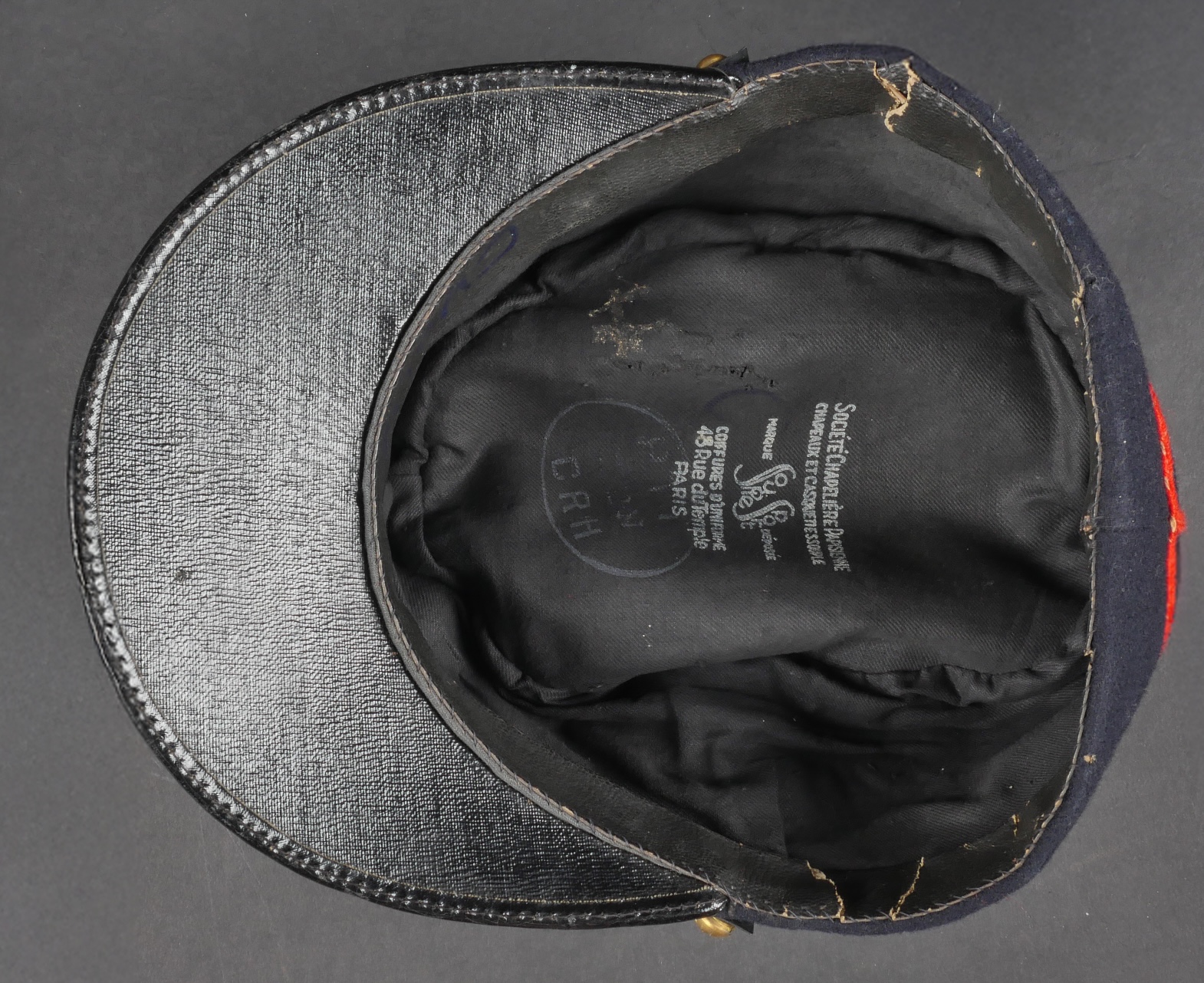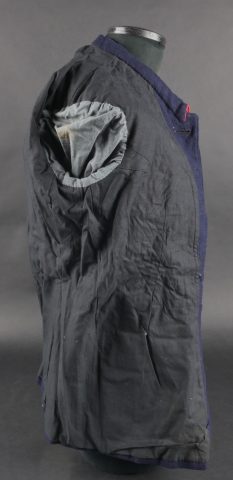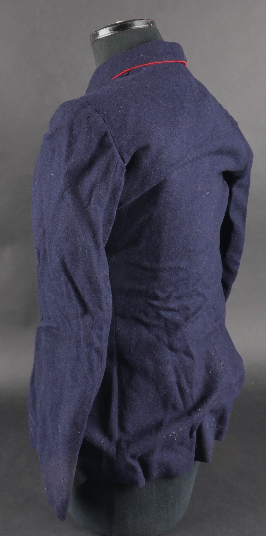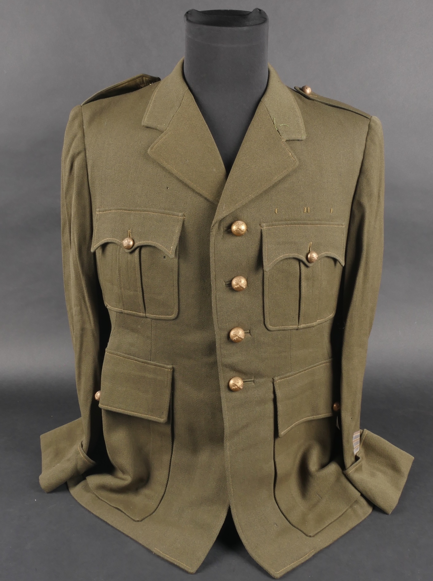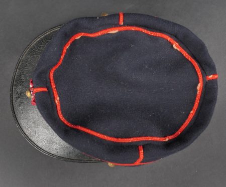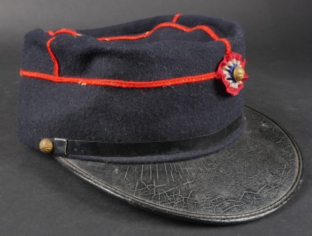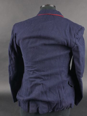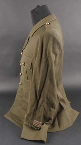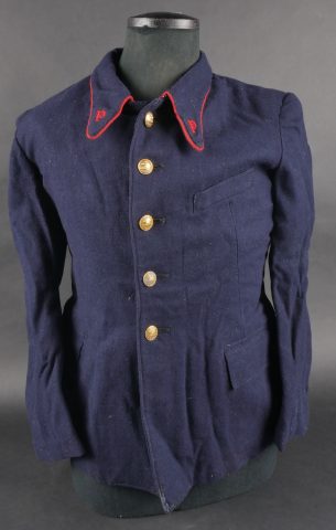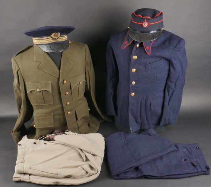 Lot d’uniformes. Comprenant une vareuse des PTT ainsi qu’un képi correspondant à cette fonction. Une vareuse d’officier d’artillerie en drap kaki de fabrication après guerre. Une culotte de cheval de fabrication armistice en drap côtelé, passants en trapèze. Une casquette de capitaine de corvette de la marine, plateau en drap bleu mité, insigne brodé en cannetille, visière cuir, étiquette du tailleur Jockey Club à Toulon, bandeau usagé. Lot of uniforms Including a postal service tunic with matching képi an artillery officer’s khaki wool tunic postwar manufacture a corduroy riding breeches armistice manufacture trapezoid loops a navy lieutenant commander’s cap with blue cloth top moth damage embroidered gold wire insignia leather visor tailor label Jockey Club Toulon worn band.