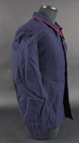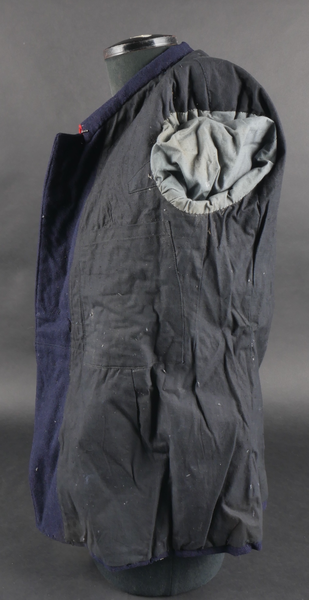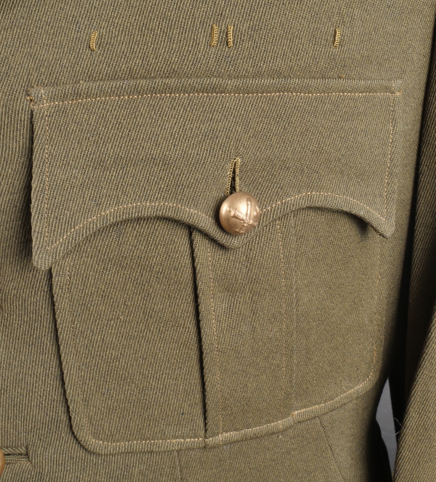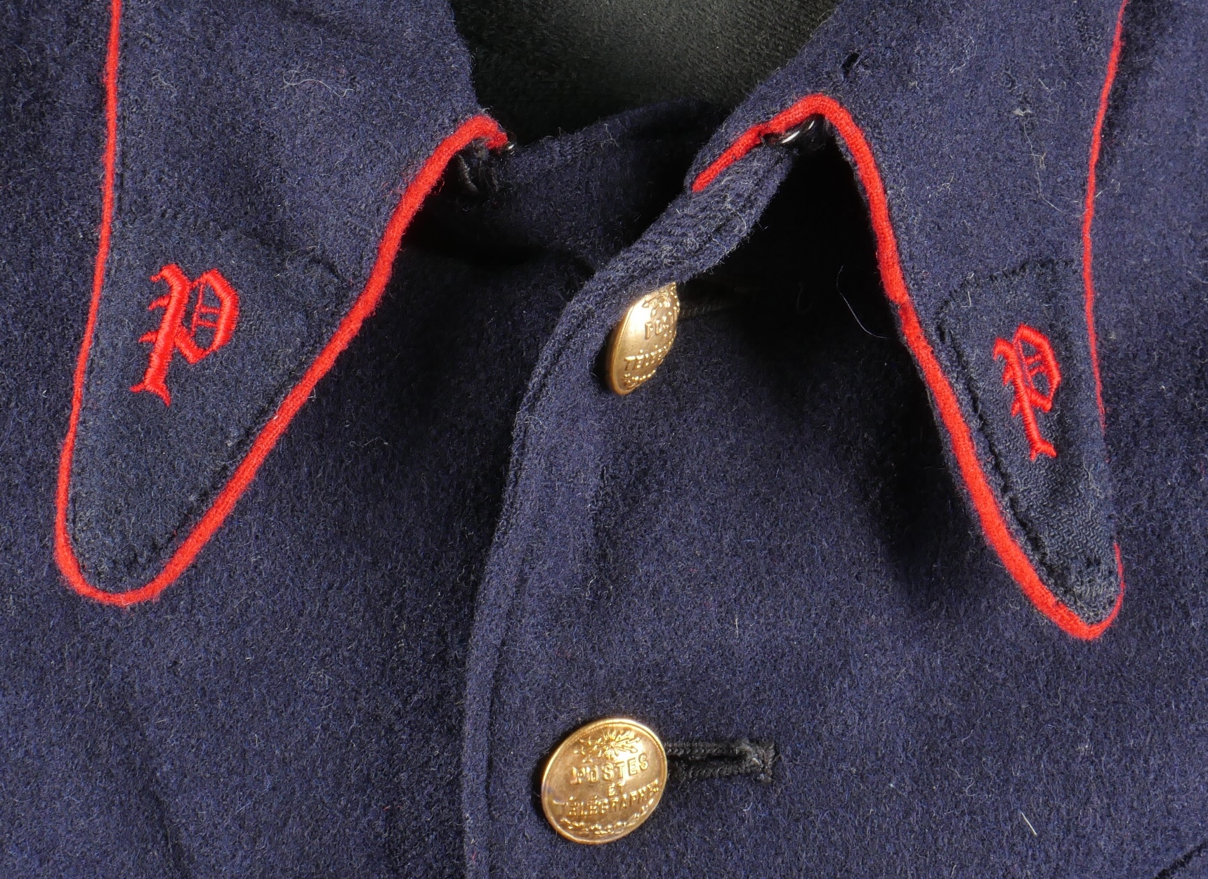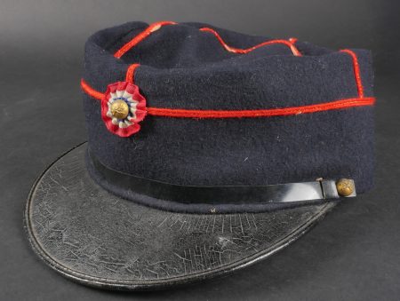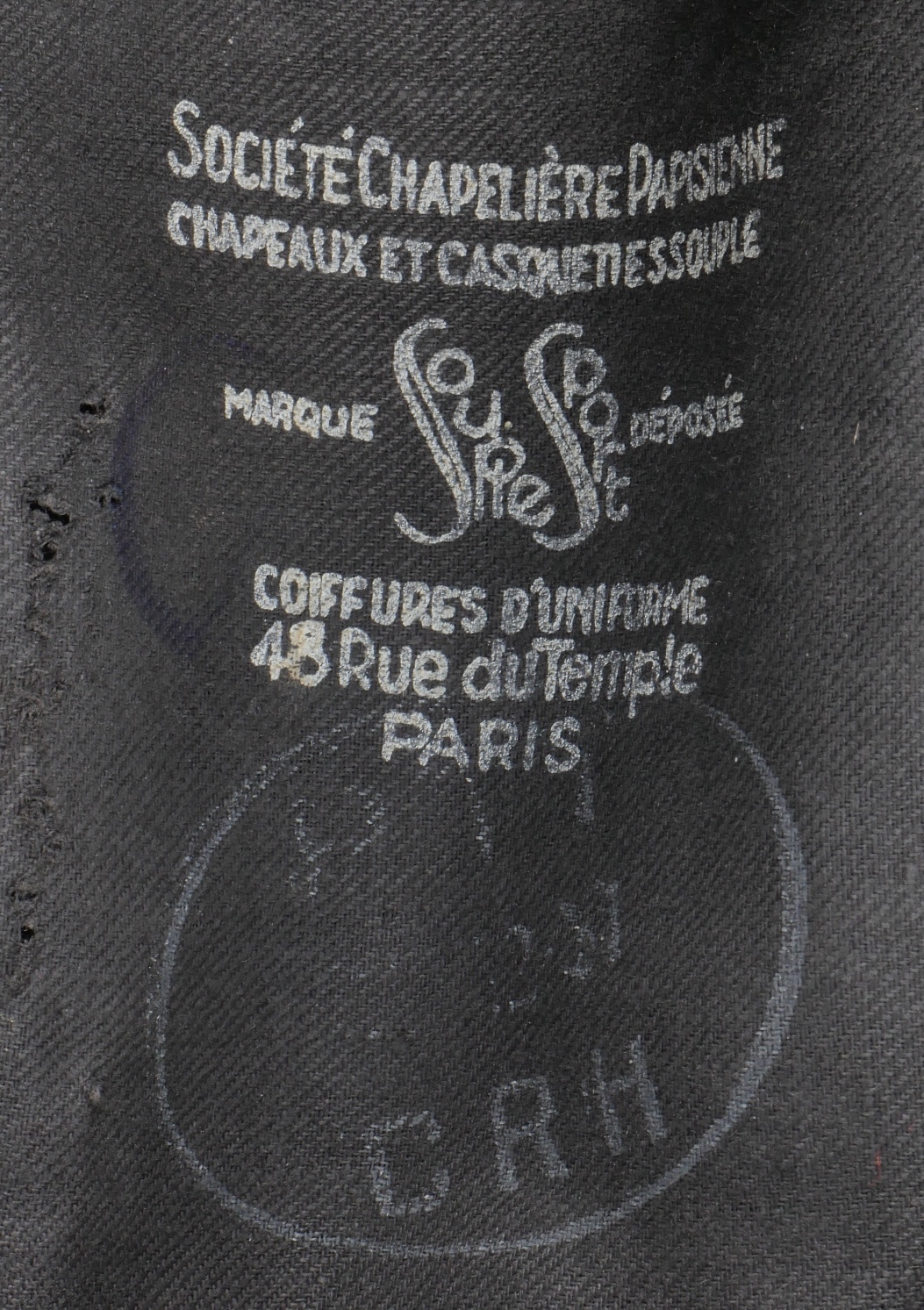 Lot d’uniformes. Comprenant une vareuse des PTT ainsi qu’un képi correspondant à cette fonction. Une vareuse d’officier d’artillerie en drap kaki de fabrication après guerre. Une culotte de cheval de fabrication armistice en drap côtelé, passants en trapèze. Une casquette de capitaine de corvette de la marine, plateau en drap bleu mité, insigne brodé en cannetille, visière cuir, étiquette du tailleur Jockey Club à Toulon, bandeau usagé. Lot of uniforms Including a postal service tunic with matching képi an artillery officer’s khaki wool tunic postwar manufacture a corduroy riding breeches armistice manufacture trapezoid loops a navy lieutenant commander’s cap with blue cloth top moth damage embroidered gold wire insignia leather visor tailor label Jockey Club Toulon worn band.