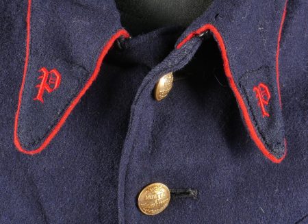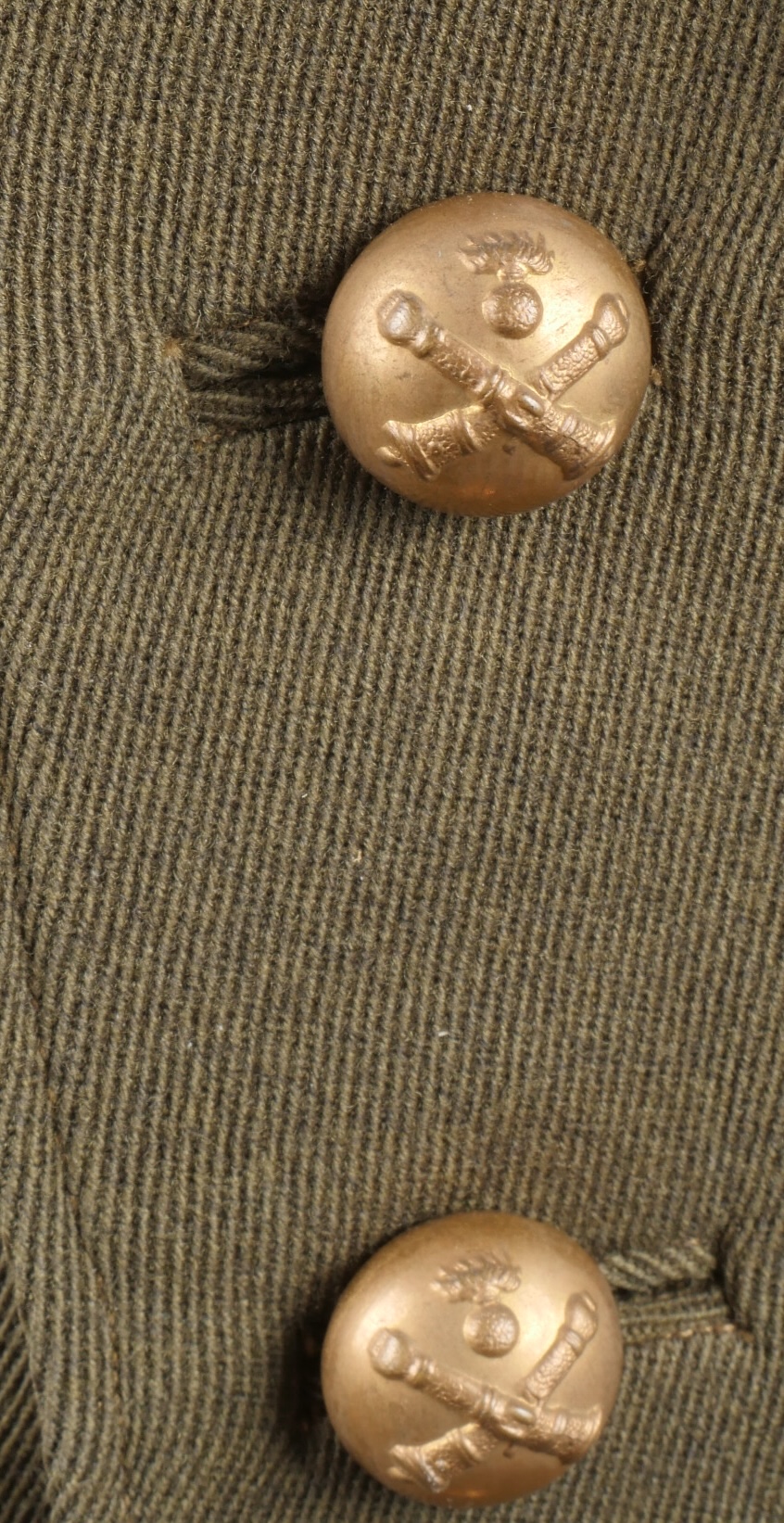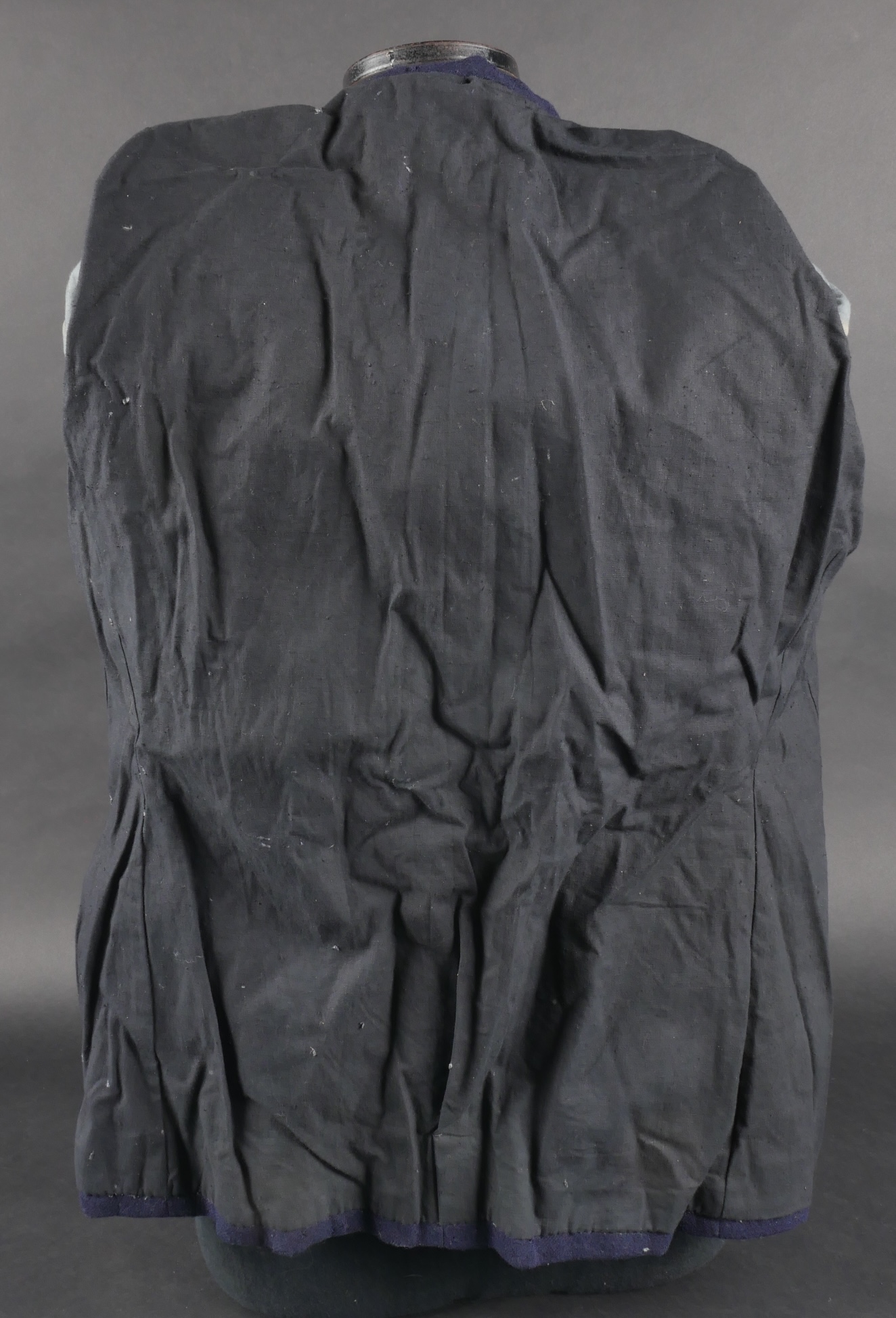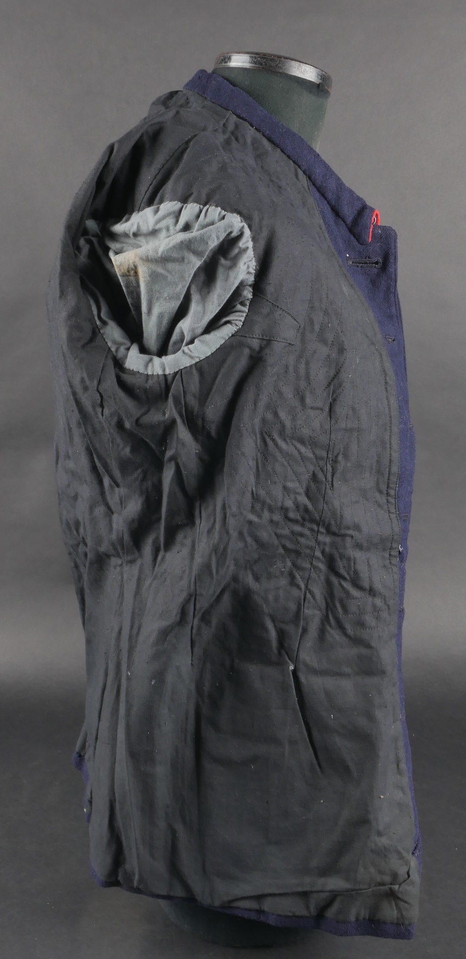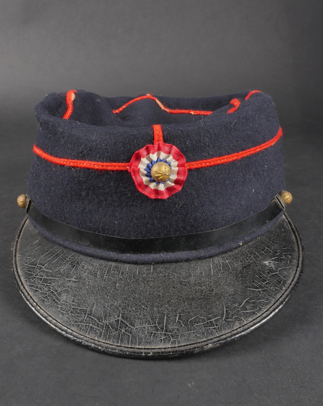 Lot d’uniformes. Comprenant une vareuse des PTT ainsi qu’un képi correspondant à cette fonction. Une vareuse d’officier d’artillerie en drap kaki de fabrication après guerre. Une culotte de cheval de fabrication armistice en drap côtelé, passants en trapèze. Une casquette de capitaine de corvette de la marine, plateau en drap bleu mité, insigne brodé en cannetille, visière cuir, étiquette du tailleur Jockey Club à Toulon, bandeau usagé. Lot of uniforms Including a postal service tunic with matching képi an artillery officer’s khaki wool tunic postwar manufacture a corduroy riding breeches armistice manufacture trapezoid loops a navy lieutenant commander’s cap with blue cloth top moth damage embroidered gold wire insignia leather visor tailor label Jockey Club Toulon worn band.
