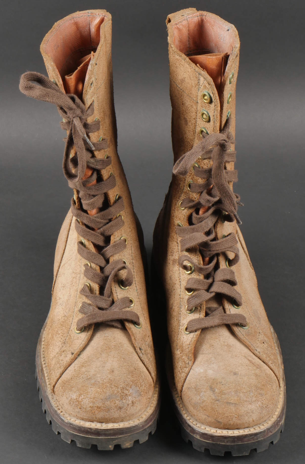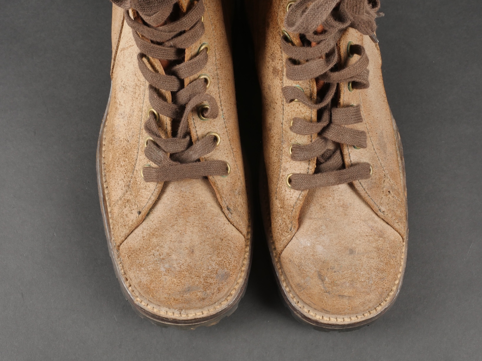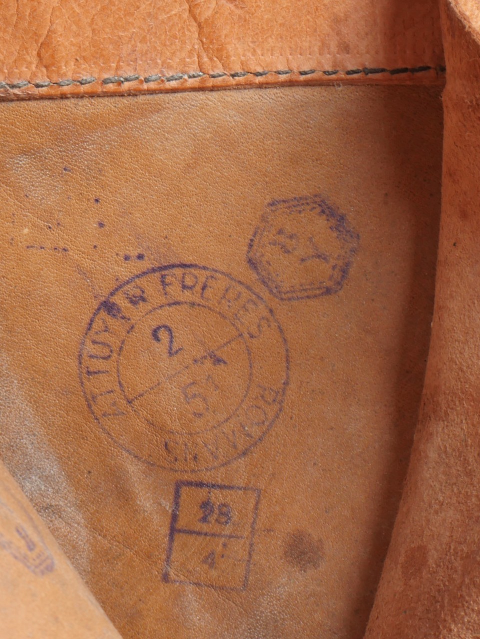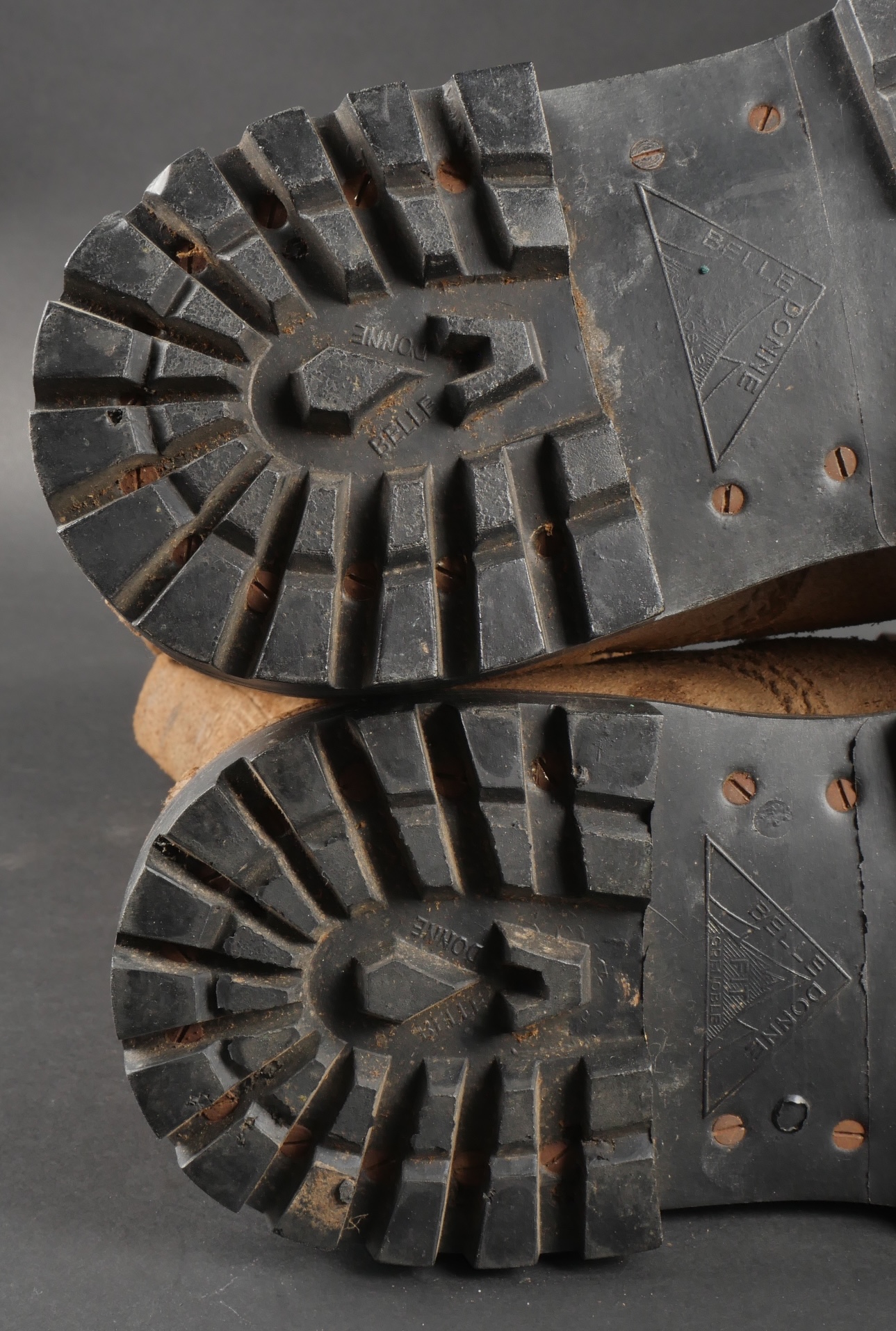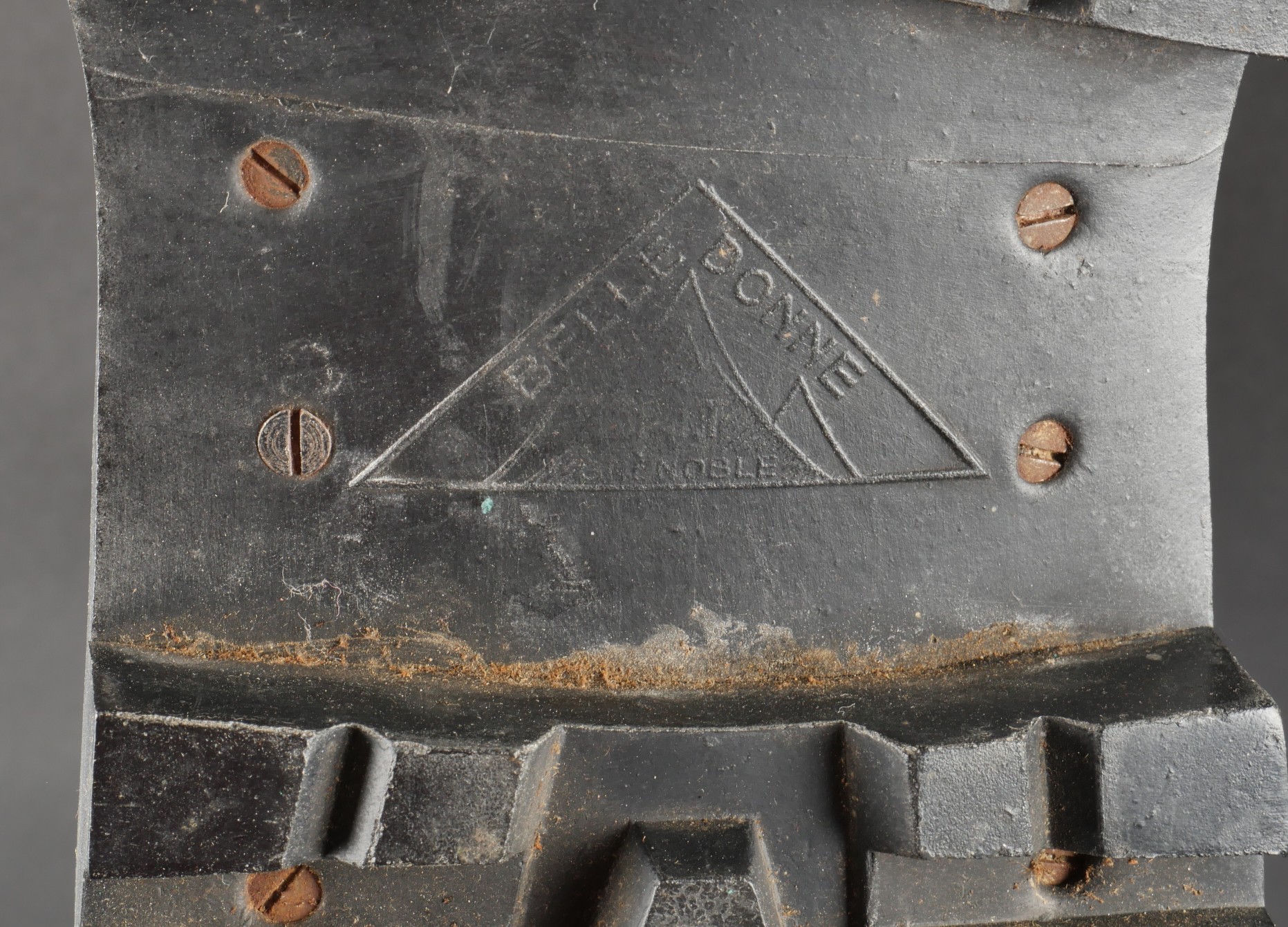 Paire de bottes de saut TAP 50 datées 1951. Semelle caoutchouc vissée de marque Belledonne Fit. Languette possédant un tampon de réception indiquant l’année 1951. Tampons sur la semelle... en savoir plus