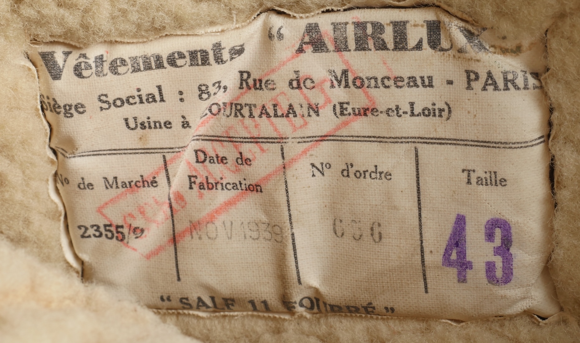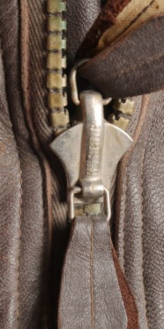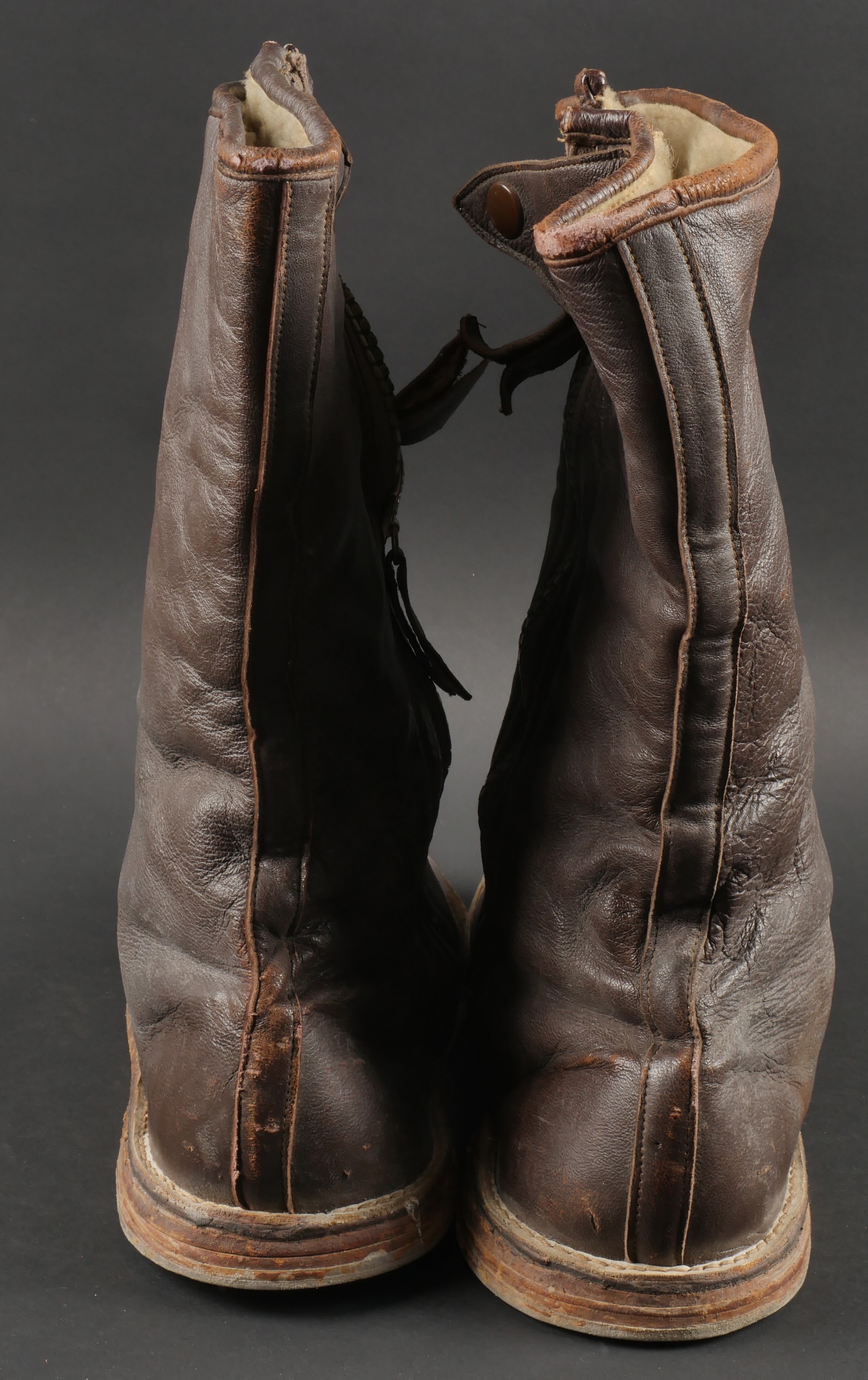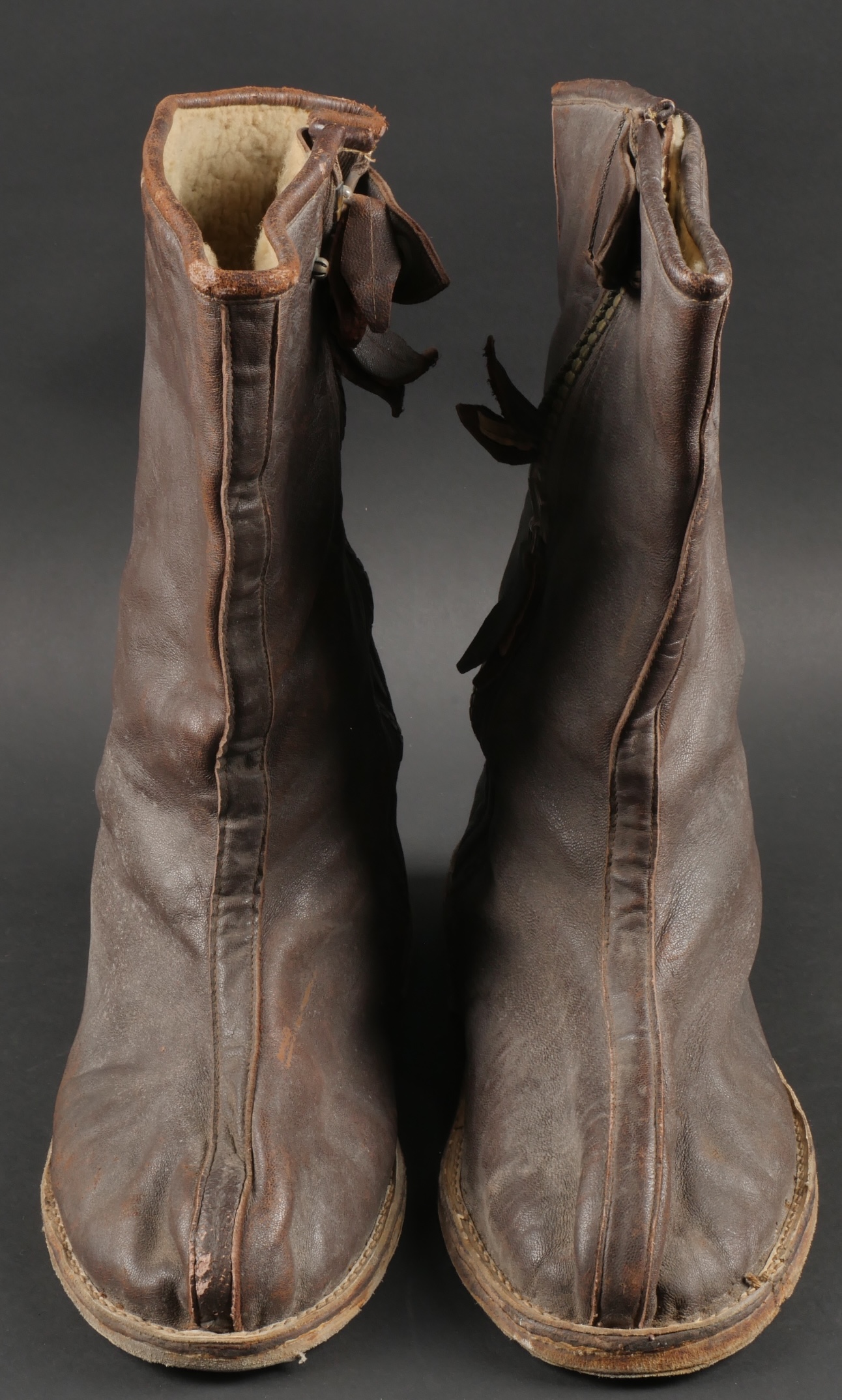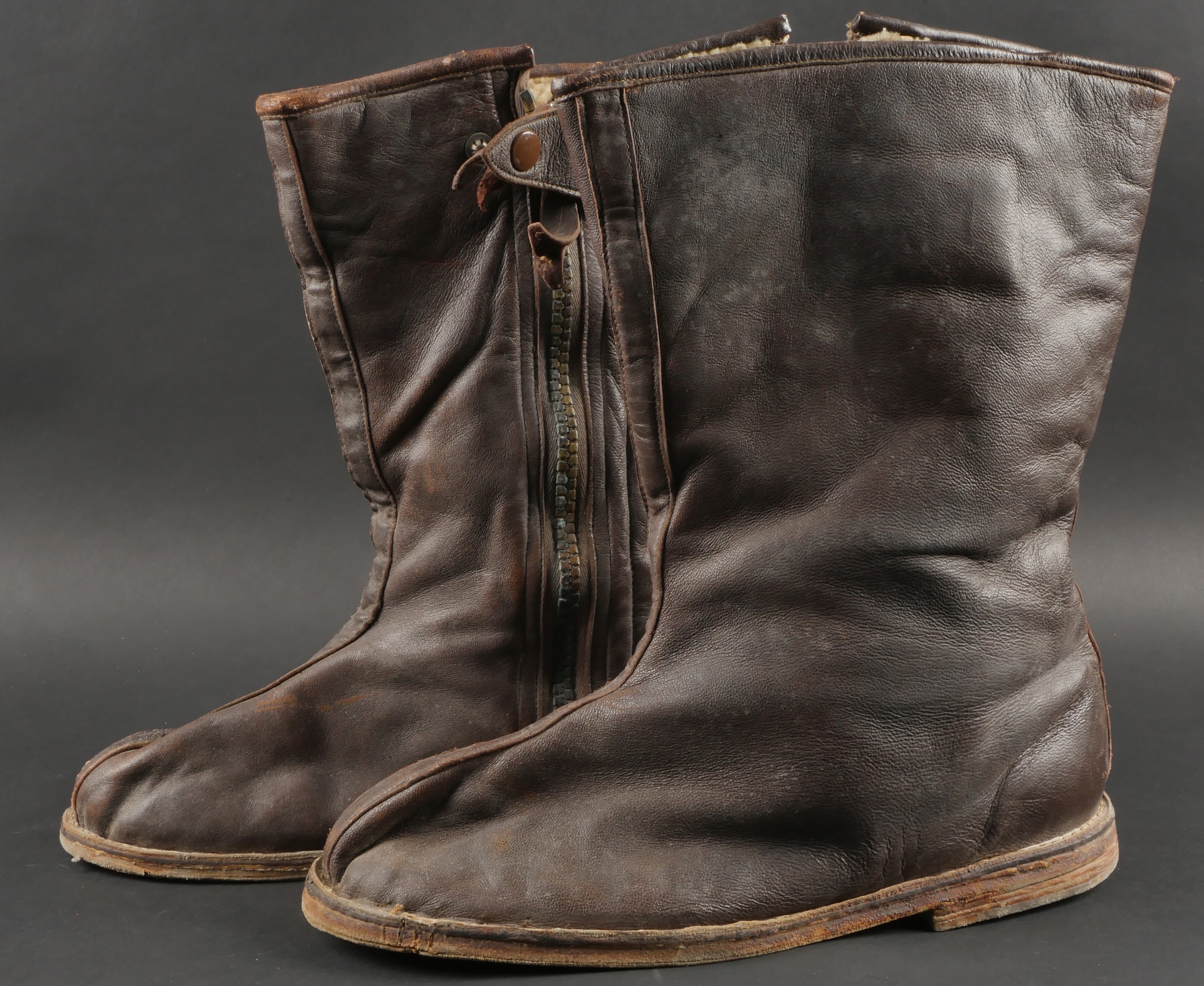 Paire de bottes de vol fourrées Airlux. En cuir marron fourré de peau de mouton, fermetures éclaires brevetés SGDG grippées. Pattes de serrage à pressions en haut de chaque botte, semelles... en savoir plus