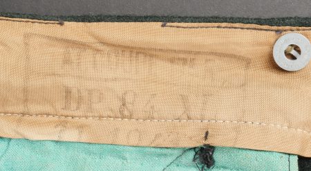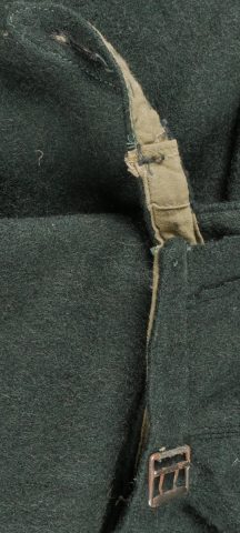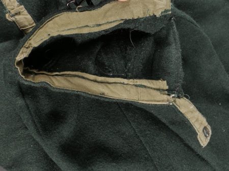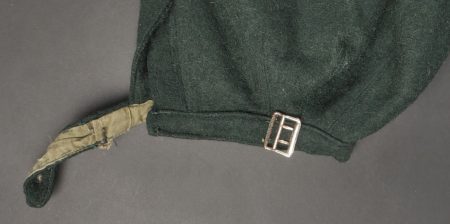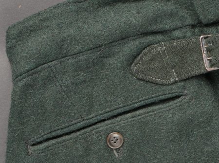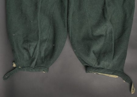 Pantalon Chantiers de Jeunesse. Pantalon de jeune en drap vert forêt, pattes de serrage au bas de chaque jambe, passants en trapèze. Doublure en rayonne de type armistice et coton, martingale... en savoir plus