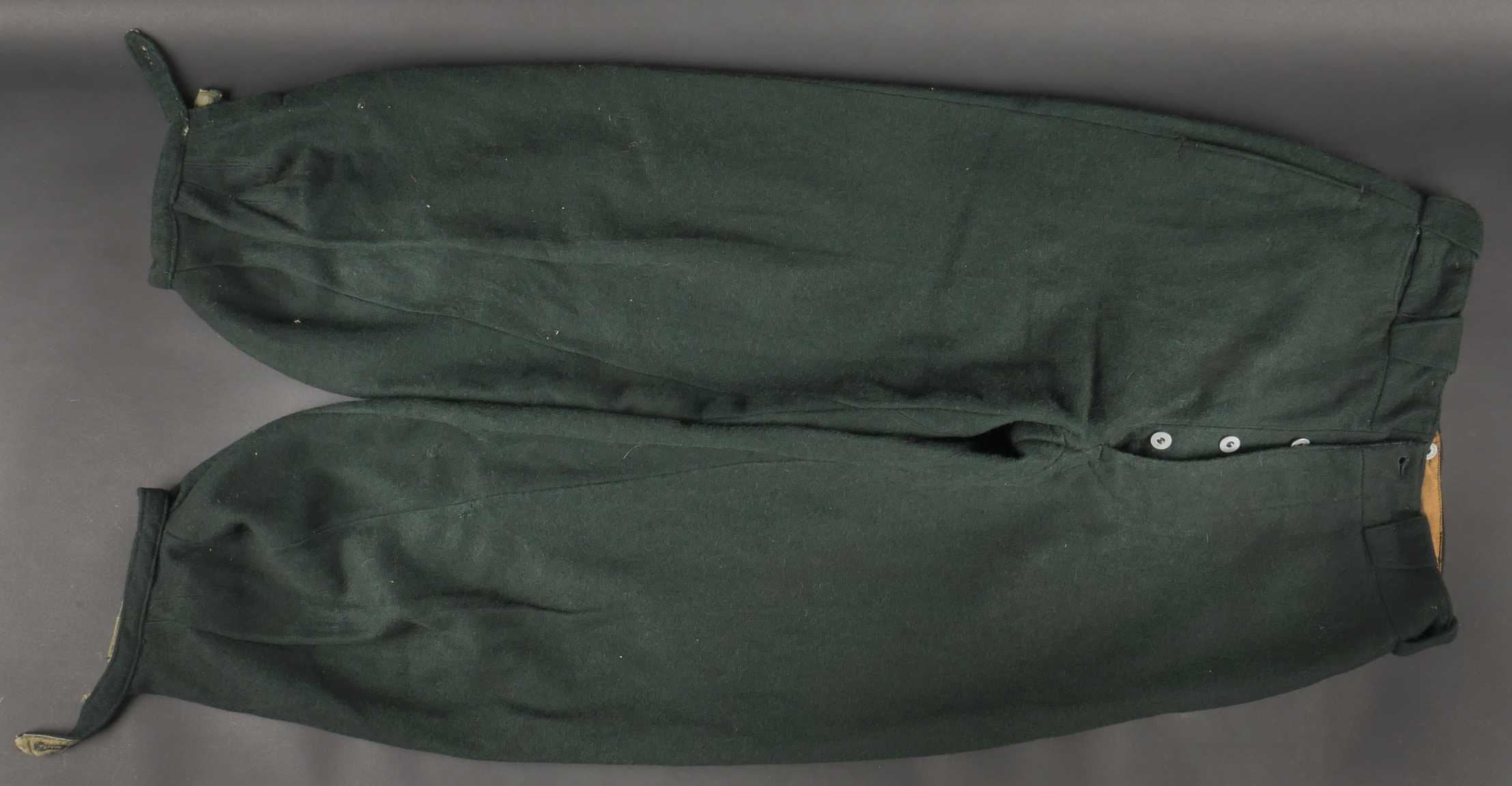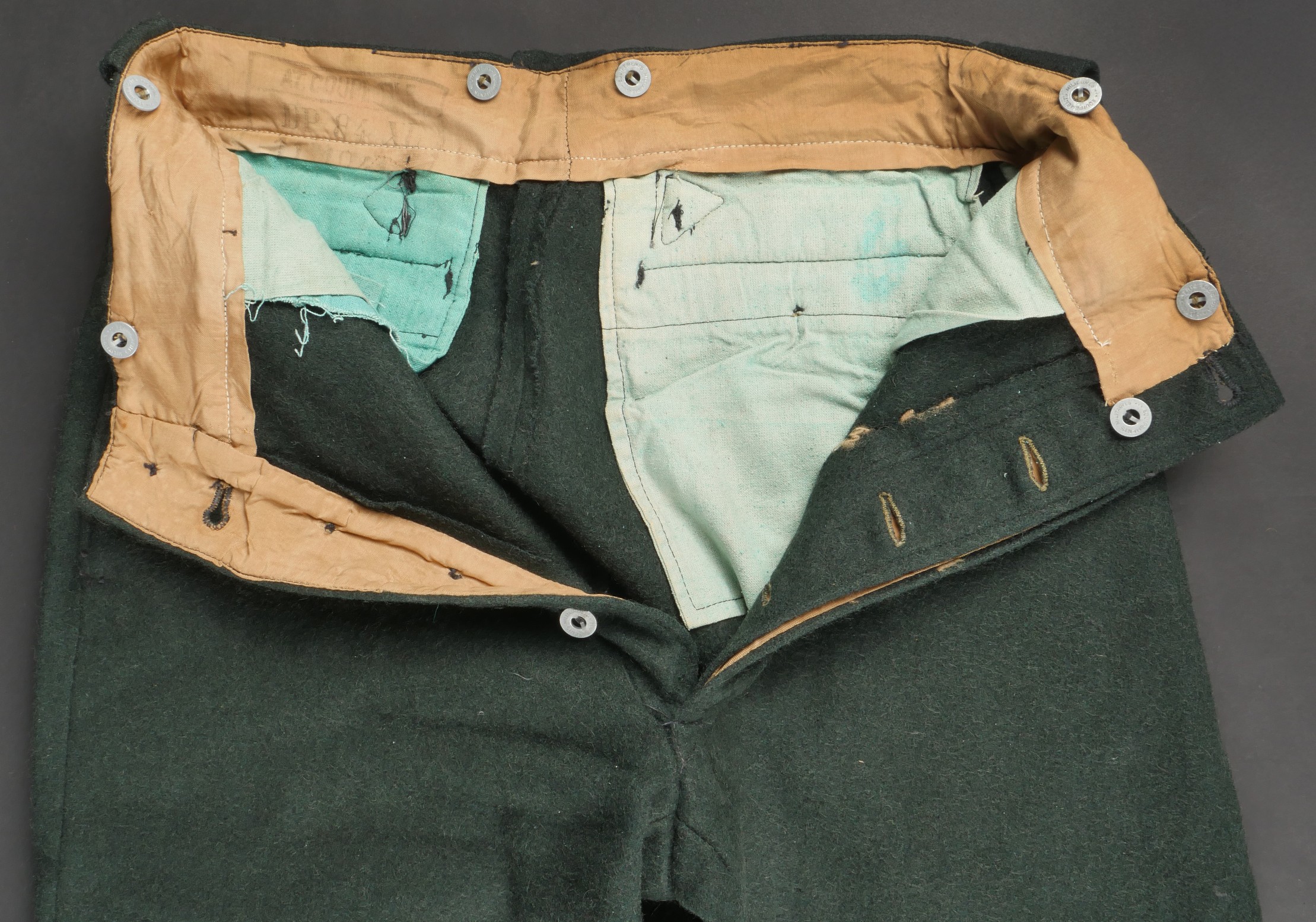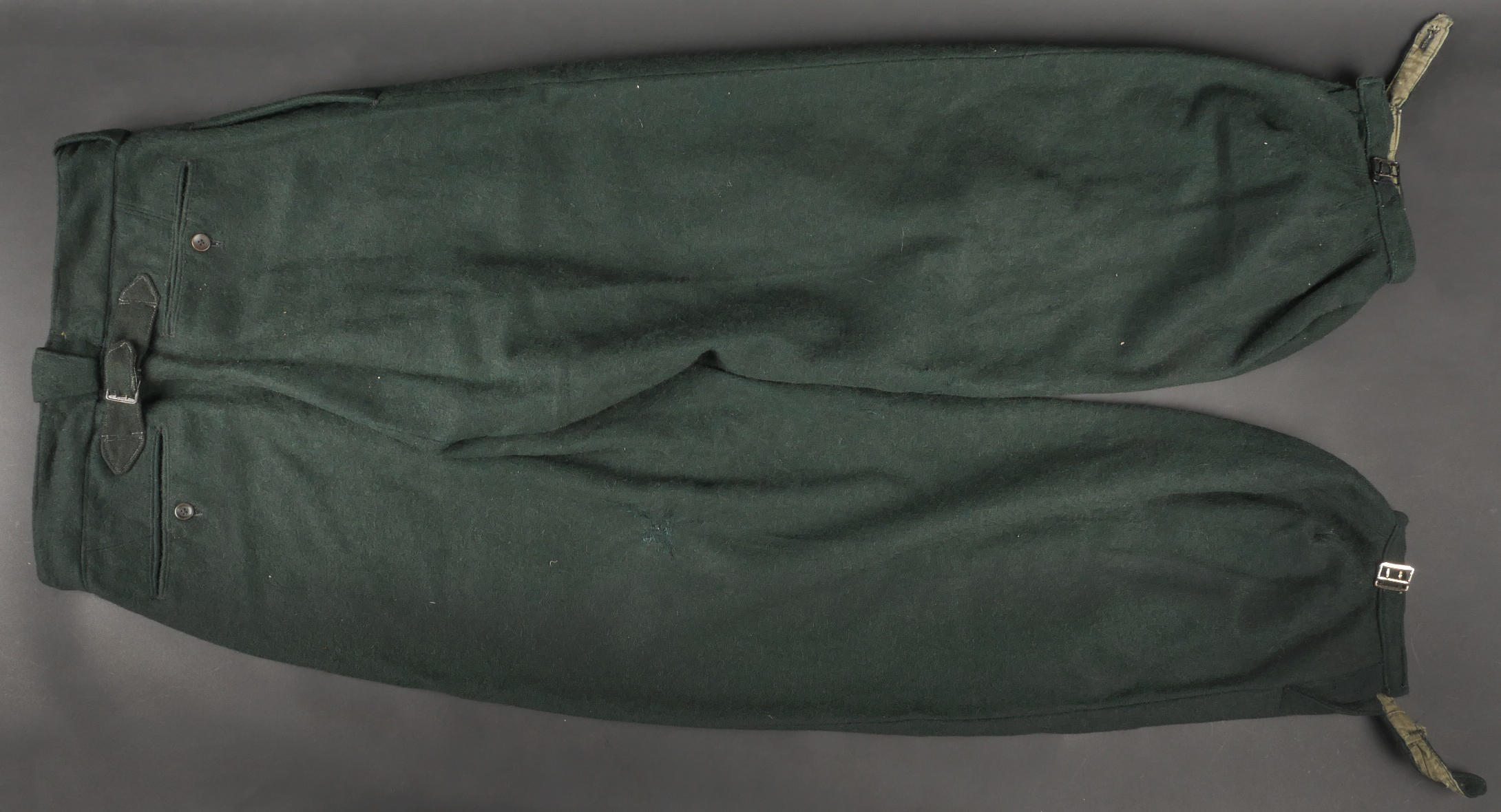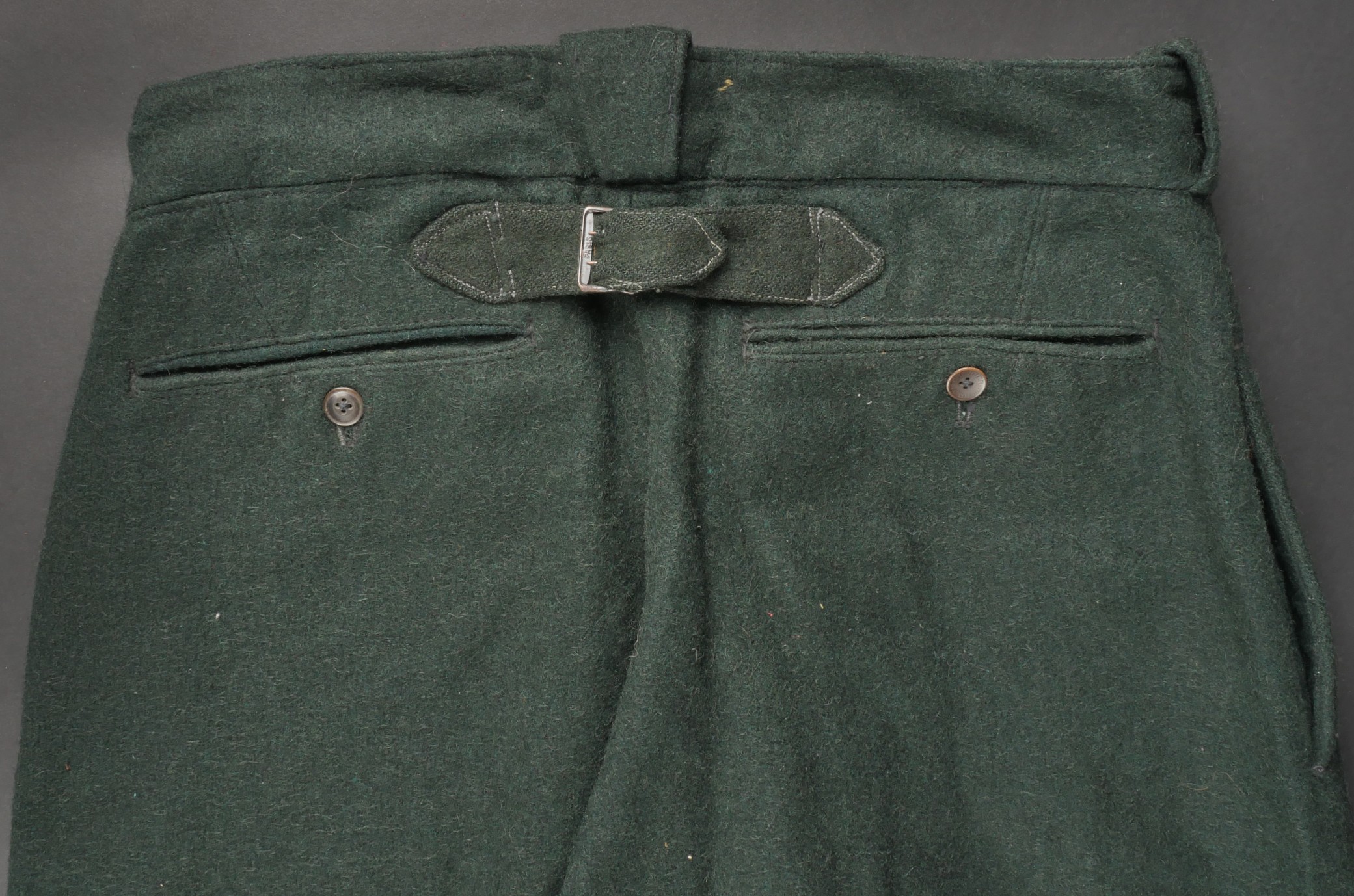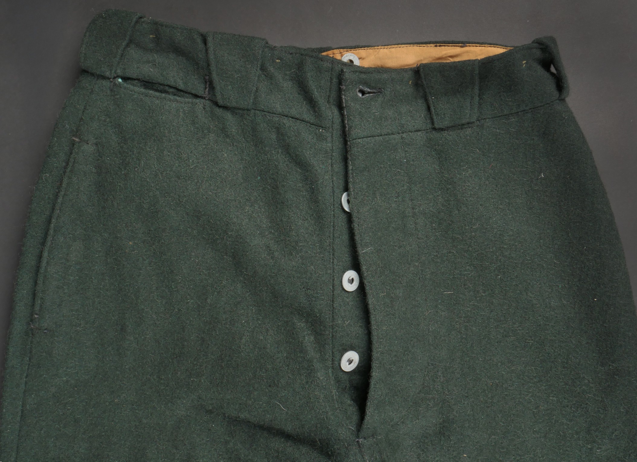 Pantalon Chantiers de Jeunesse. Pantalon de jeune en drap vert forêt, pattes de serrage au bas de chaque jambe, passants en trapèze. Doublure en rayonne de type armistice et coton, martingale... en savoir plus