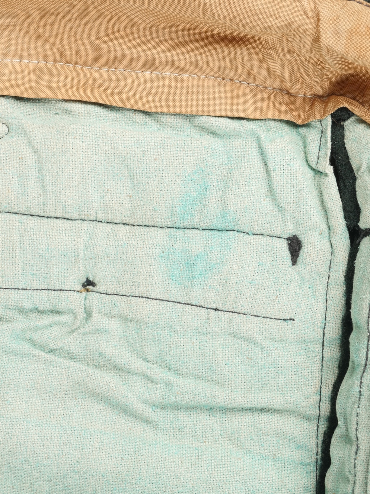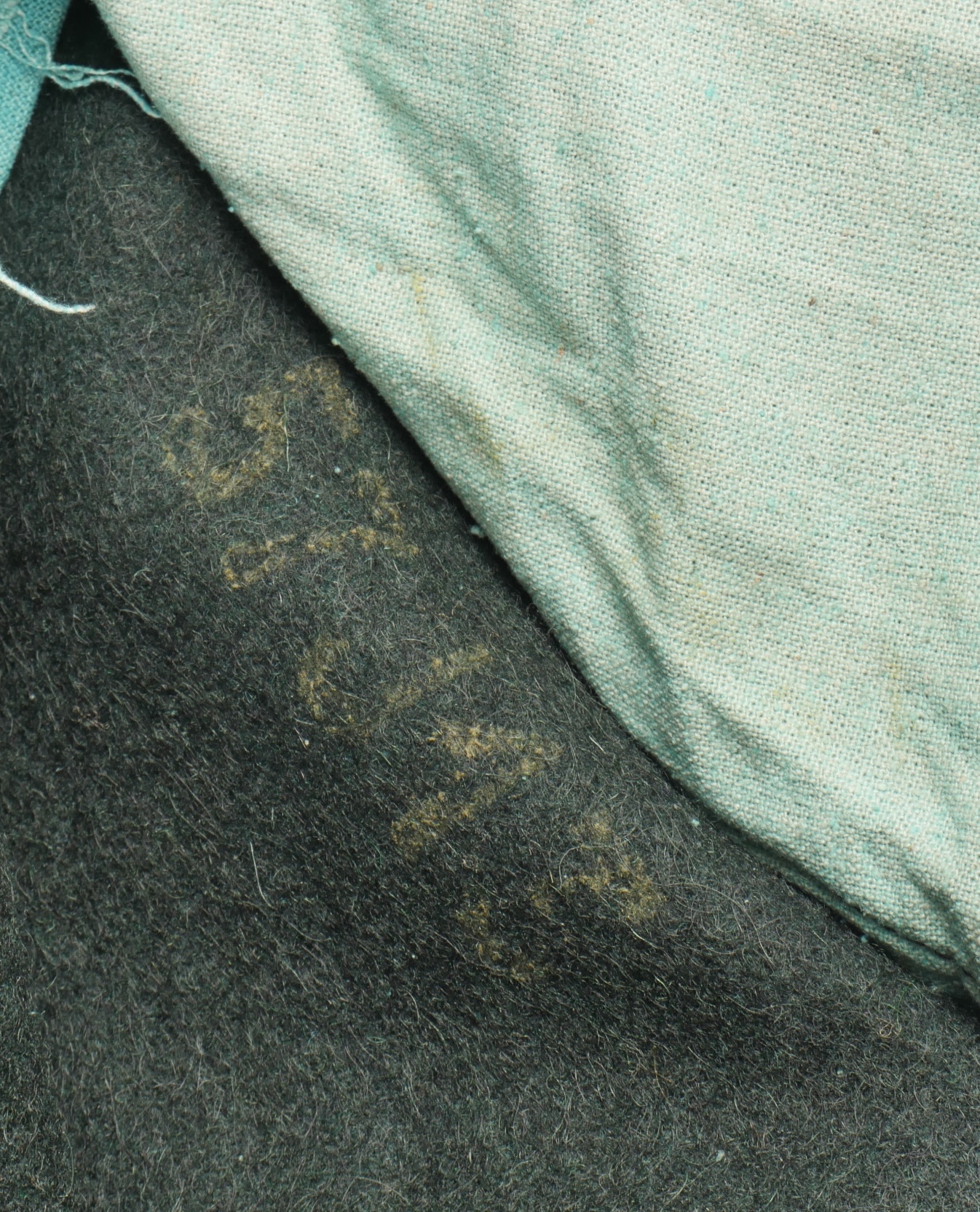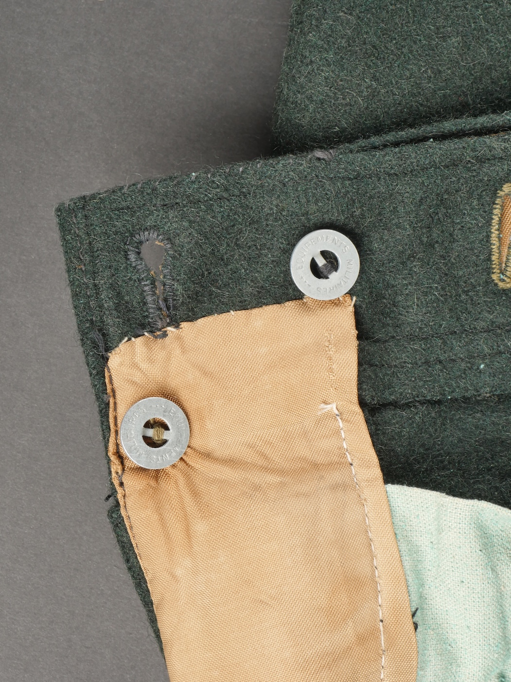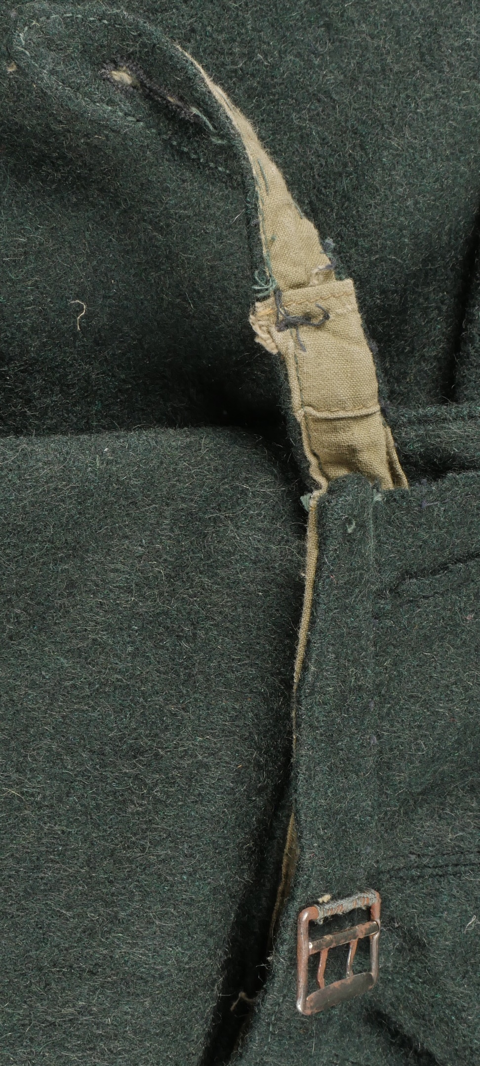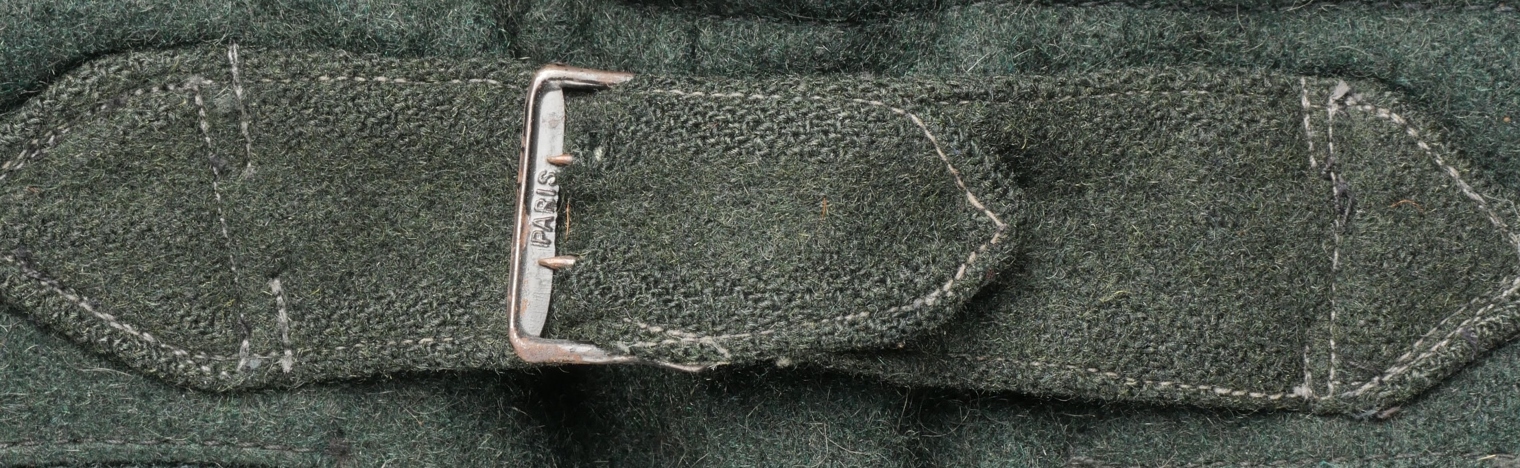 Pantalon Chantiers de Jeunesse. Pantalon de jeune en drap vert forêt, pattes de serrage au bas de chaque jambe, passants en trapèze. Doublure en rayonne de type armistice et coton, martingale... en savoir plus