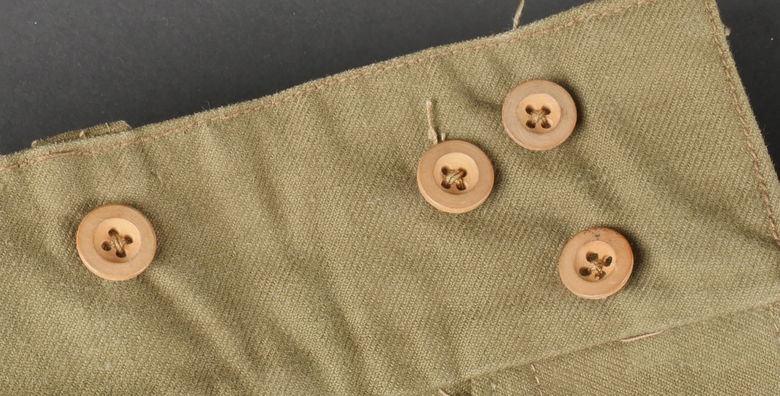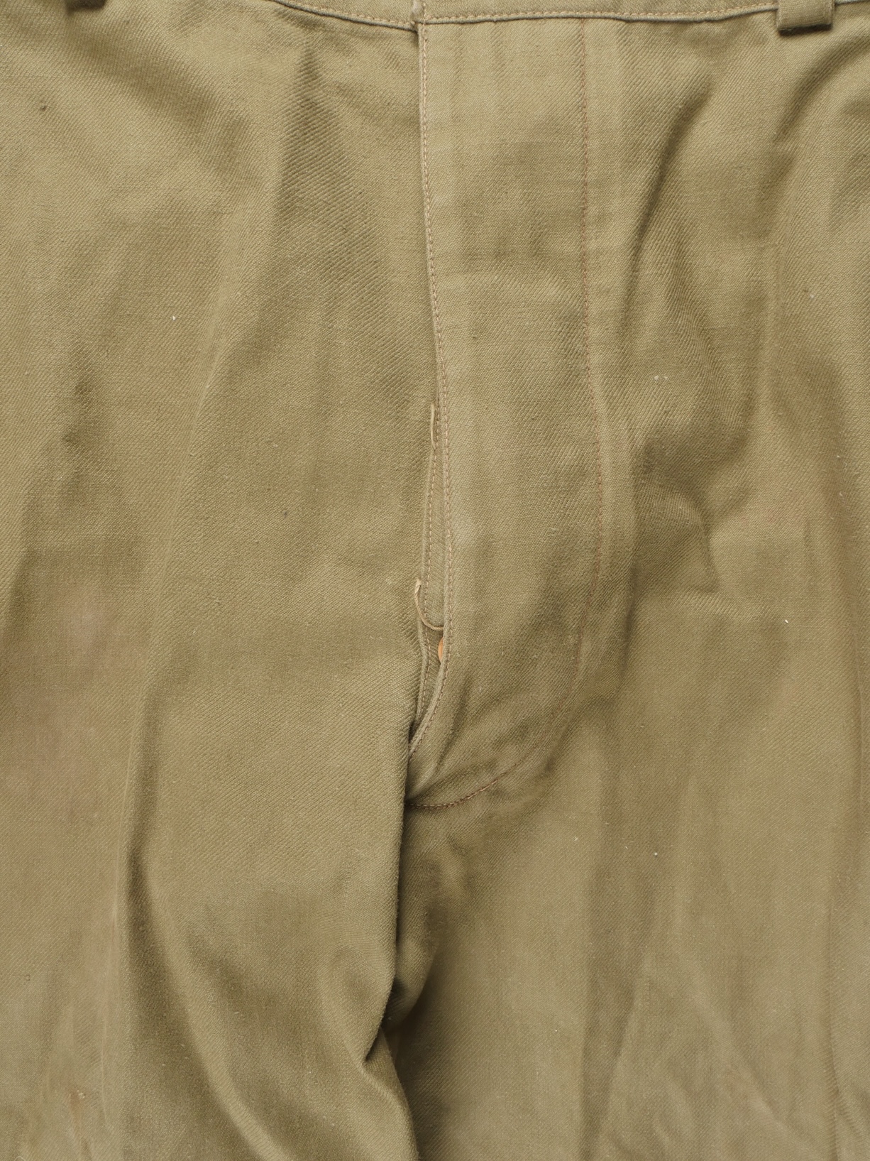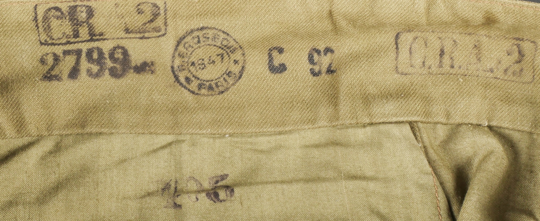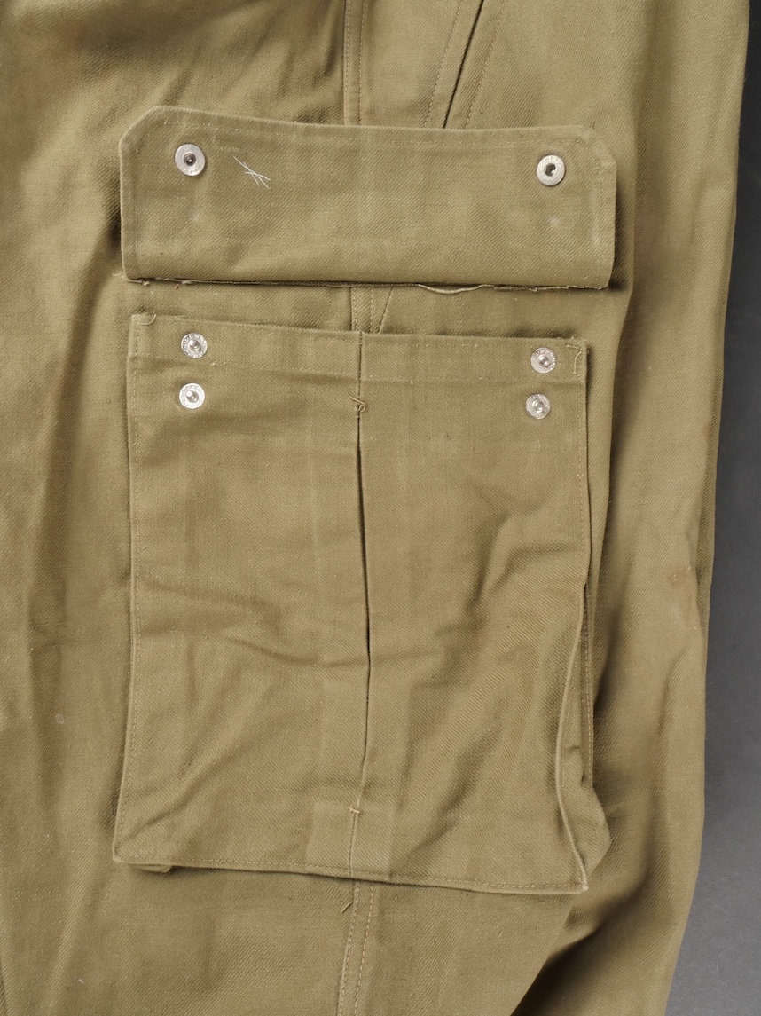 Beau pantalon TAP 47 confectionné en toile kaki, pressions du petit modèle fonctionnelles, en peinture d’origine, fermeture éclair de marque Eclair. Tampons d’un fabricant Parisien... en savoir plus