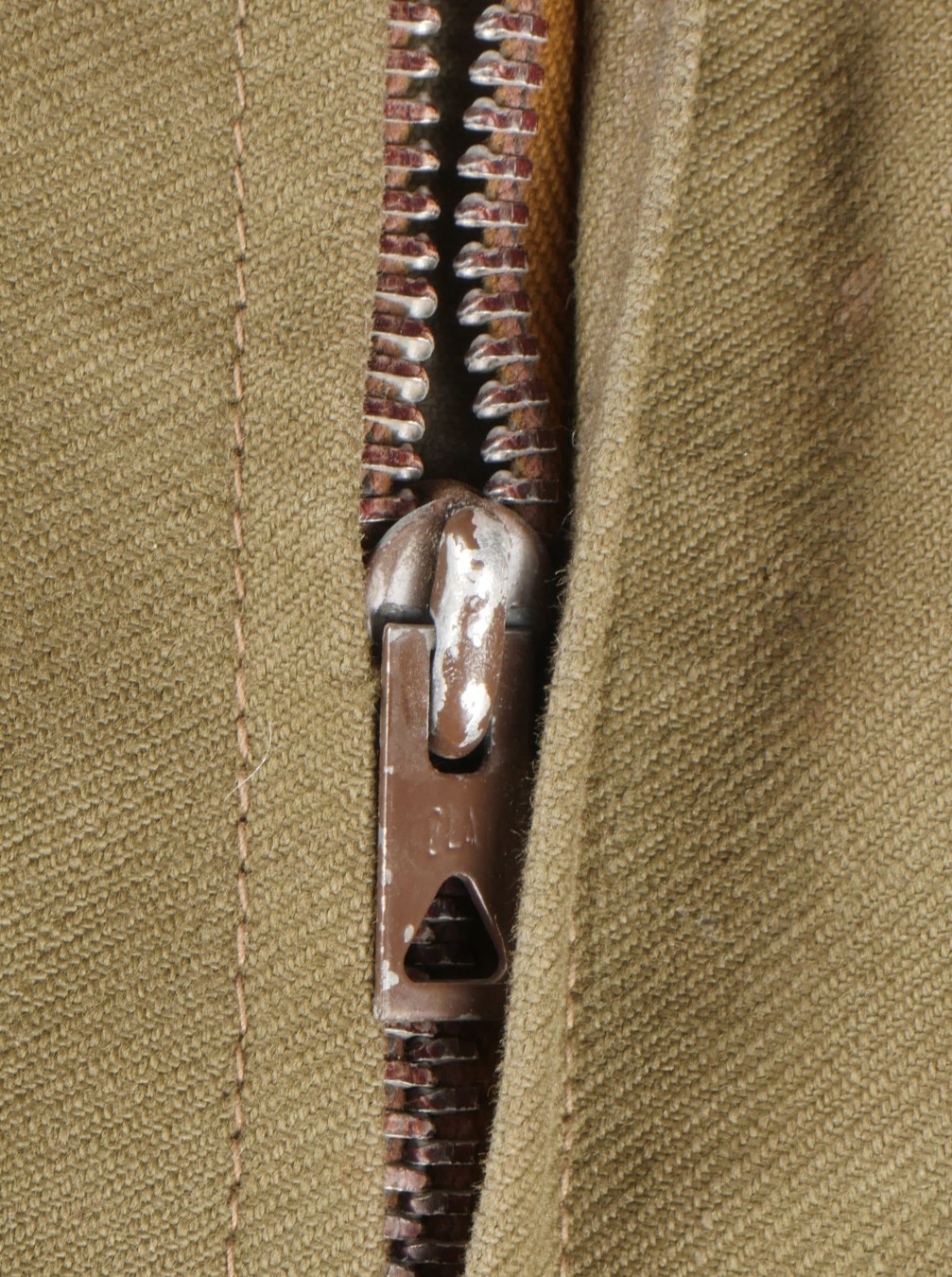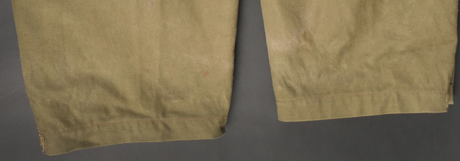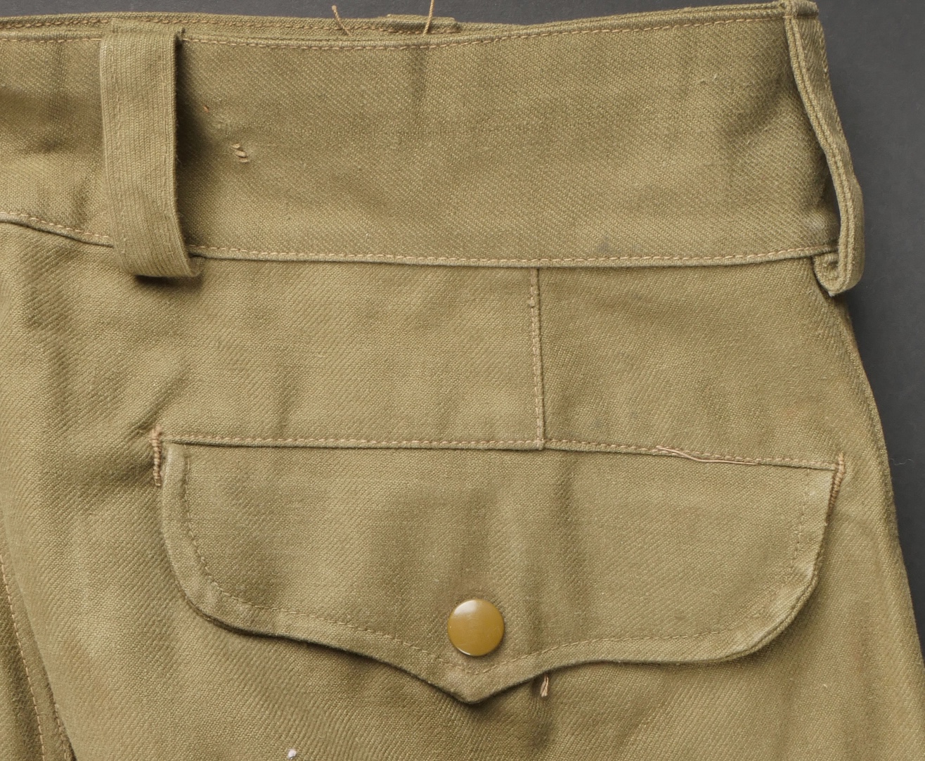 Beau pantalon TAP 47 confectionné en toile kaki, pressions du petit modèle fonctionnelles, en peinture d’origine, fermeture éclair de marque Eclair. Tampons d’un fabricant Parisien... en savoir plus