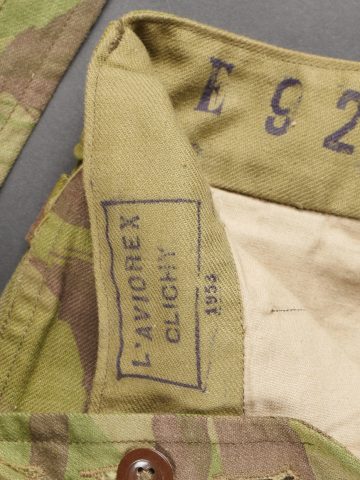 Pantalon TAP 4752. Pantalon fabriqué entièrement en tissu camouflé 4752, tampon de fabricant présent au niveau de la taille L’aviorex Clichy , daté 1953, ainsi que le tampon de taille... en savoir plus