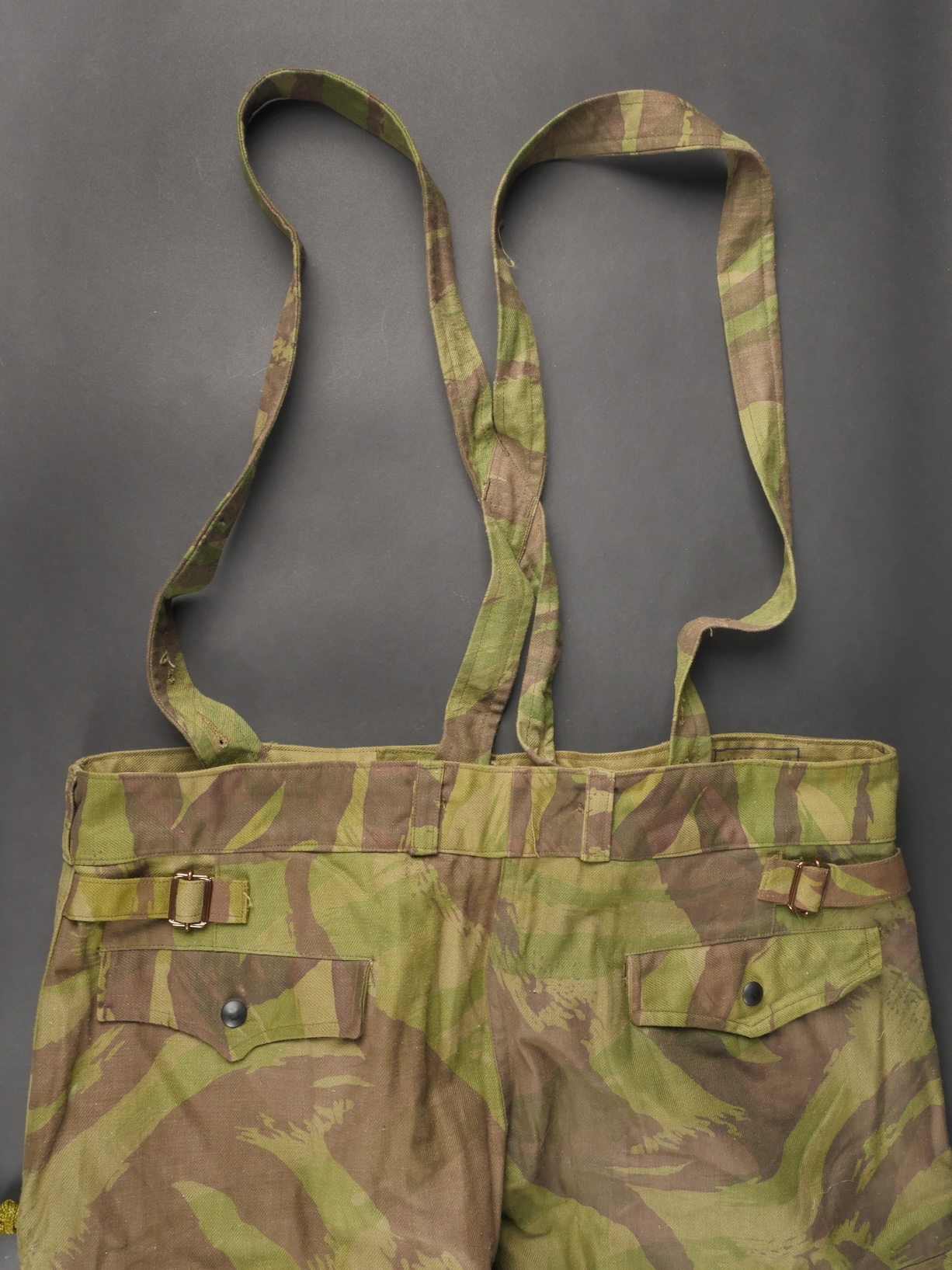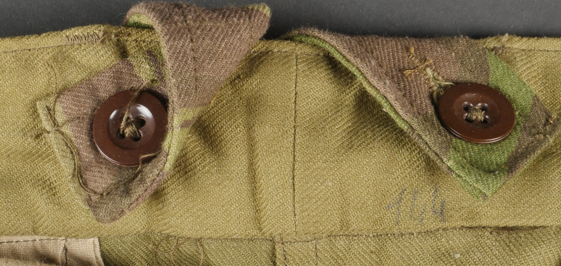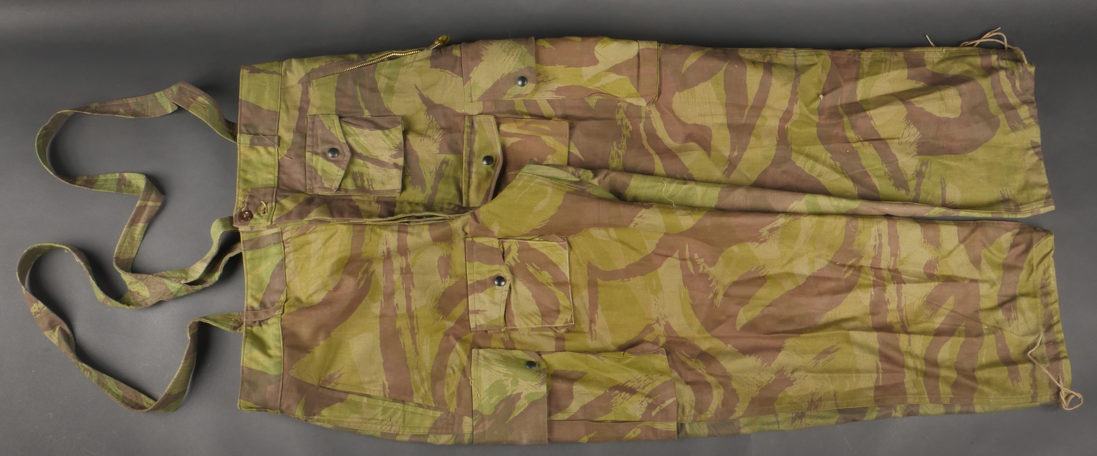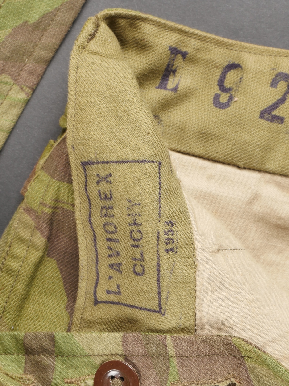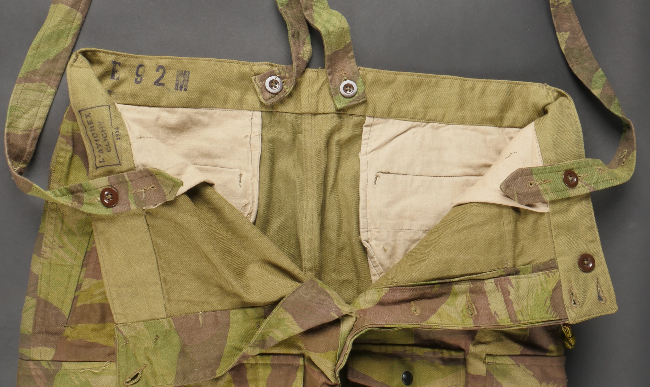 Pantalon TAP 4752. Pantalon fabriqué entièrement en tissu camouflé 4752, tampon de fabricant présent au niveau de la taille L’aviorex Clichy , daté 1953, ainsi que le tampon de taille... en savoir plus